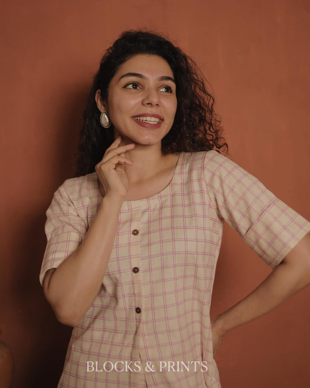 Top - Flex Cotton Checked A-line kurthi with Round Neck. Button in front for detailing. Slit in front portion..