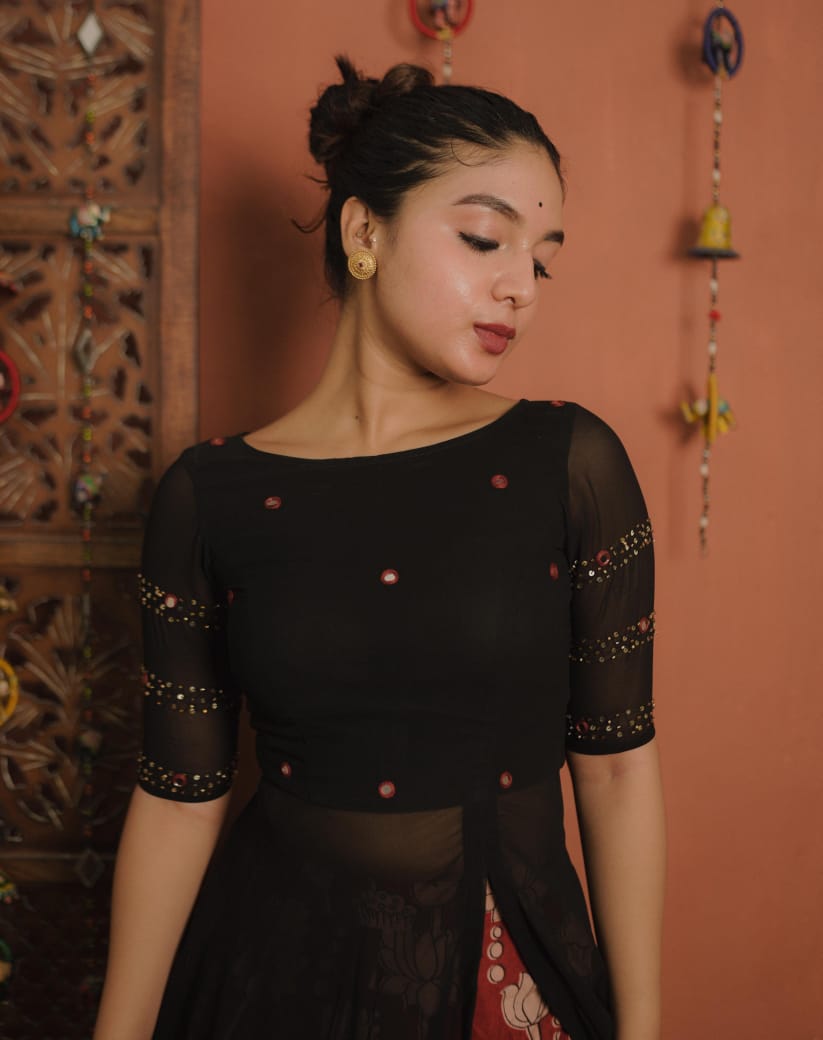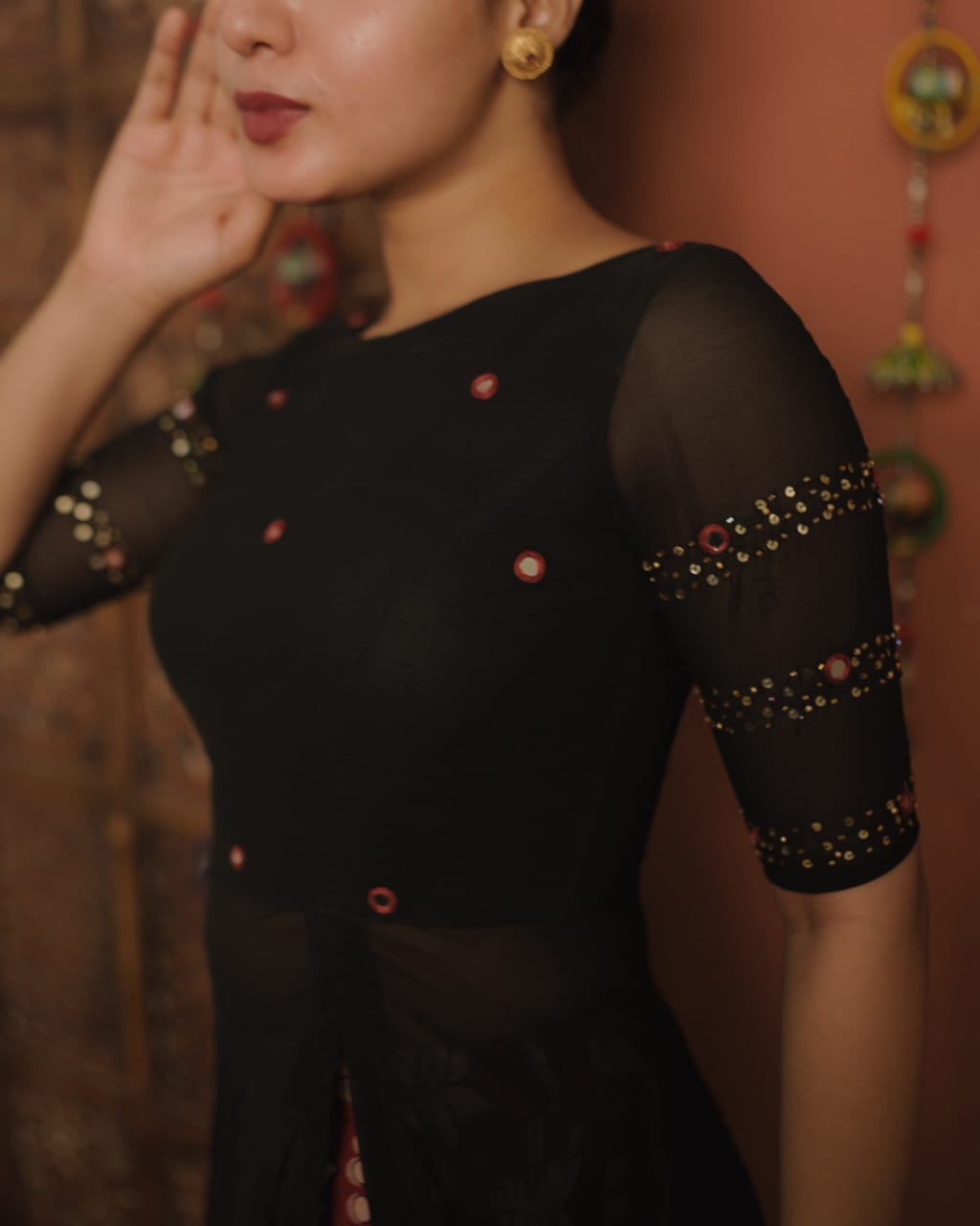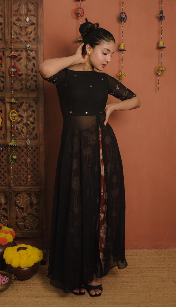 Top :- Georgette kurthi with Boat Neck. Slit on One side with half lining. Heavy handwork on Sleeves and Mirror work on Yoke for detailing.