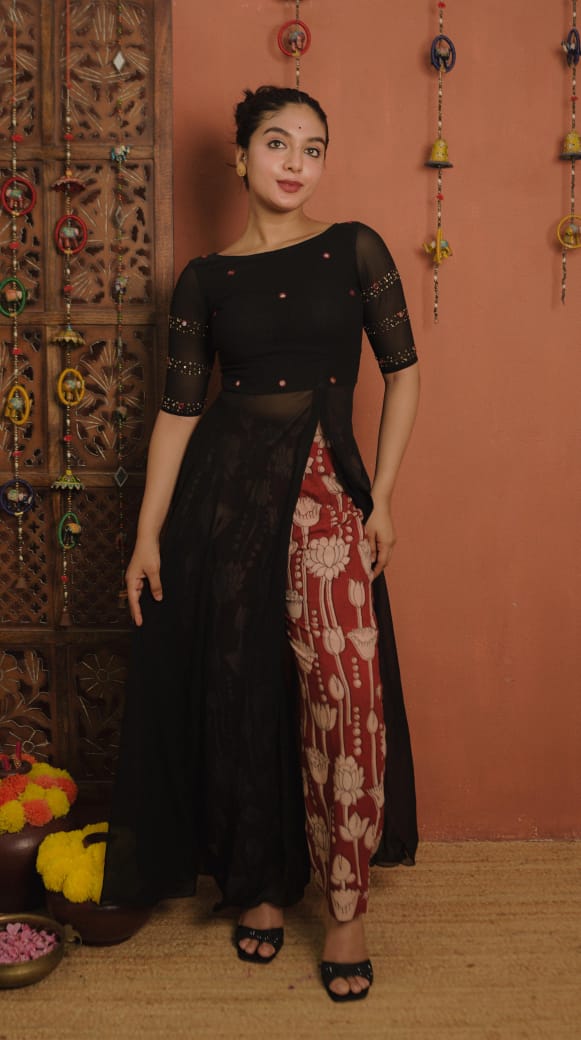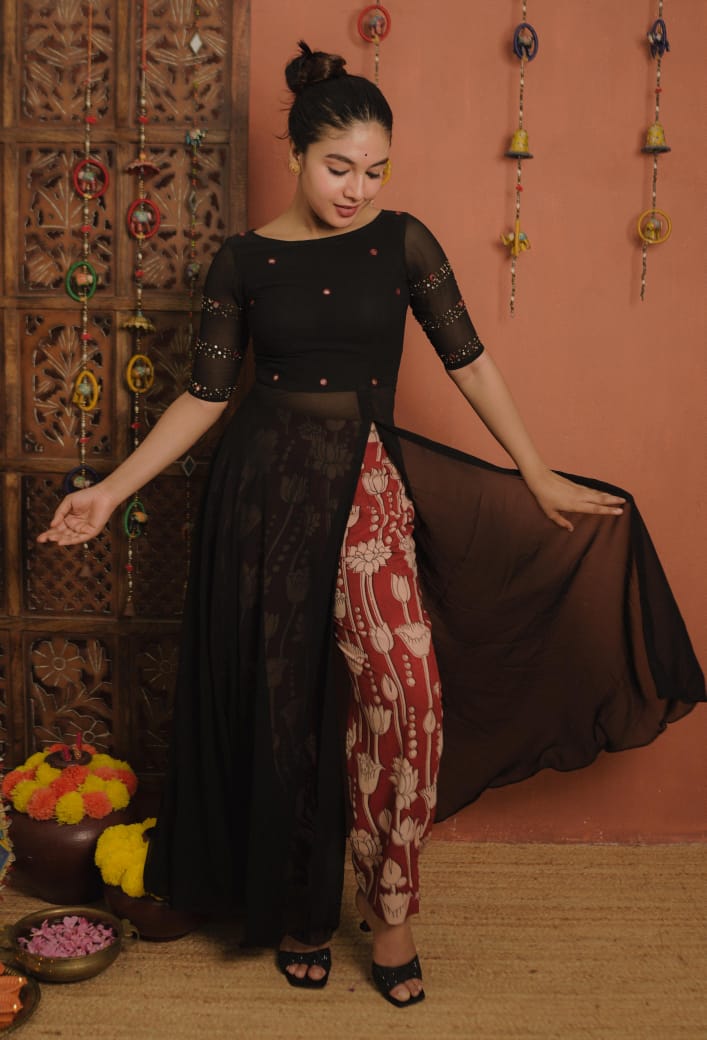 Bottom :- Kalamkari print on modal silk . Straight pants