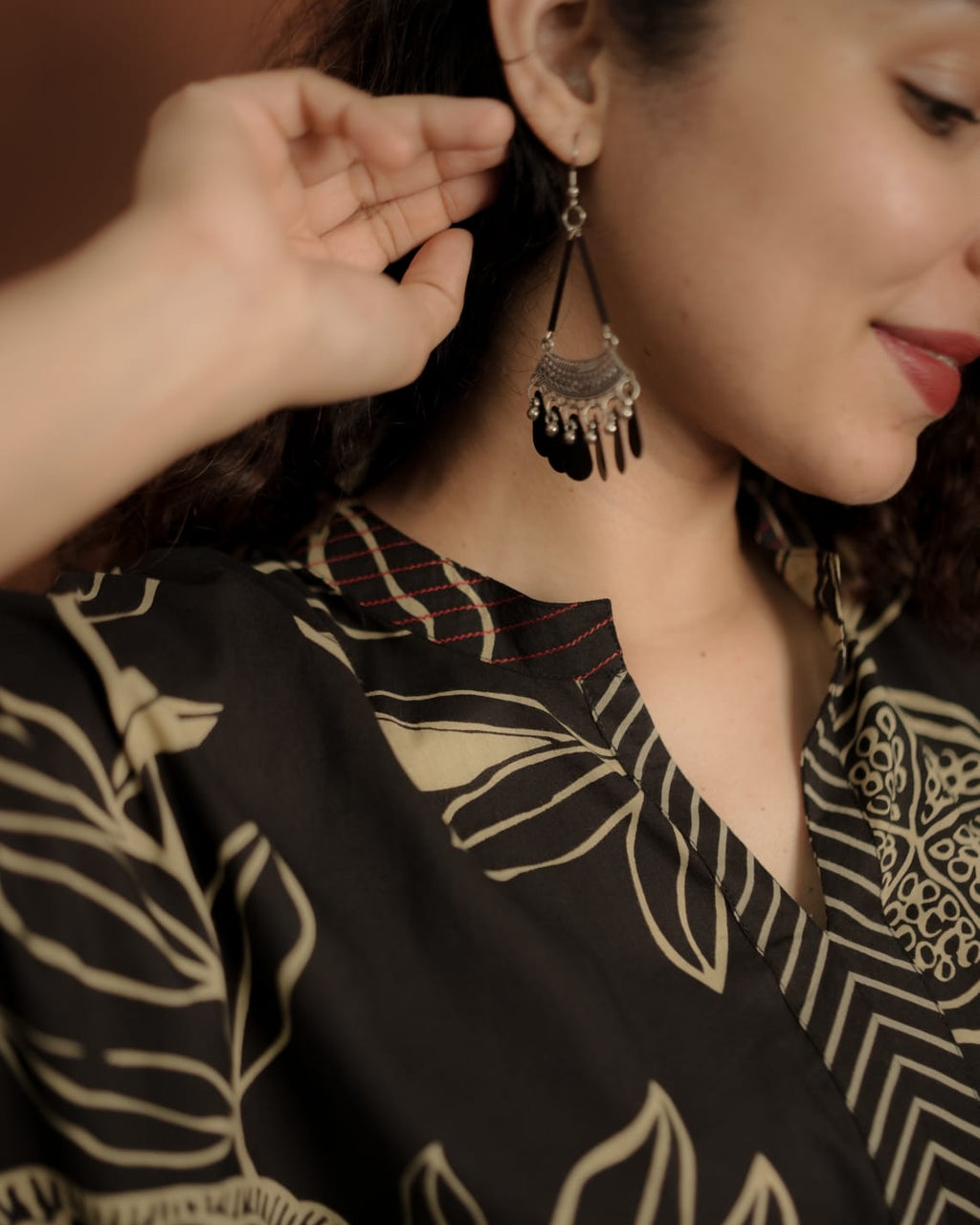 Top - Floral Printed Cotton Kaftan with Collar Neck, Running stitch at the Collar. Printed patch at the neck and the yoke portion. Embroidery Tazzles at the end of the both side. (Free Size top)