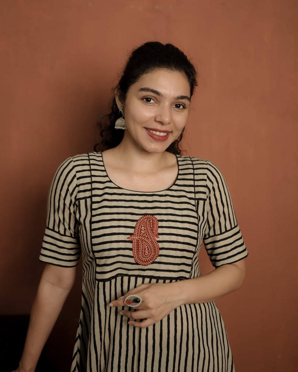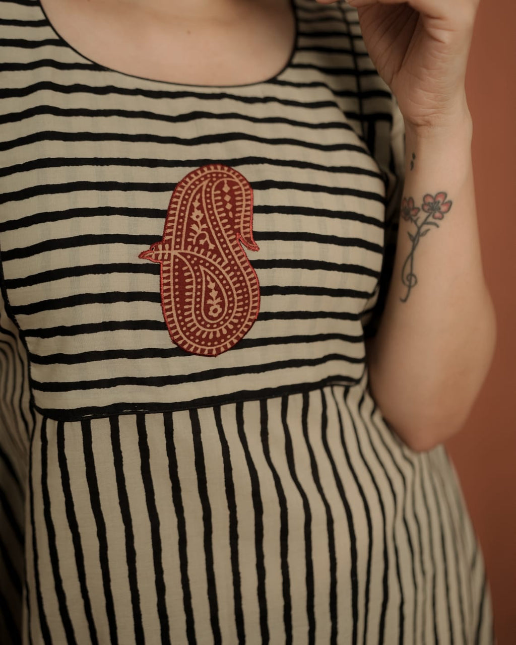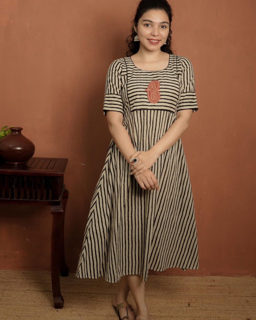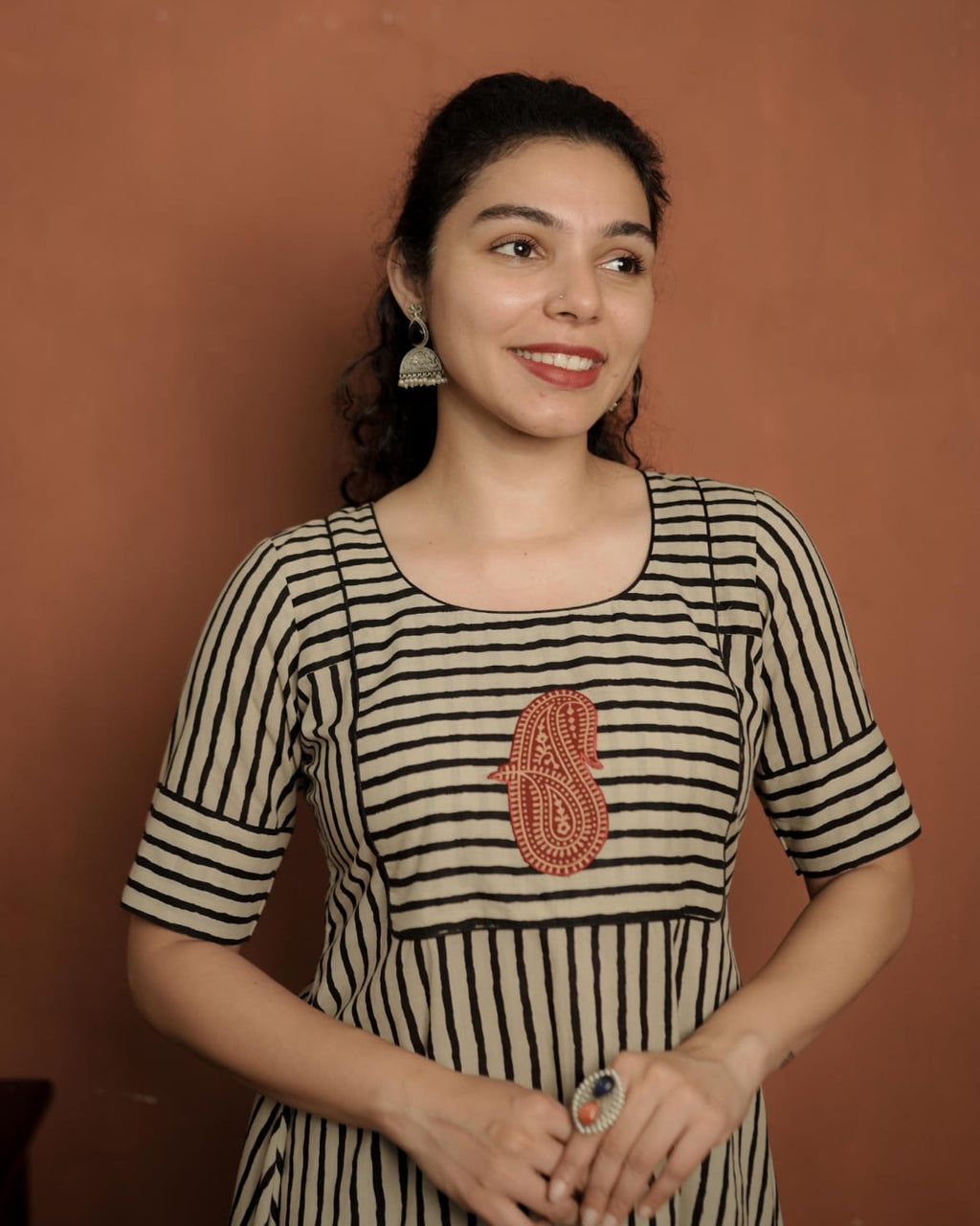 Stripe printed cotton A-Line dress with round neck. Assymetric yoke with Embroidery Ajrakh Applique work. Piping on Neck and Yoke for detailing.