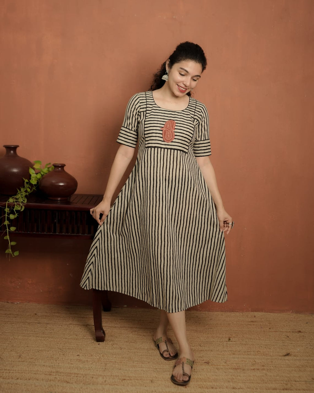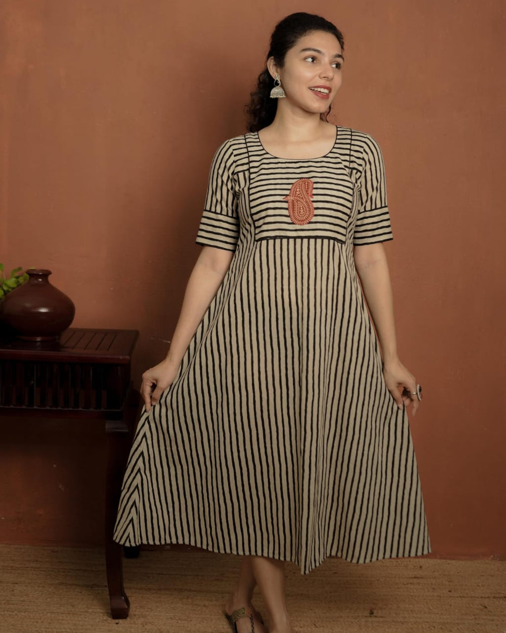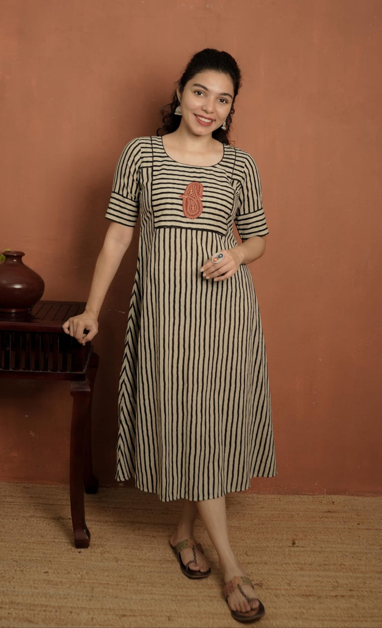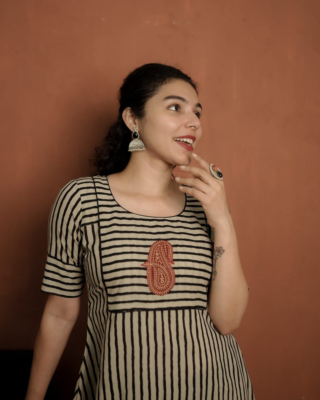 Stripe printed cotton A-Line dress with round neck. Assymetric yoke with Embroidery Ajrakh Applique work. Piping on Neck and Yoke for detailing.