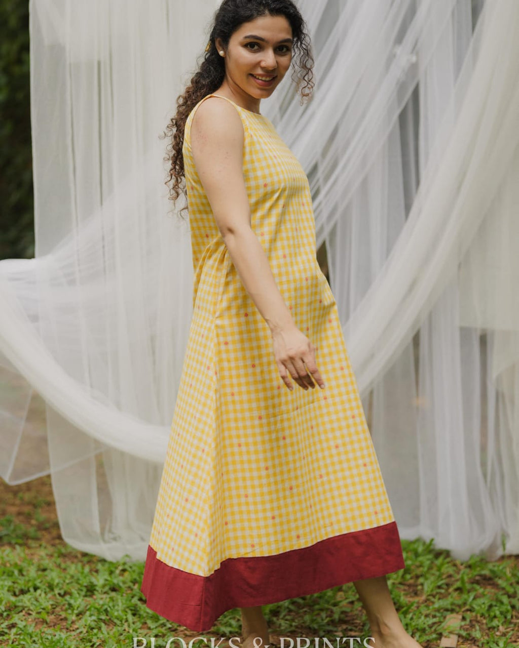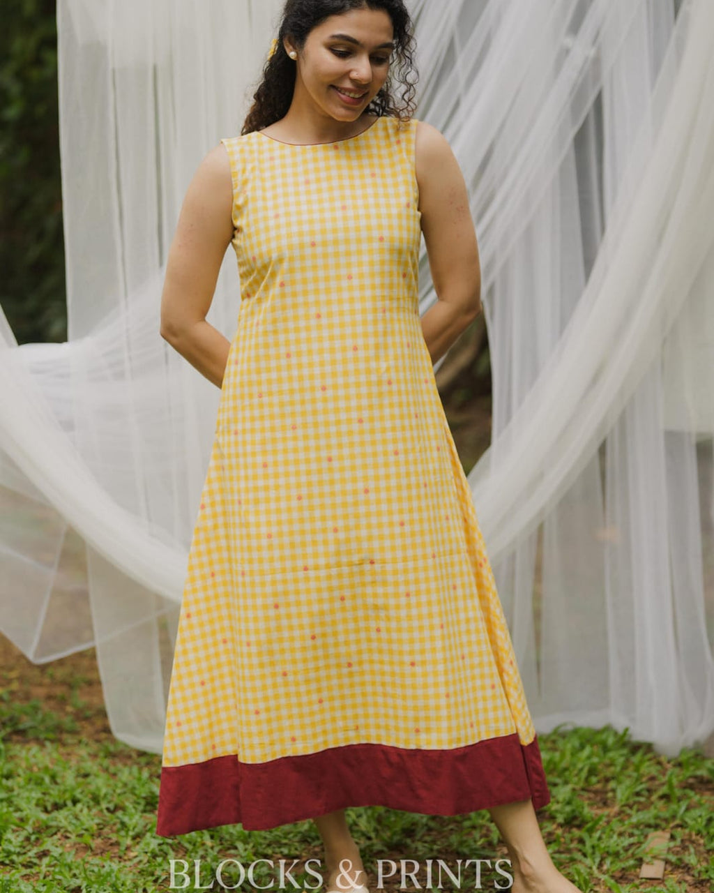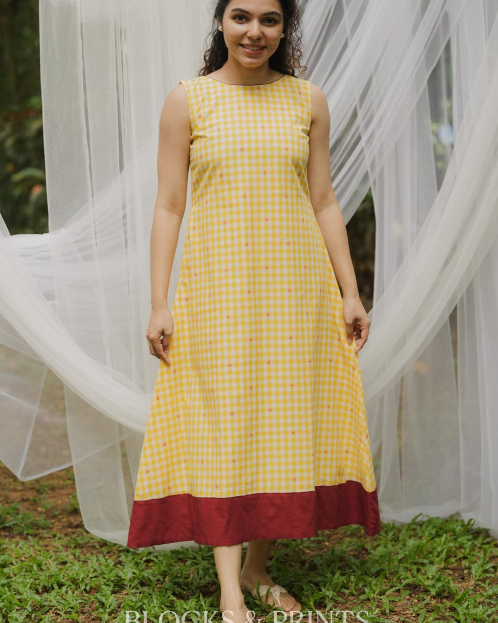 High-quality soft cotton A-line Sleeveless dress in checkered pattern with Boat Neck. Piping added for detailing. Pocket on one side. Contrast color Handloom patch on the motif for detailing.