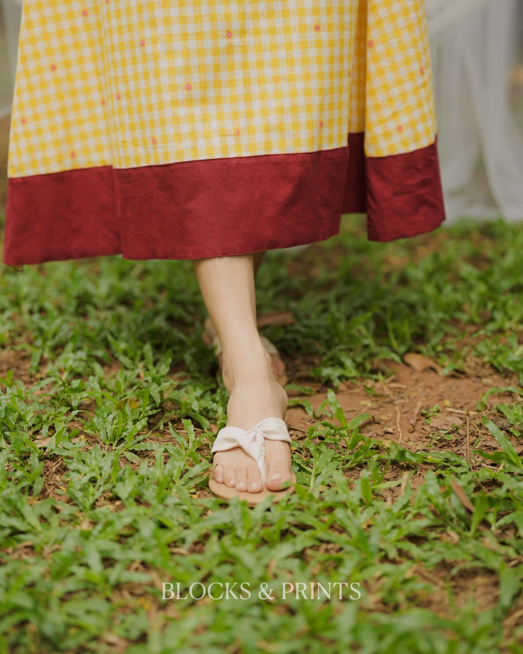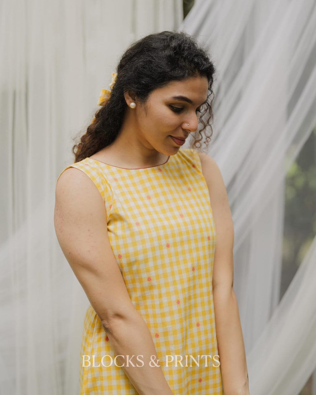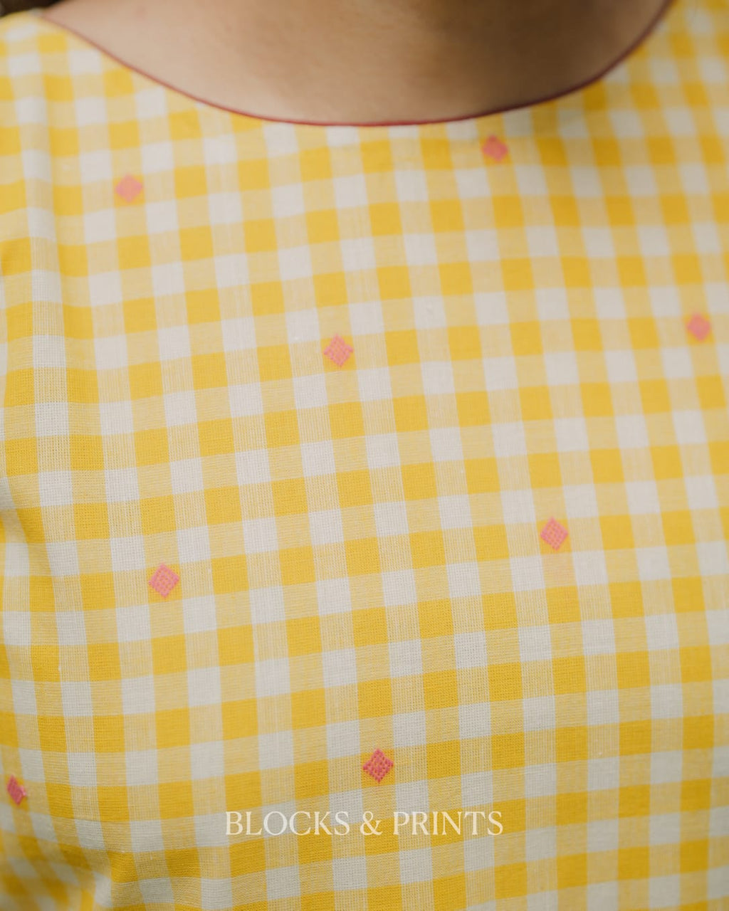 High-quality soft cotton A-line Sleeveless dress in checkered pattern with Boat Neck. Piping added for detailing. Pocket on one side. Contrast color Handloom patch on the motif for detailing.