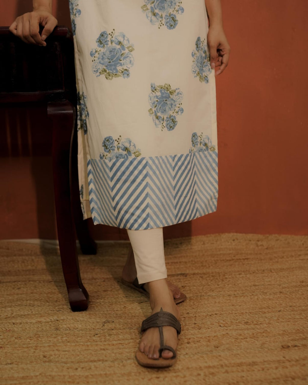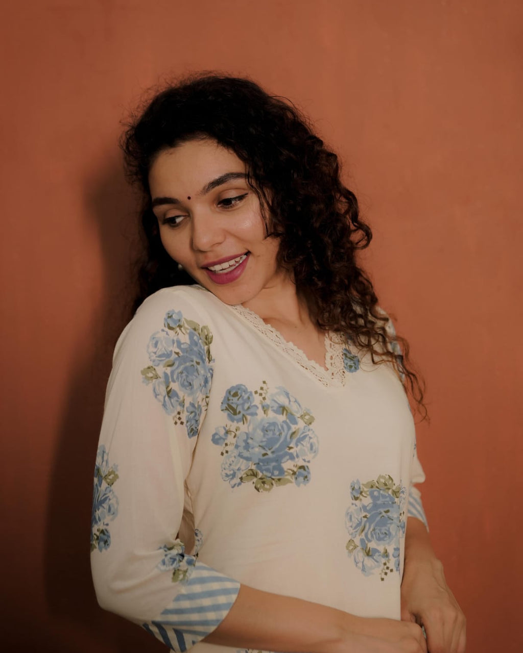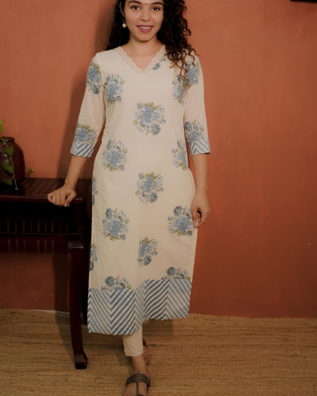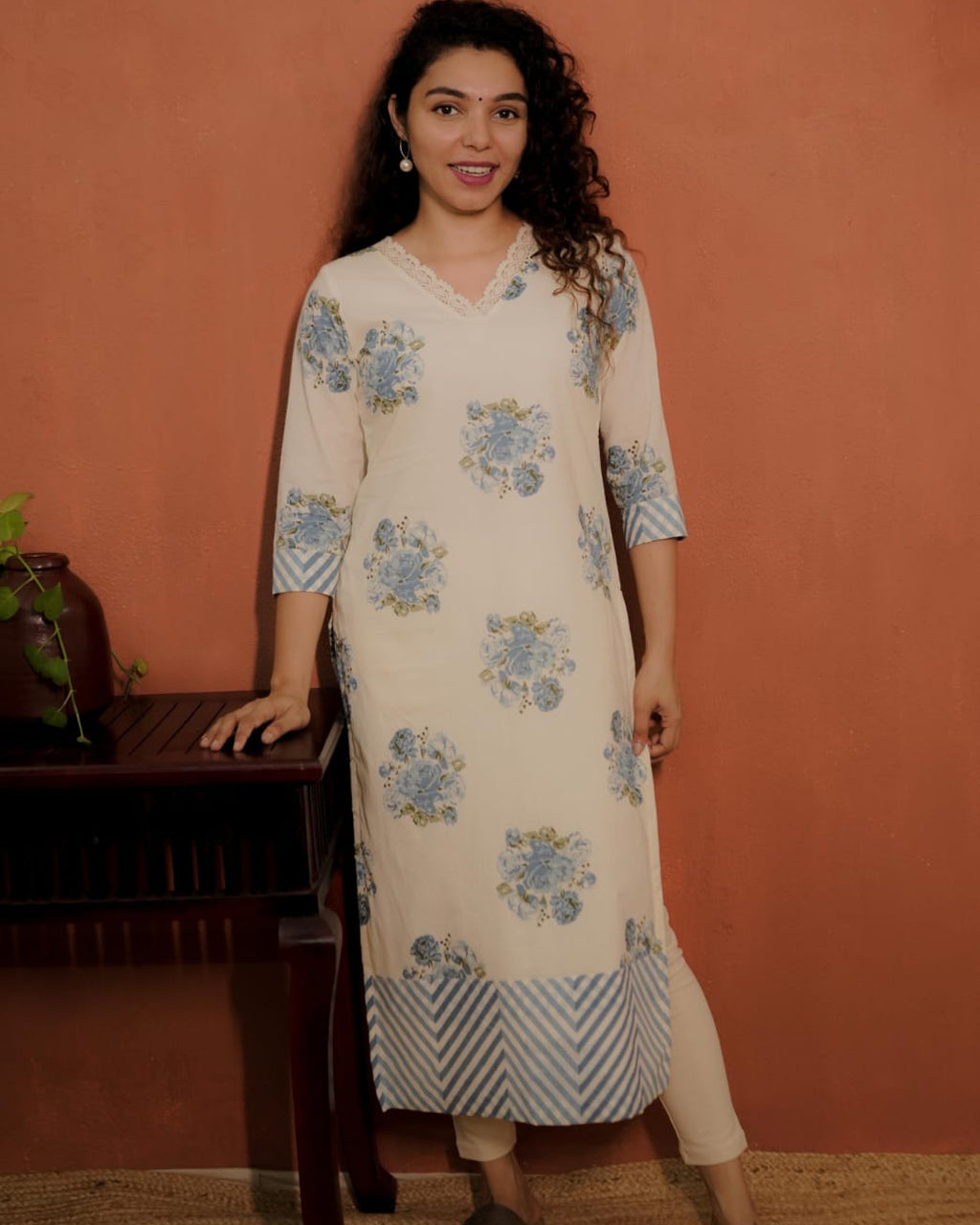 Printed Cotton Slit Kurthi with. V neck, with Lace. Printed Fabric and Lace on Motif. Patch on Sleeves.