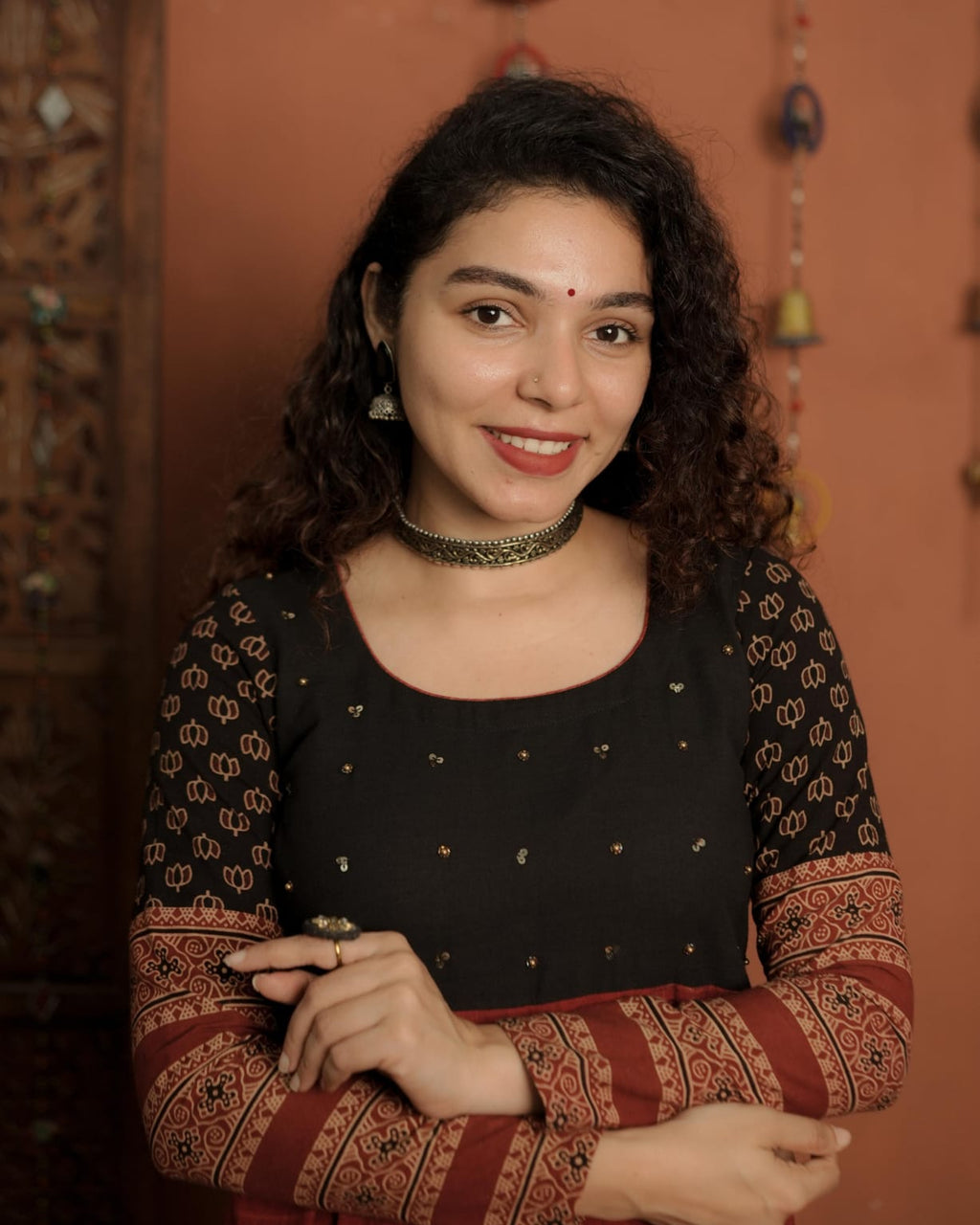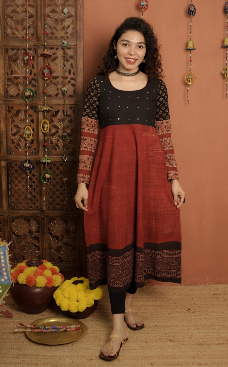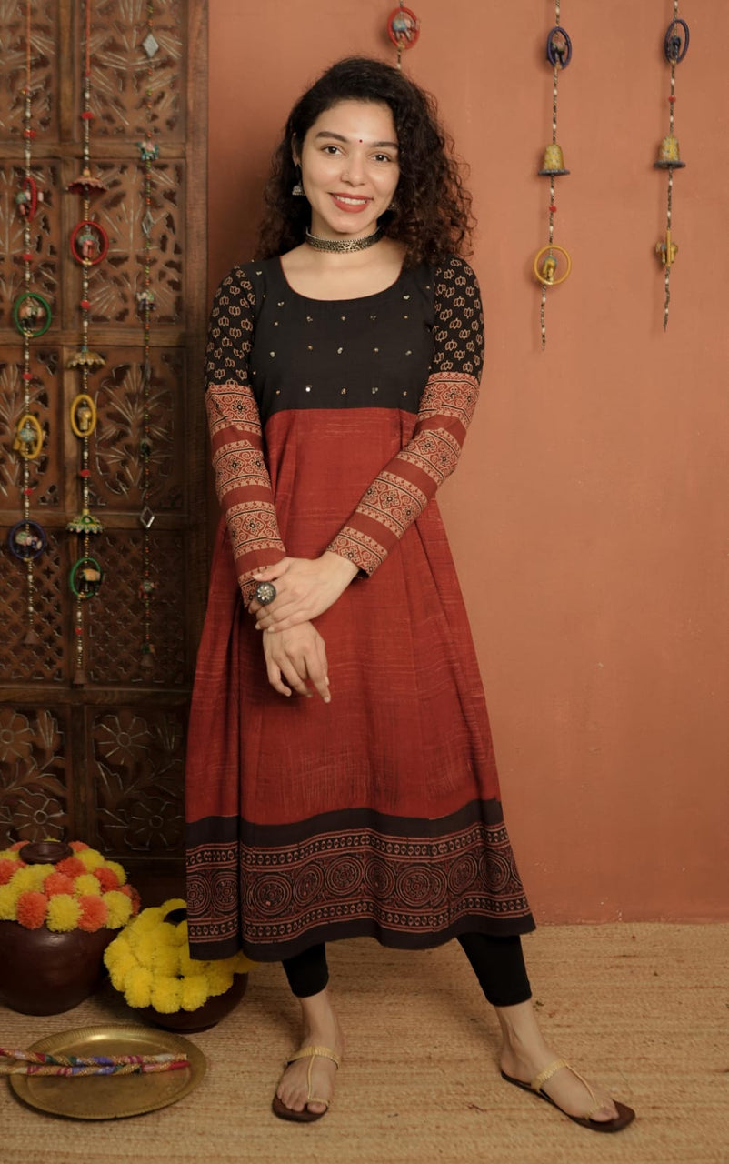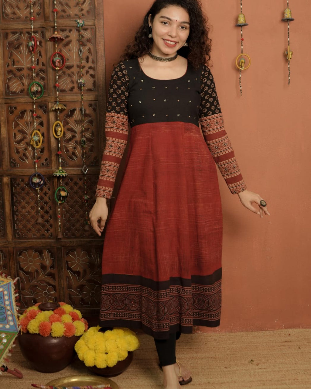 Designer Ajrakh Brush effect Print A-Line Kurthi with Round Neck. Piping on neck and Hand Embroidery work on Yoke for detailing. Double Ajrakh Patched Sleeves.