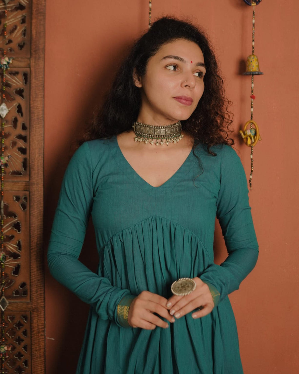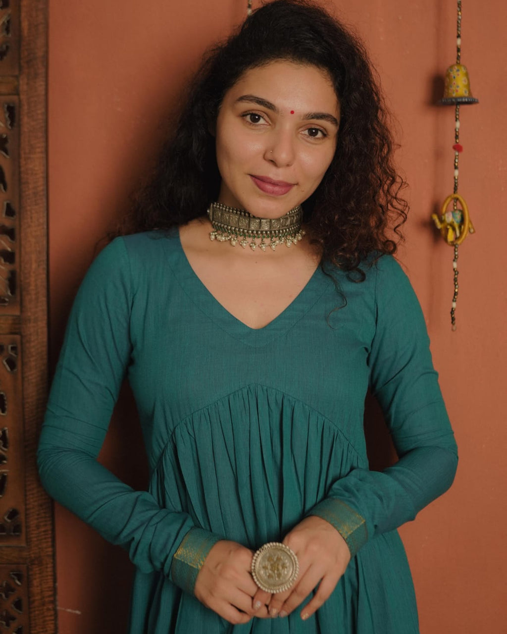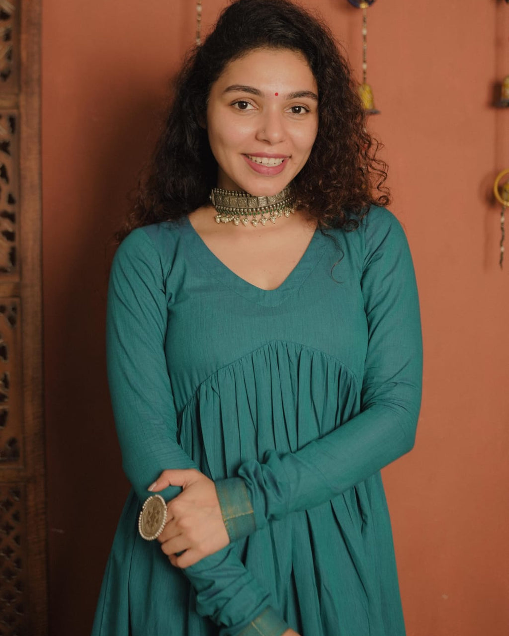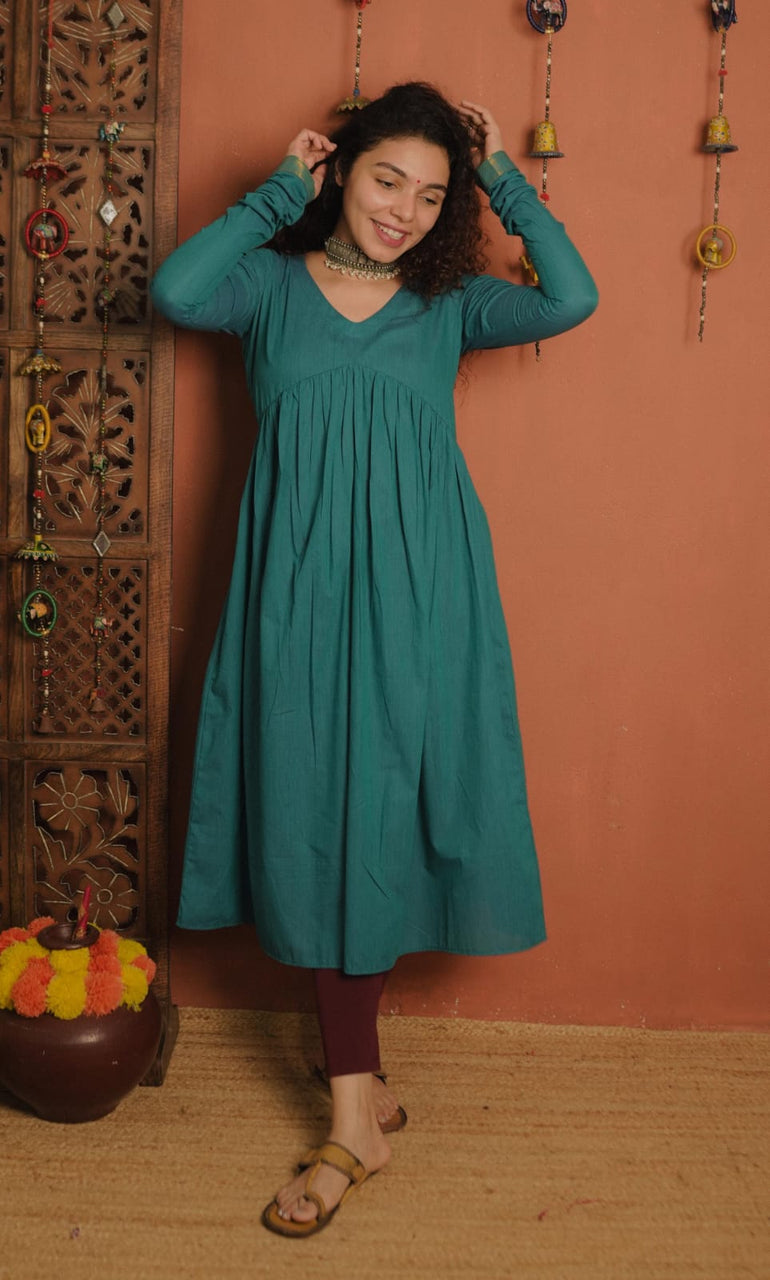 Handloom mangalgiri Cotton Alia Cut Kurthi with V neck and Gathers on Yoke portion. Golden Zeri Patch at the Sleeves end. Churi Sleeves.