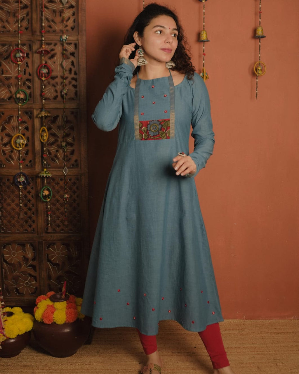 Mangalgiri Cotton A-Line Kurthi with cut-out neck with Tie saches at the back side. Kalamkari patch on the yoke, Embroidery Mirror for detailing on Yoke and the lower Motif. Border patch on the Yoke and sleeve end.