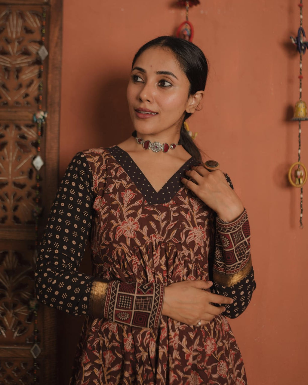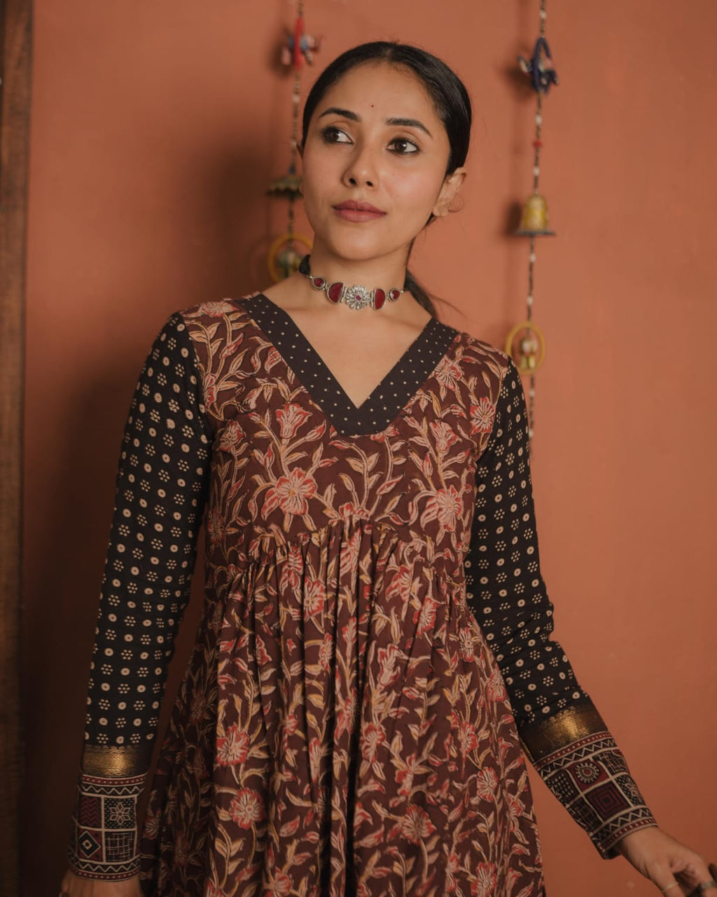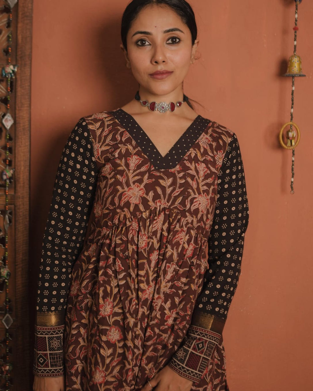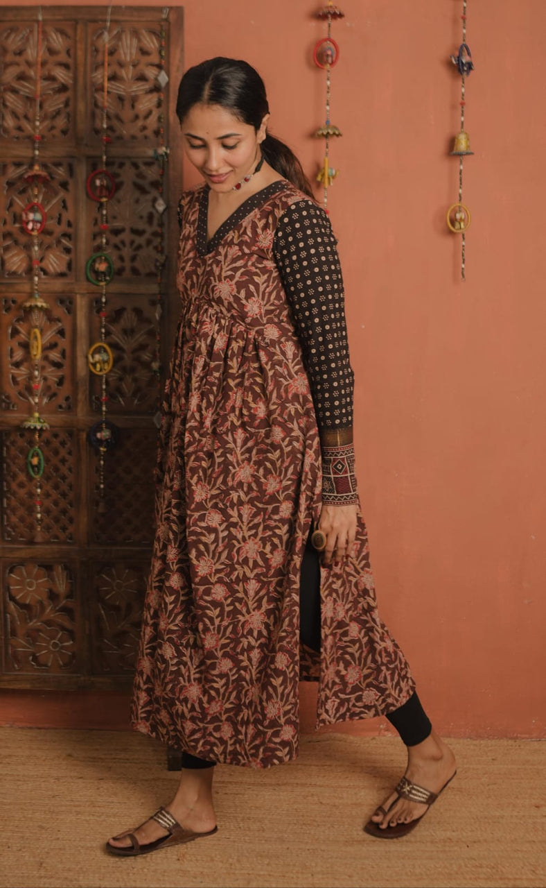 Kalamkari printed Alia Cut Slit kurthi with V neck. Gathers on the Yoke portion. Ajarkh Patch on Neck and Sleeves with Mangalgiri Zeri patch.