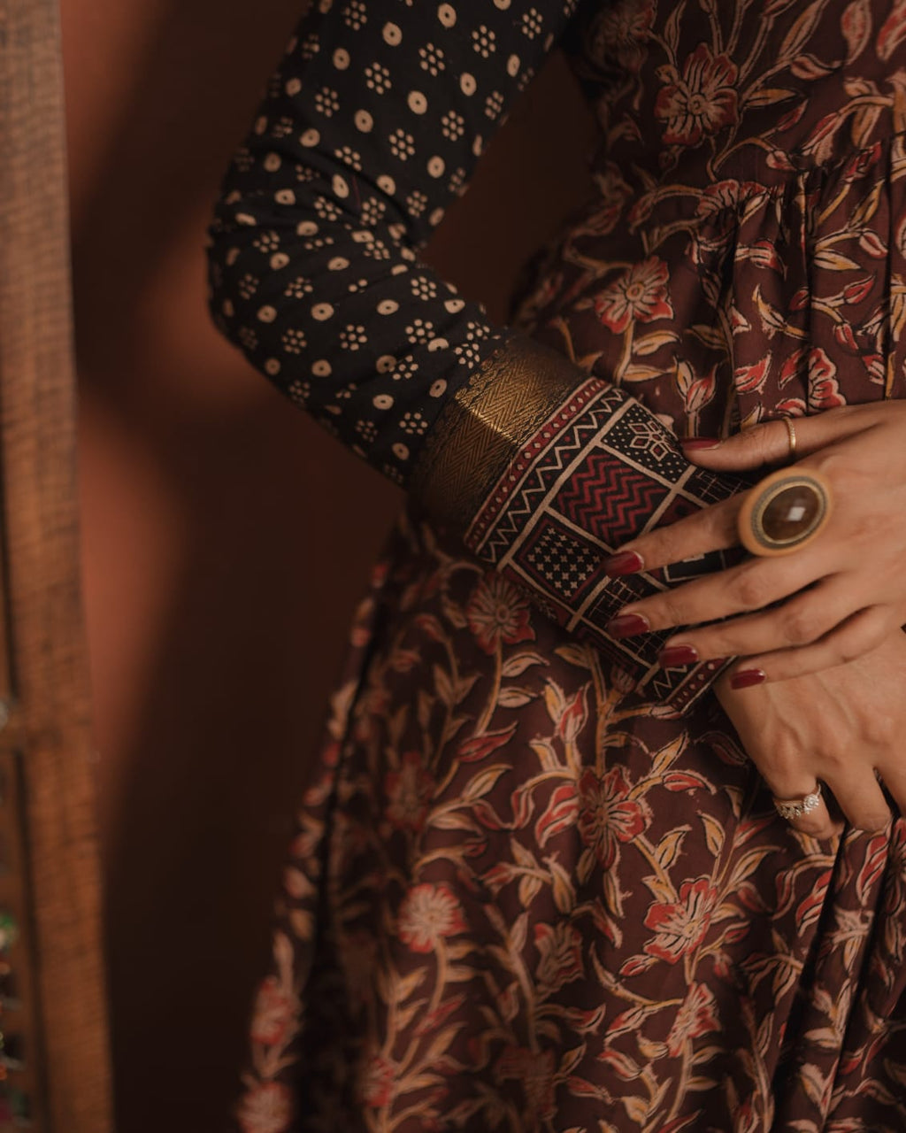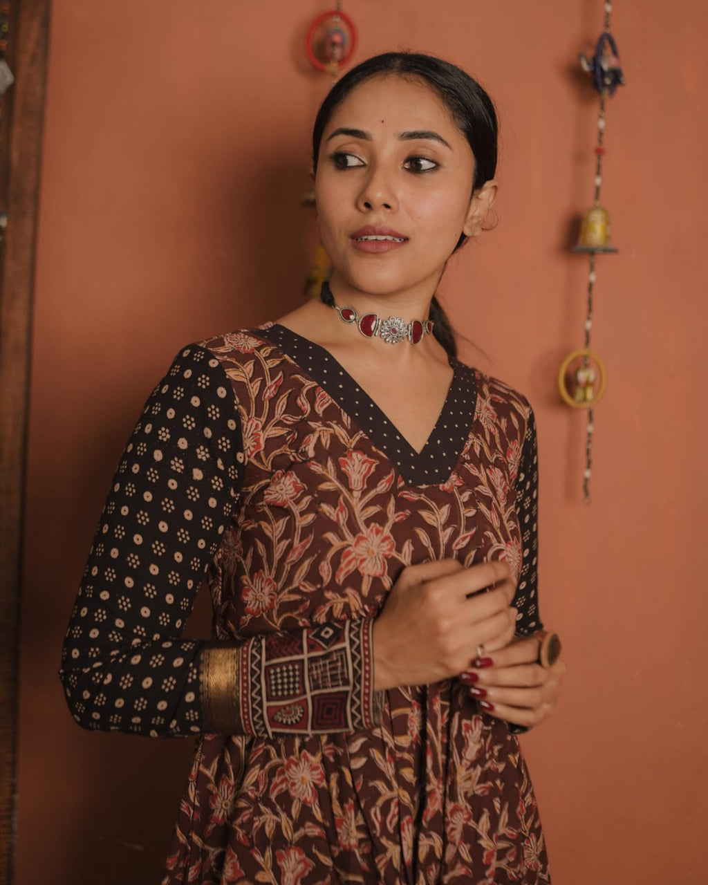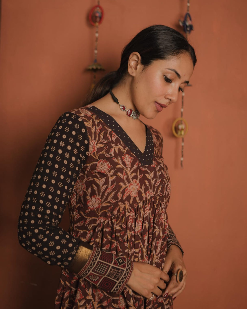 Kalamkari printed Alia Cut Slit kurthi with V neck. Gathers on the Yoke portion. Ajarkh Patch on Neck and Sleeves with Mangalgiri Zeri patch.