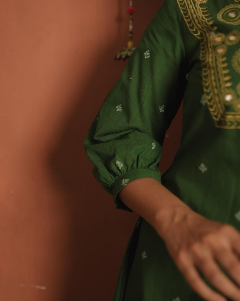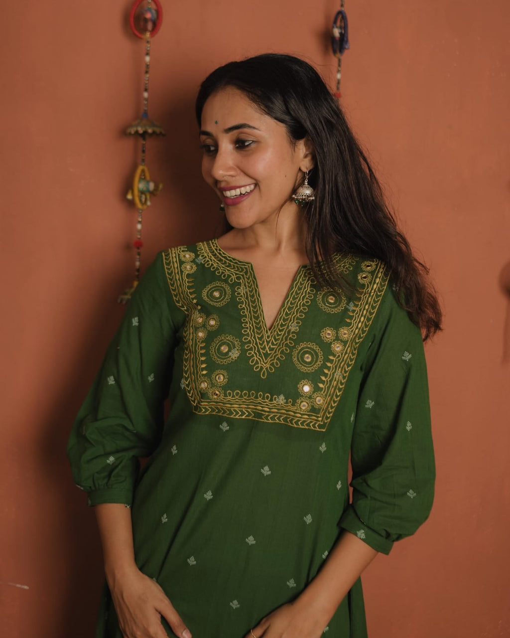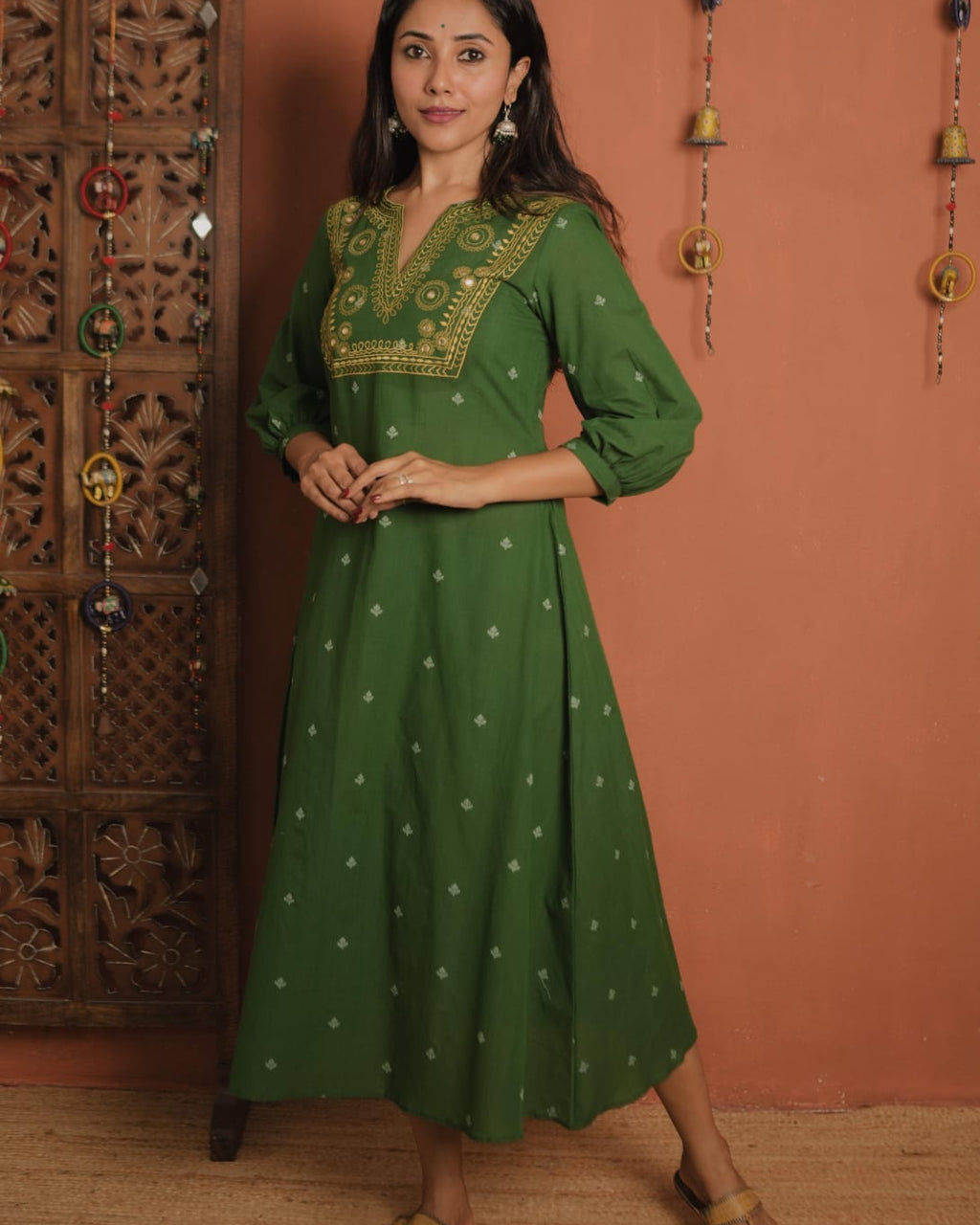 Handloom Cotton all over woven butti A-Line kurthi with slit V neck. Heavy Embroidery work with Mirror work for detailing. Puff on end of the sleeves