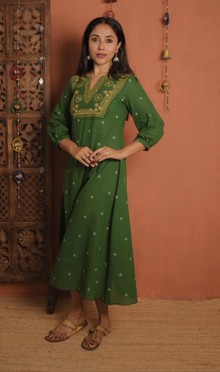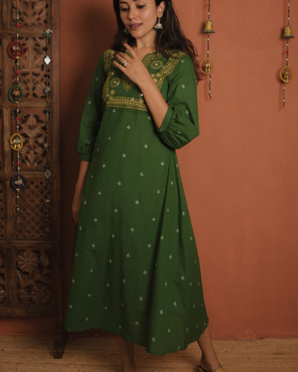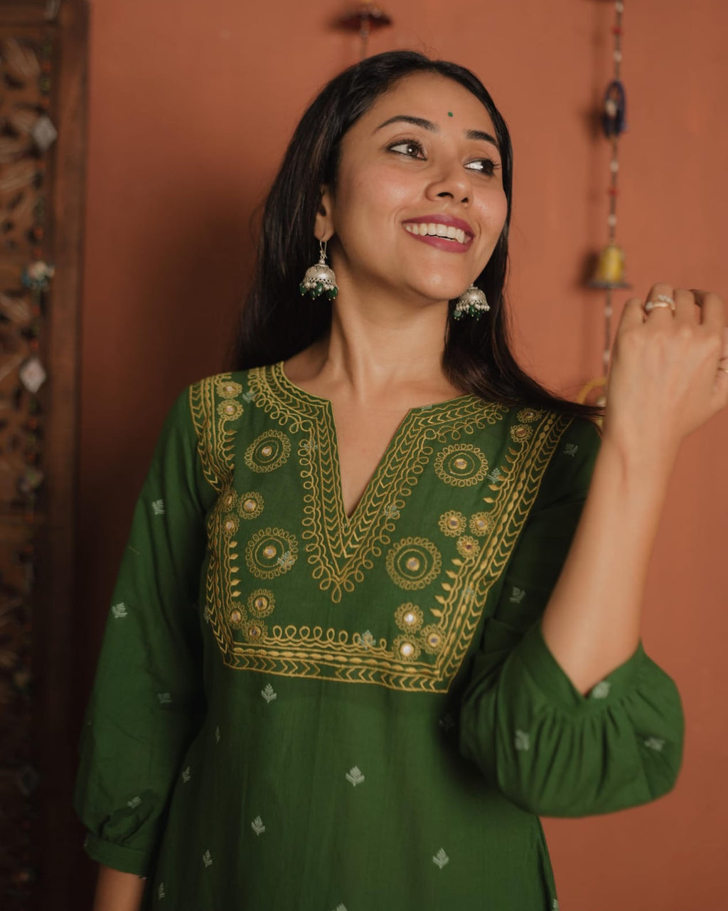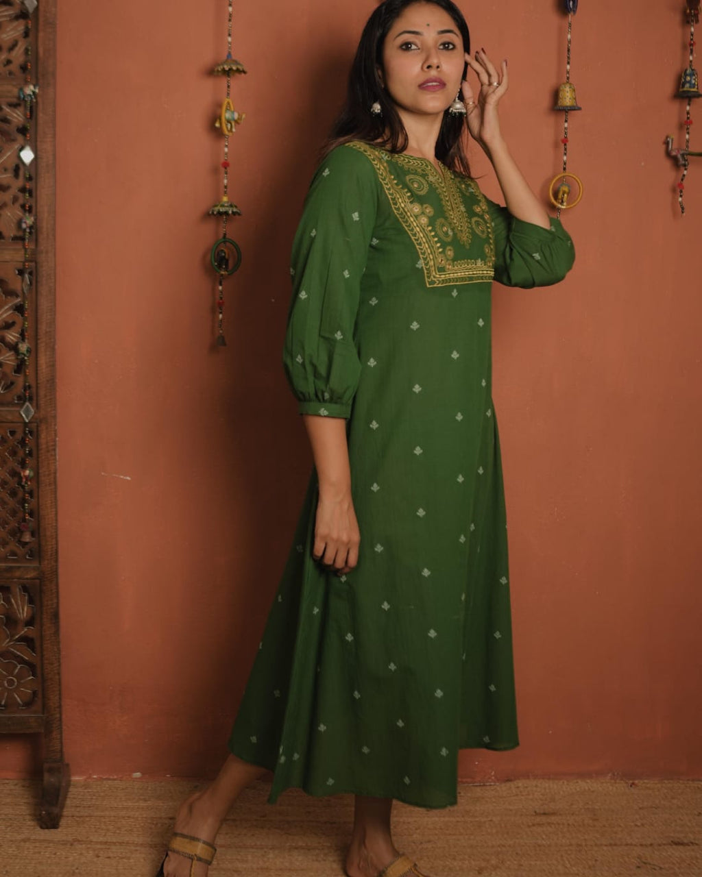 Handloom Cotton all over woven butti A-Line kurthi with slit V neck. Heavy Embroidery work with Mirror work for detailing. Puff on end of the sleeves