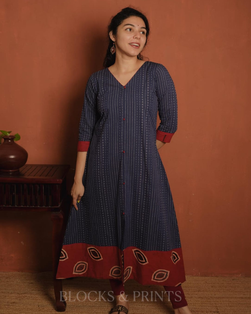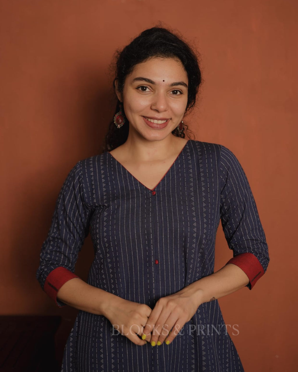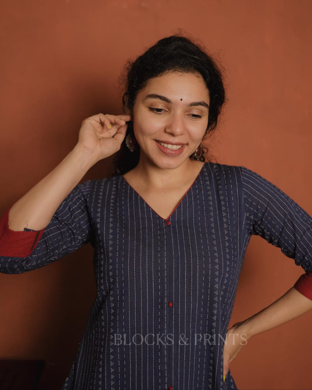 Kantha Cotton A-Line Kurthi with V neck. Contrast color piping on neck and Handloom patch at the sleeves end. Designer Ajrakh patch at the Motif. Pom poms at the front side for detailing and Small slit at the front. (Body stitched with lining.)