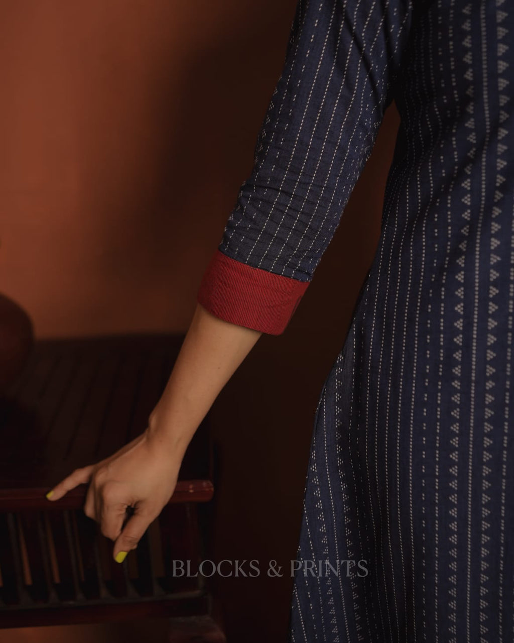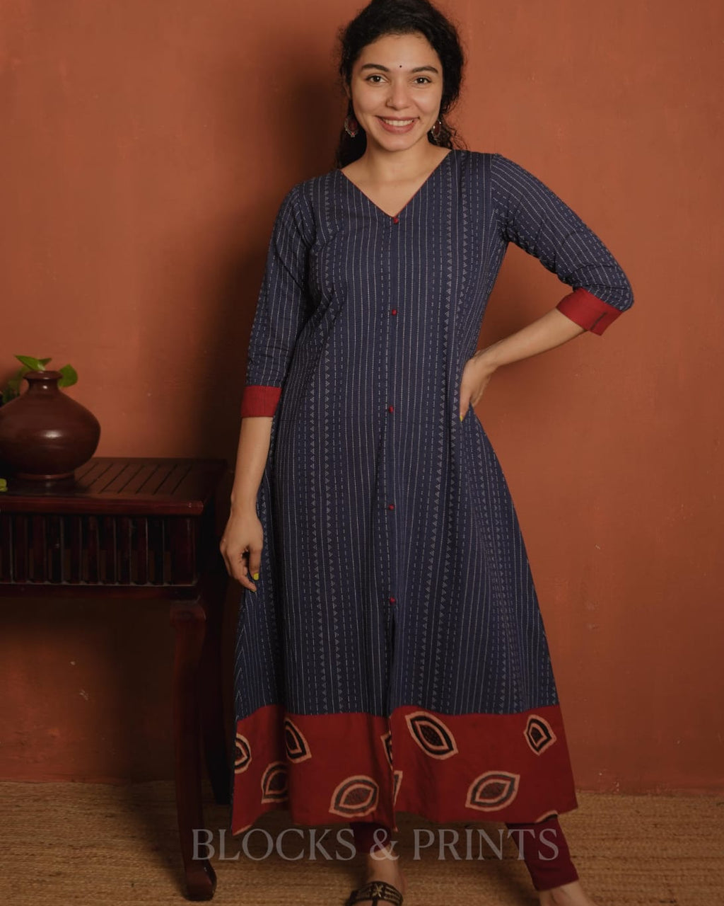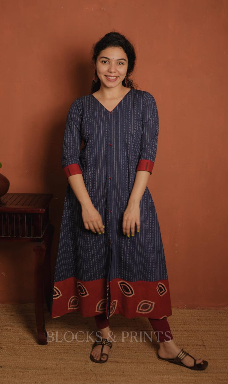 Kantha Cotton A-Line Kurthi with V neck. Contrast color piping on neck and Handloom patch at the sleeves end. Designer Ajrakh patch at the Motif. Pom poms at the front side for detailing and Small slit at the front. (Body stitched with lining.)
