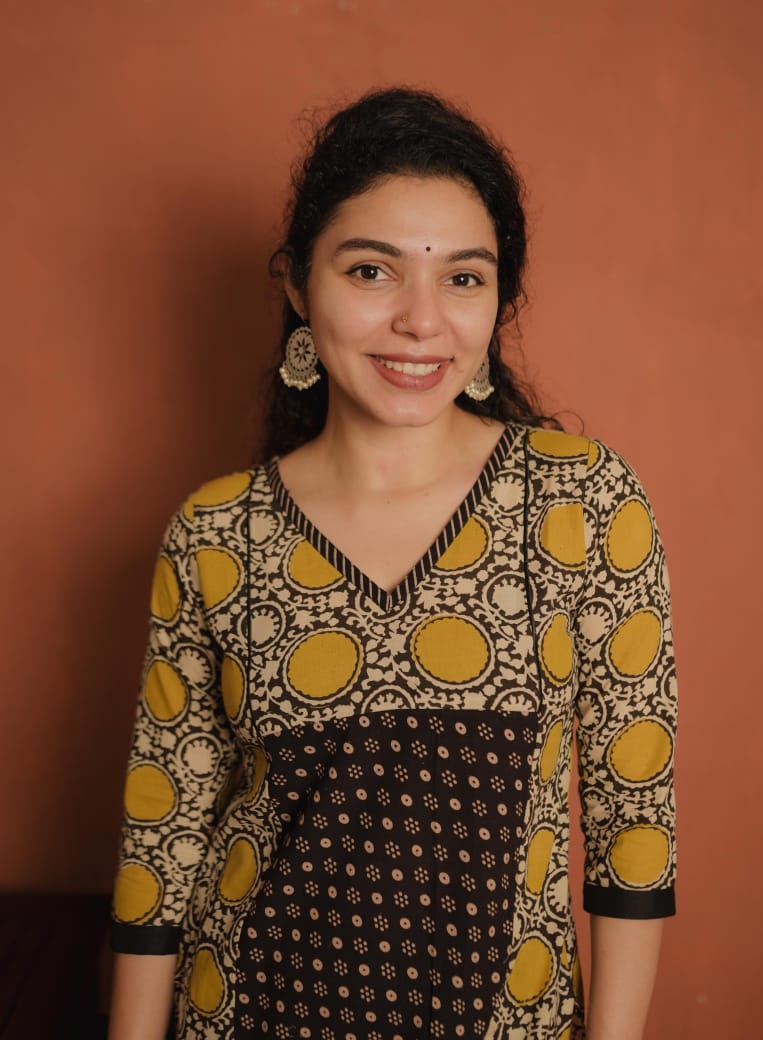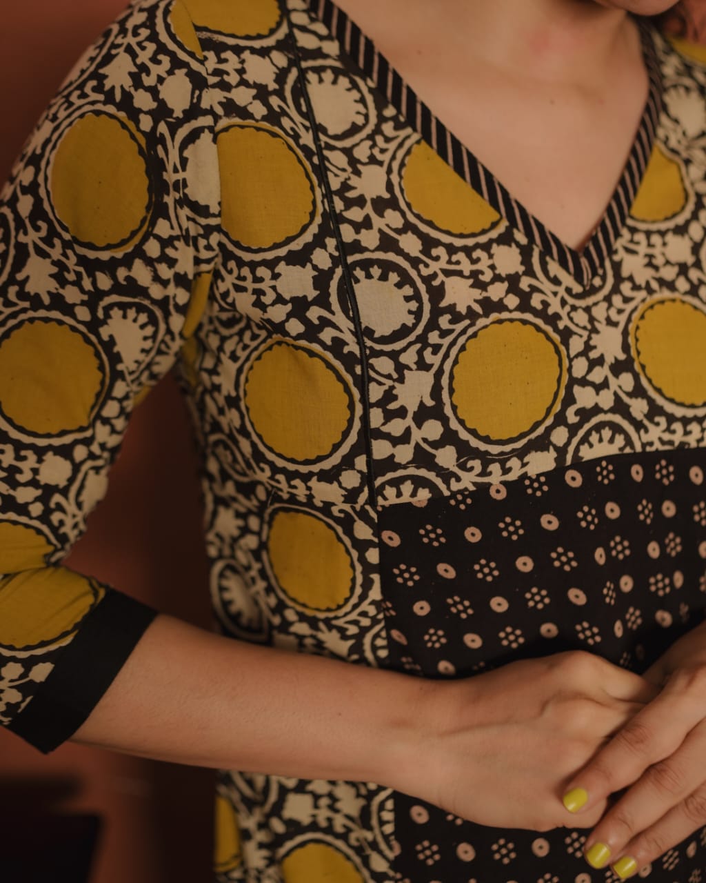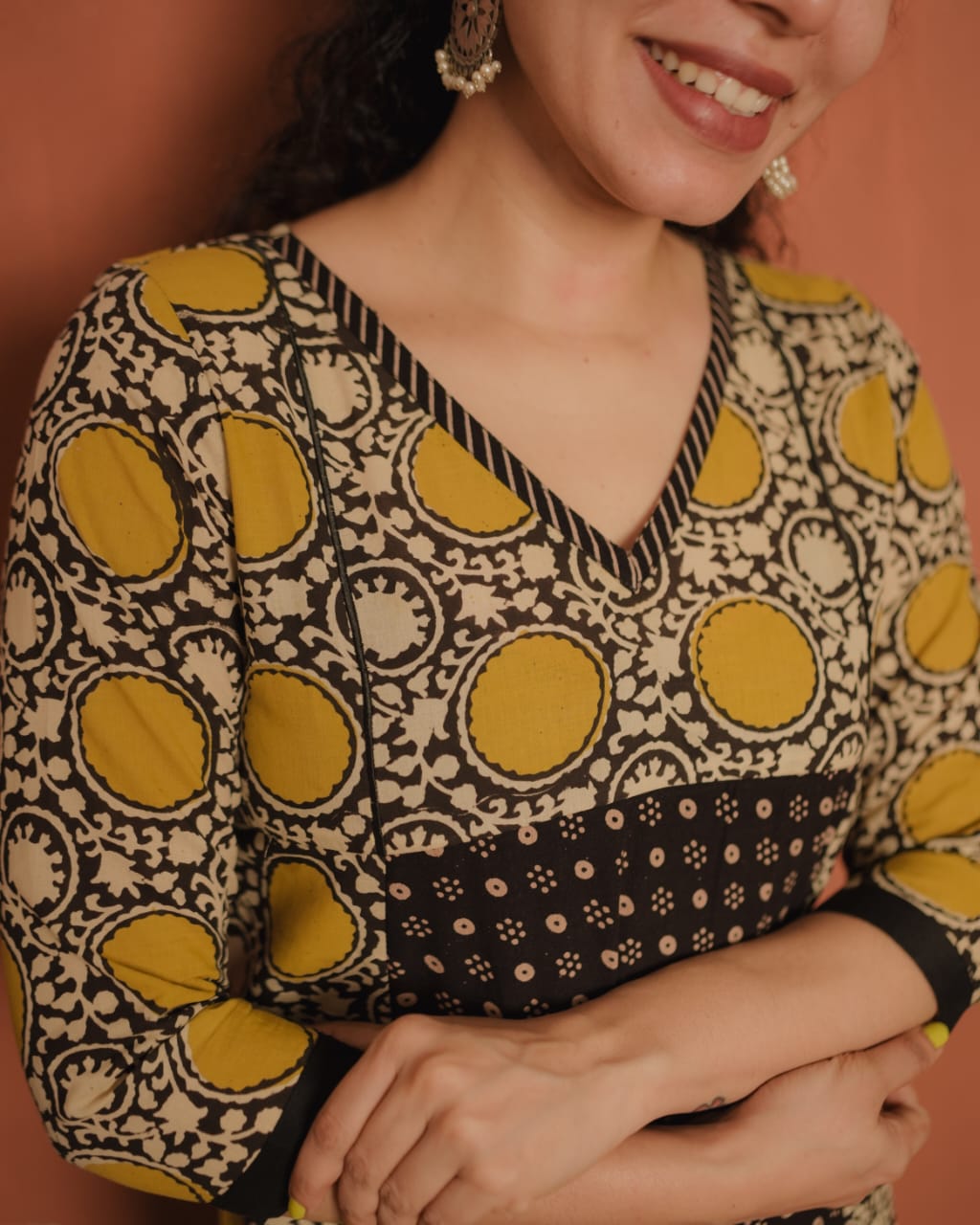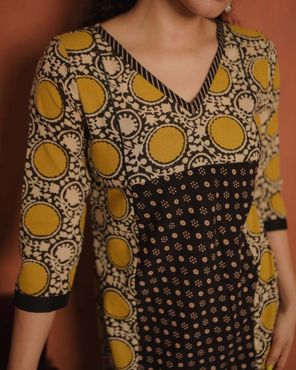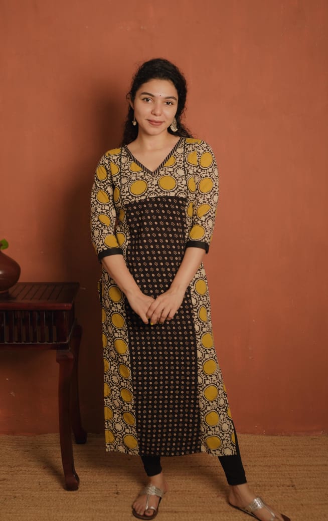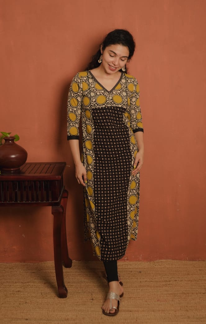 Printed cotton slit kurthi with V neck. Printed patch on neck. Piping added on yoke for detailing. Ajrakh printed panel on front portion. Plain patch on Sleeves End.