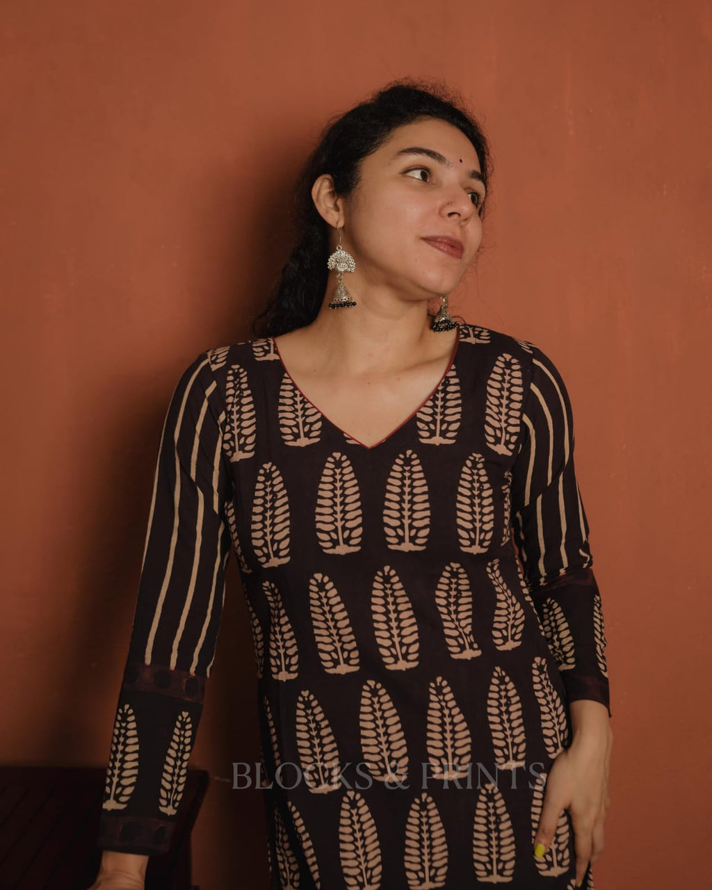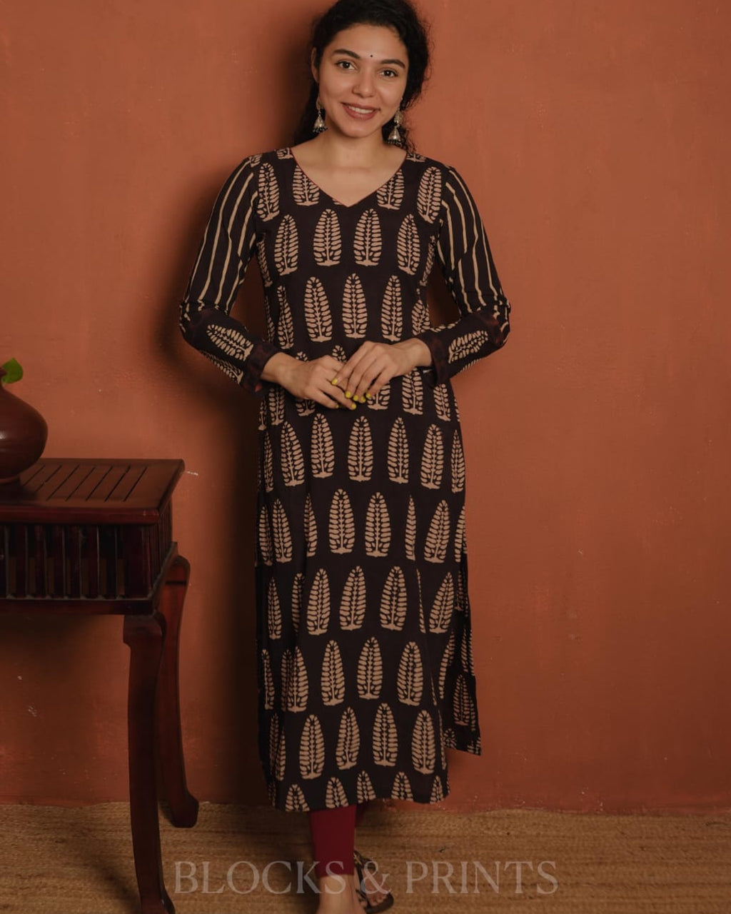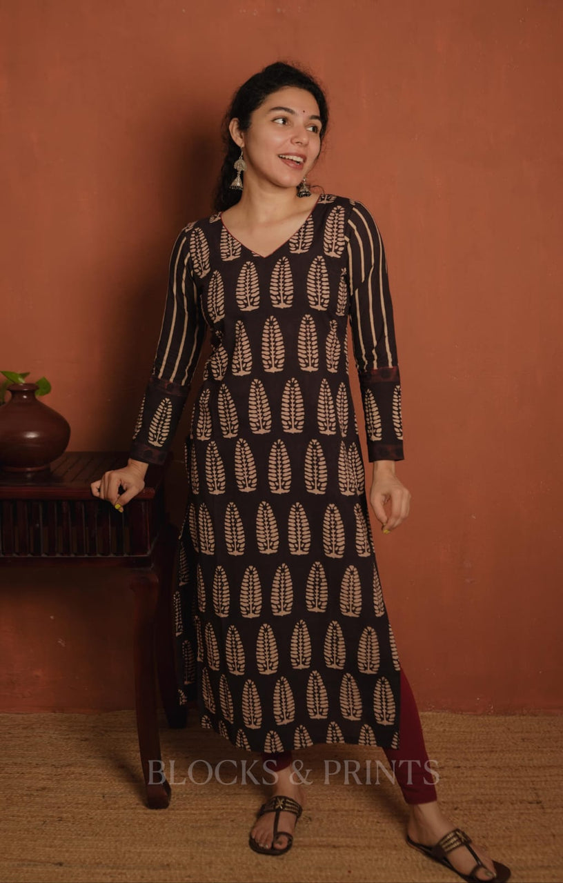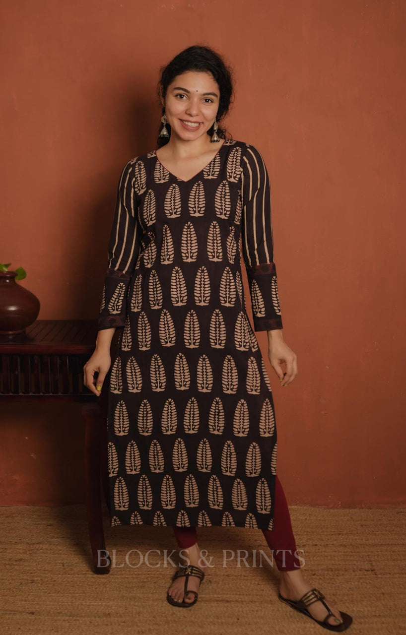 Natural dyed printed cotton slit kurthi with V neck. Designer sleeves with stripes. Printed buttis on sleeve end. Contrast color piping on Neck for detailing.