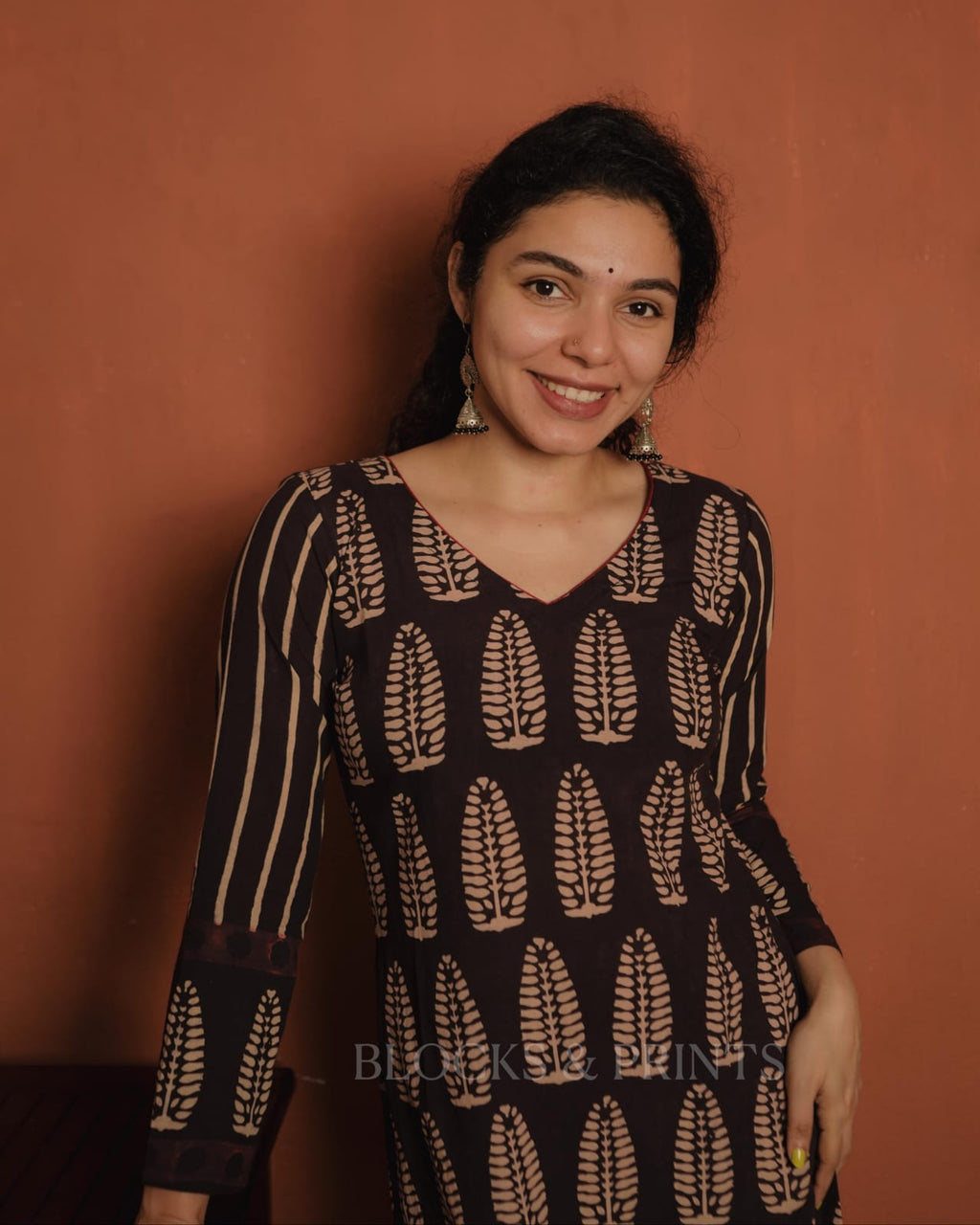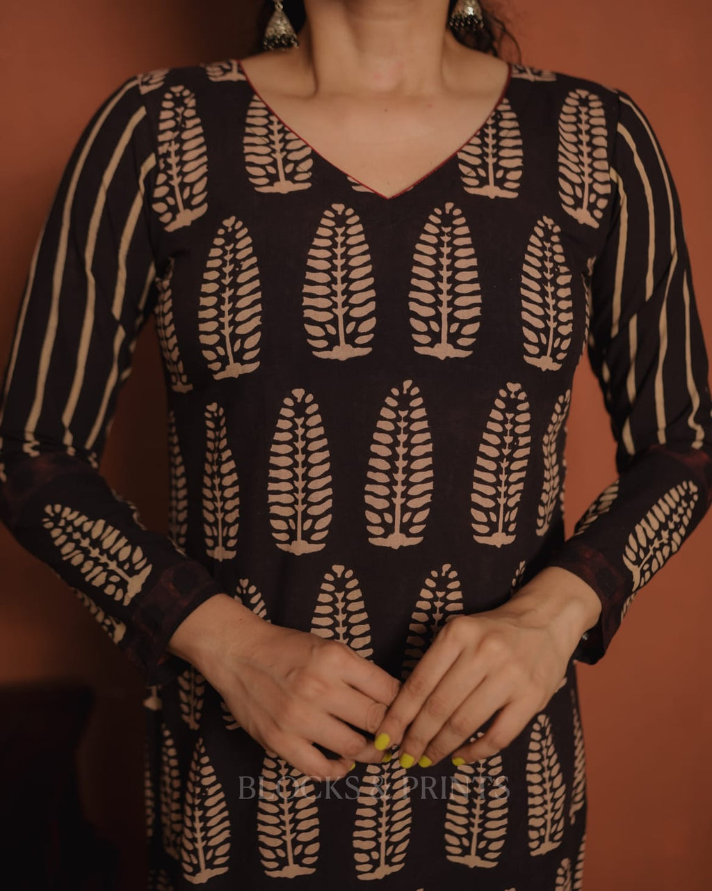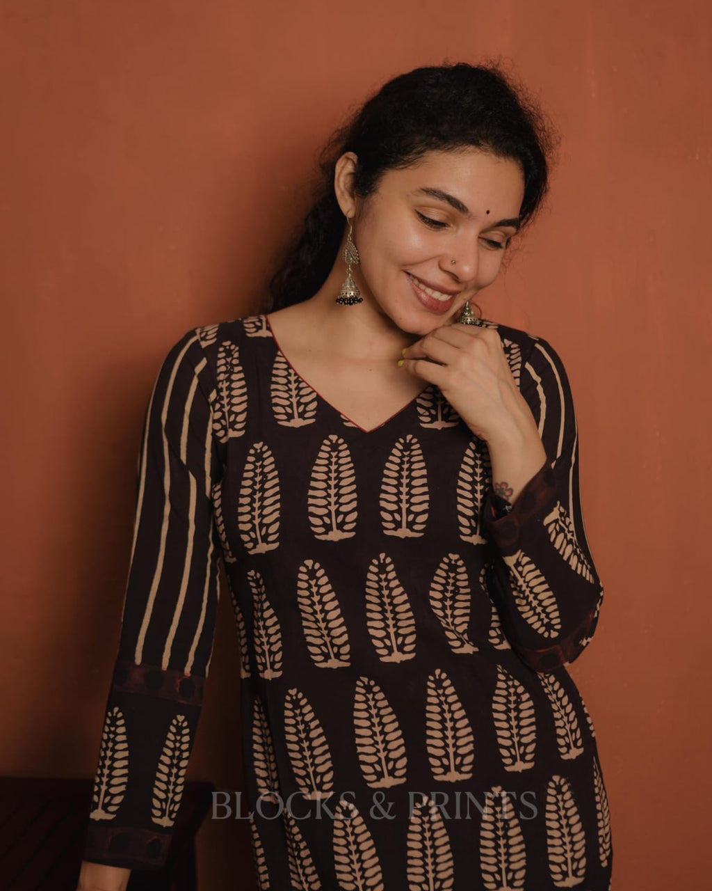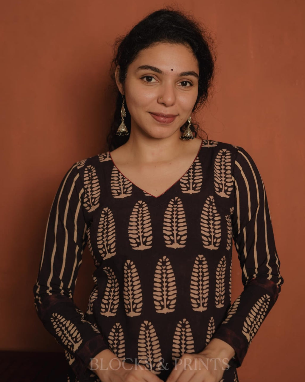 Natural dyed printed cotton slit kurthi with V neck. Designer sleeves with stripes. Printed buttis on sleeve end. Contrast color piping on Neck for detailing.