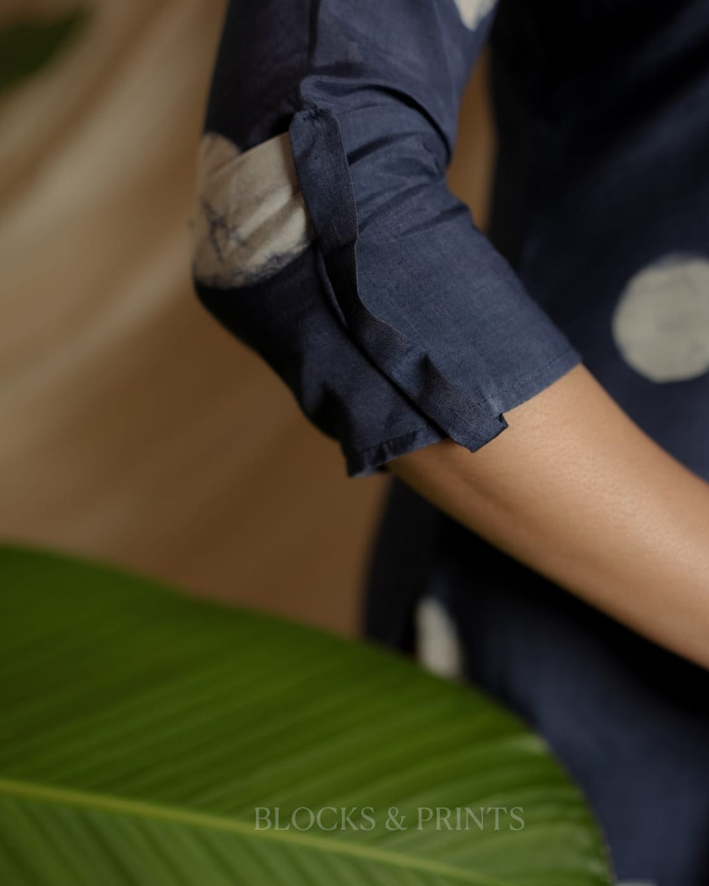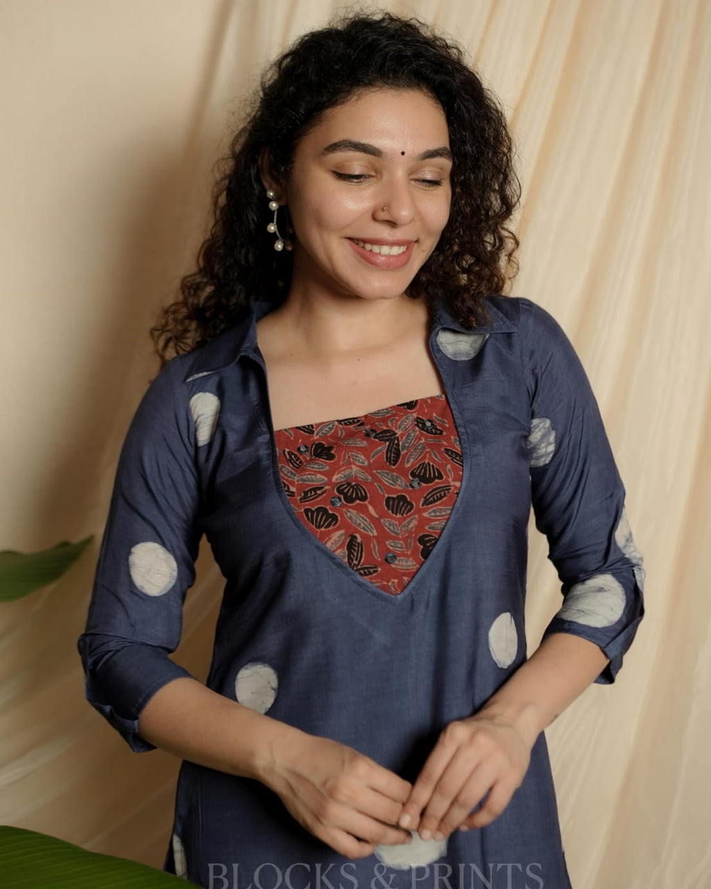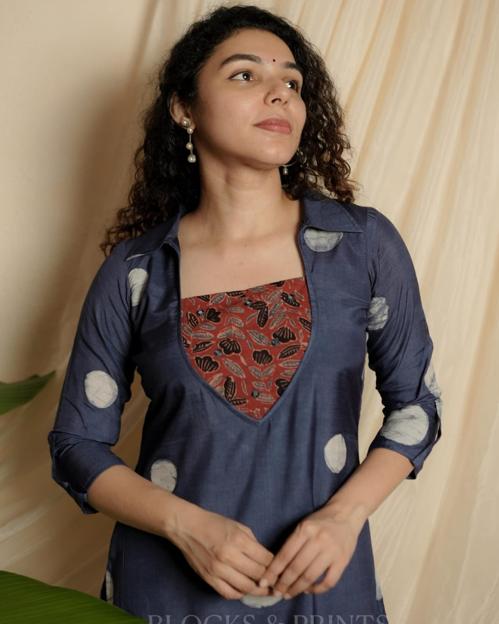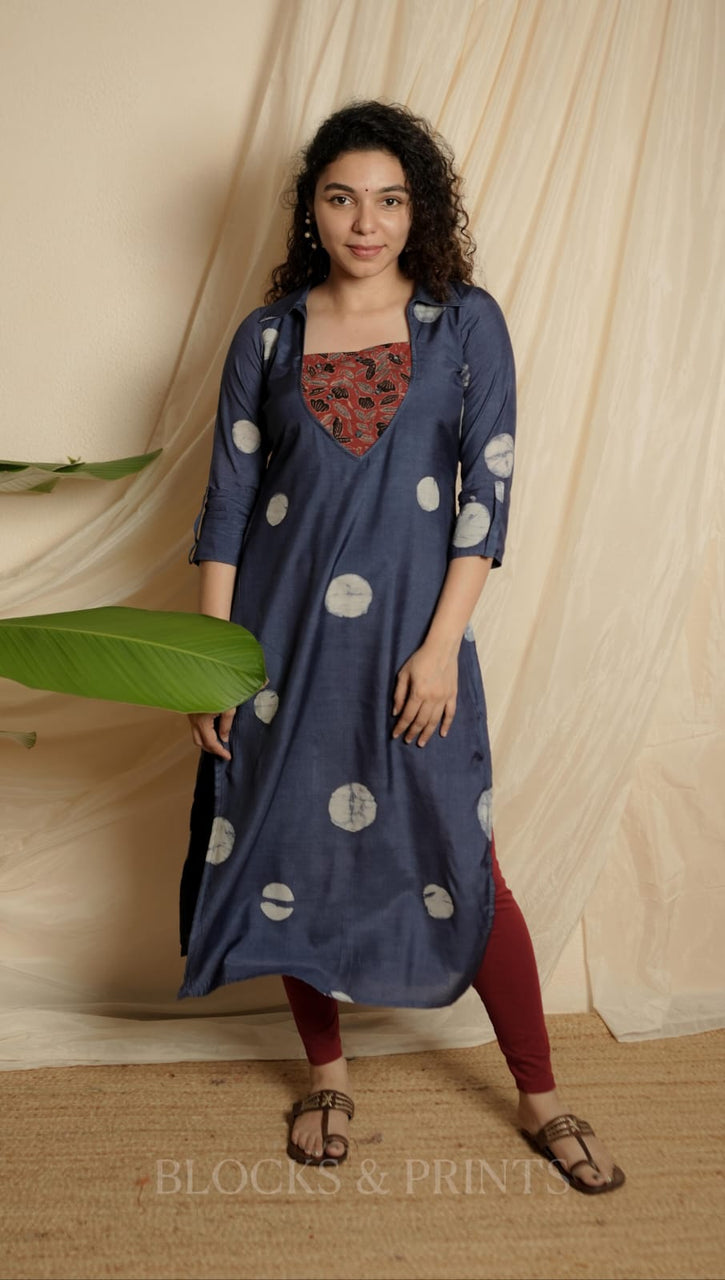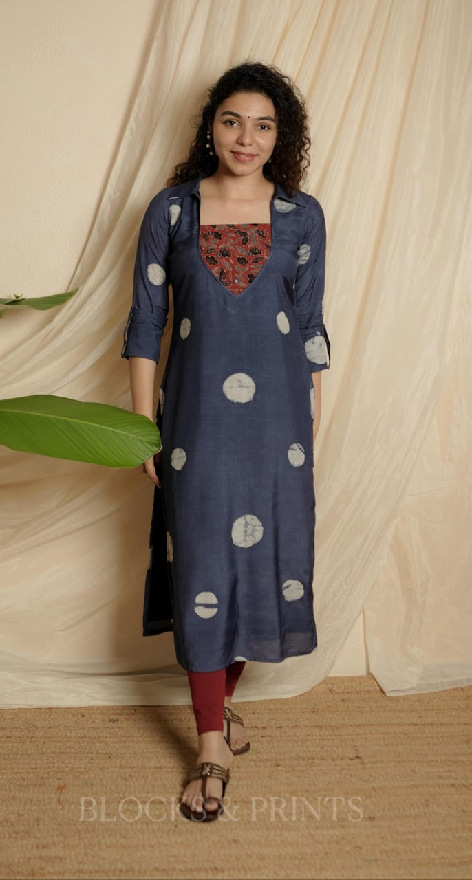 Muslin silk with wax batik print Shirt Collar neck Kurthi. Ajrakh patch on yoke with Embroidery mirror work for detailing. Flap at the sleeves. (Body stitched with lining.)