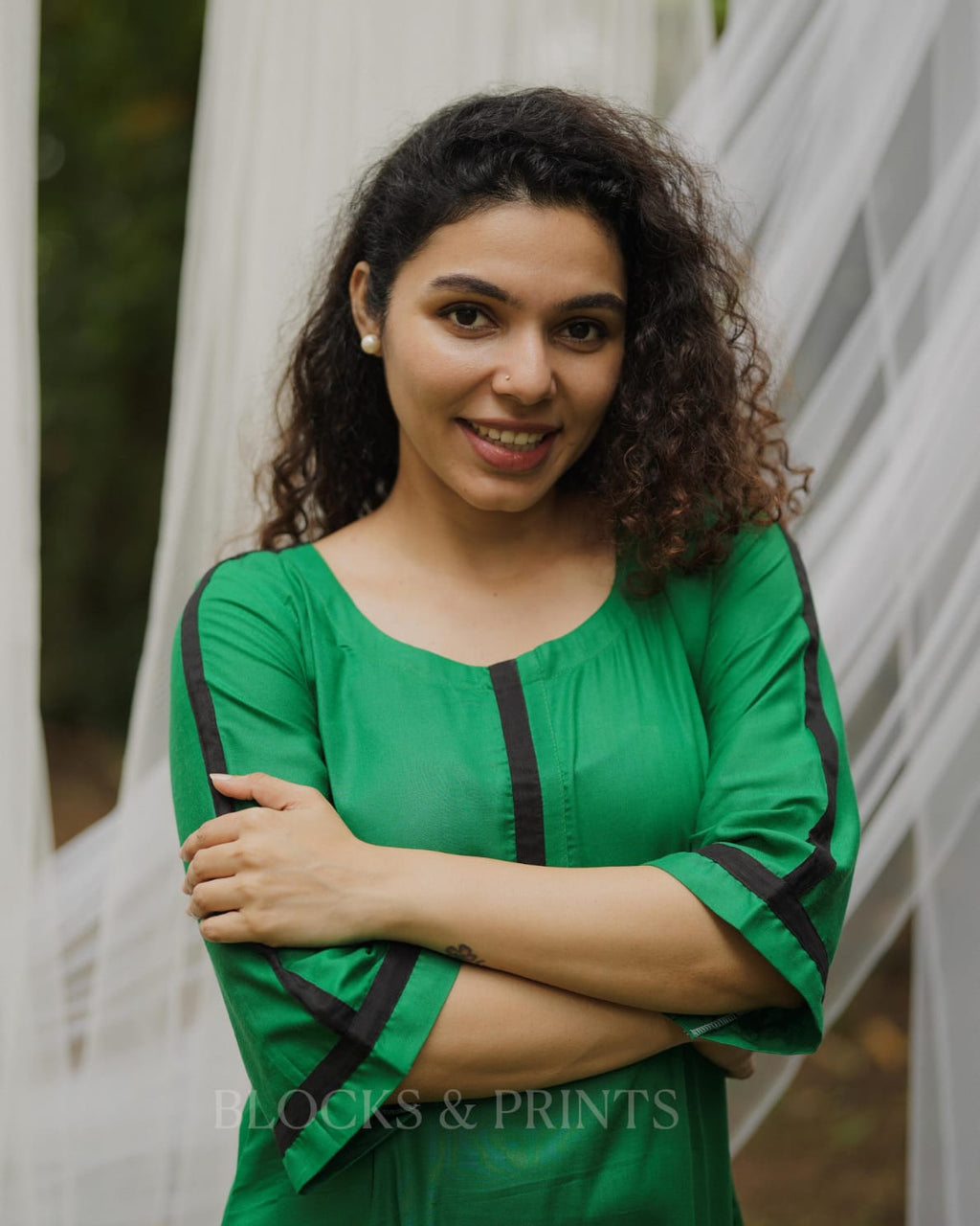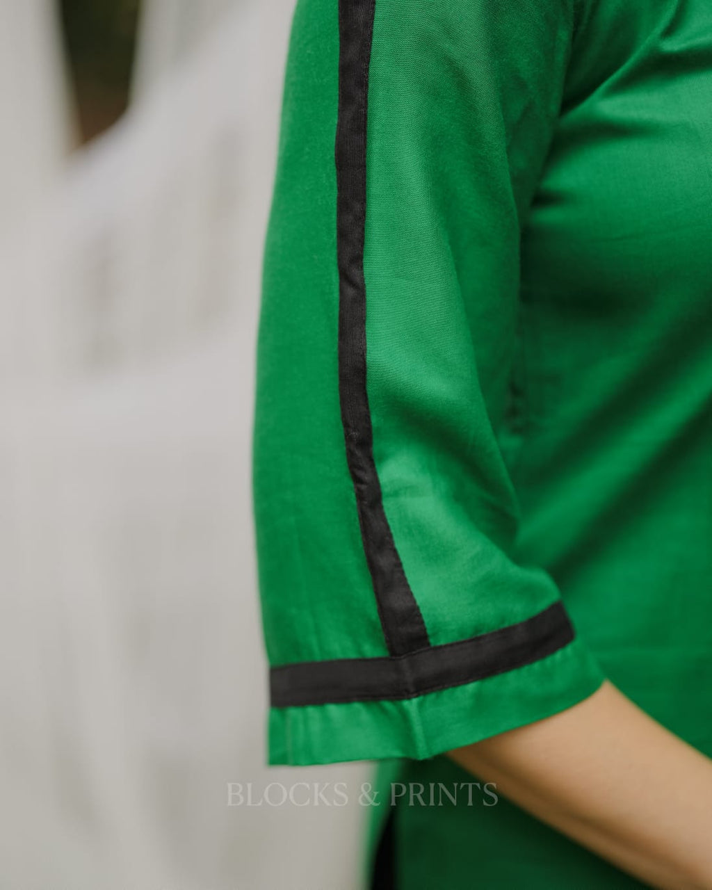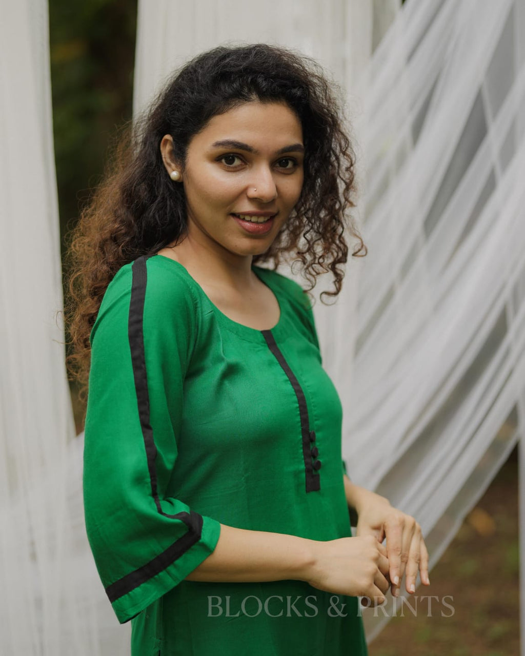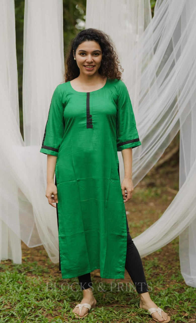 Rayon Slit Kurthi with round neck. Contrast color patch on yoke with buttons for detailing. Loose fit sleeves with patches. Patch on slit sides.