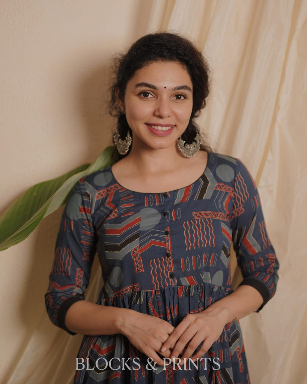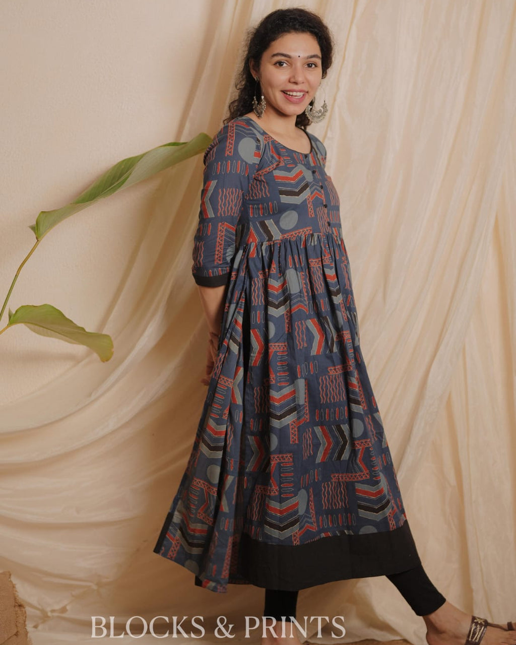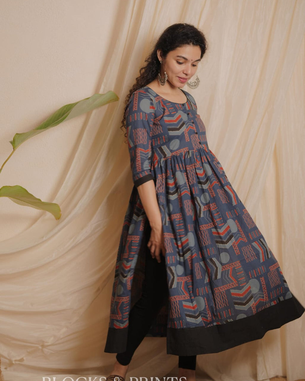 Designer Printed cotton Slit kurthi with round neck. Piping added on neck. Pom poms on yoke for detailing. Gathers on waist. Plain patch on end of the sleeves and bottom of the kurthi.