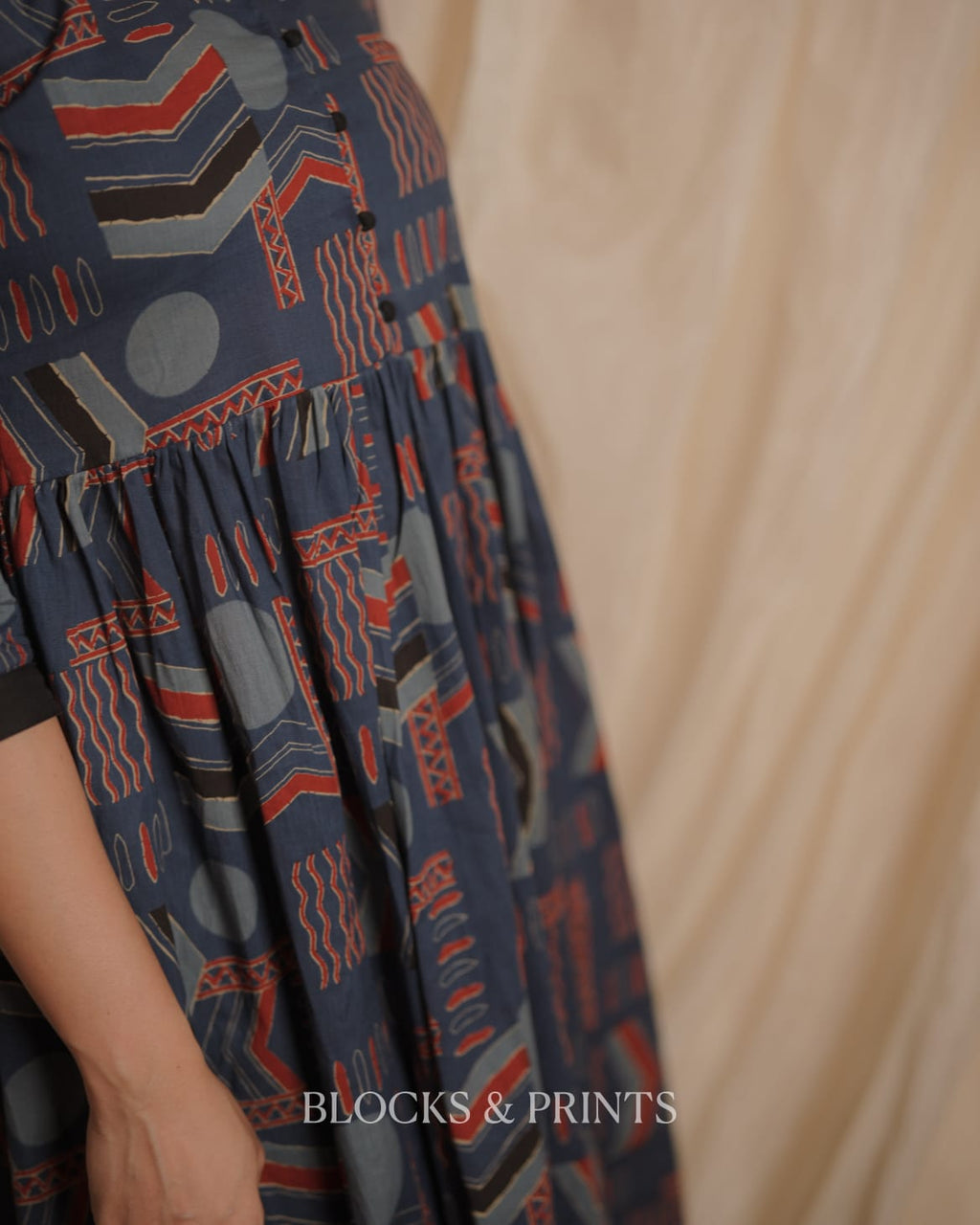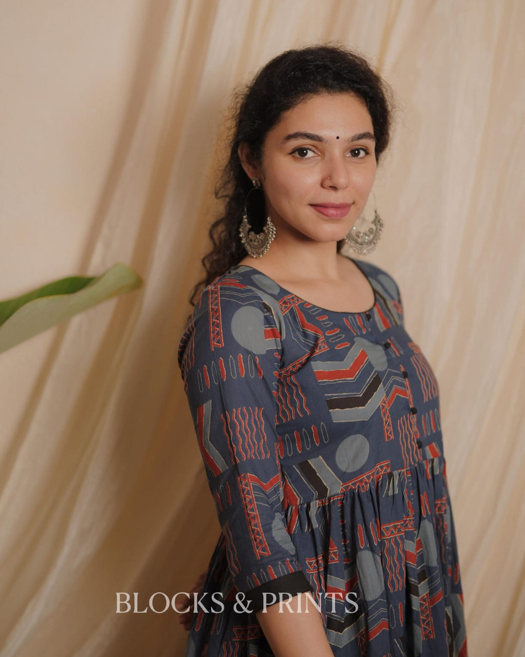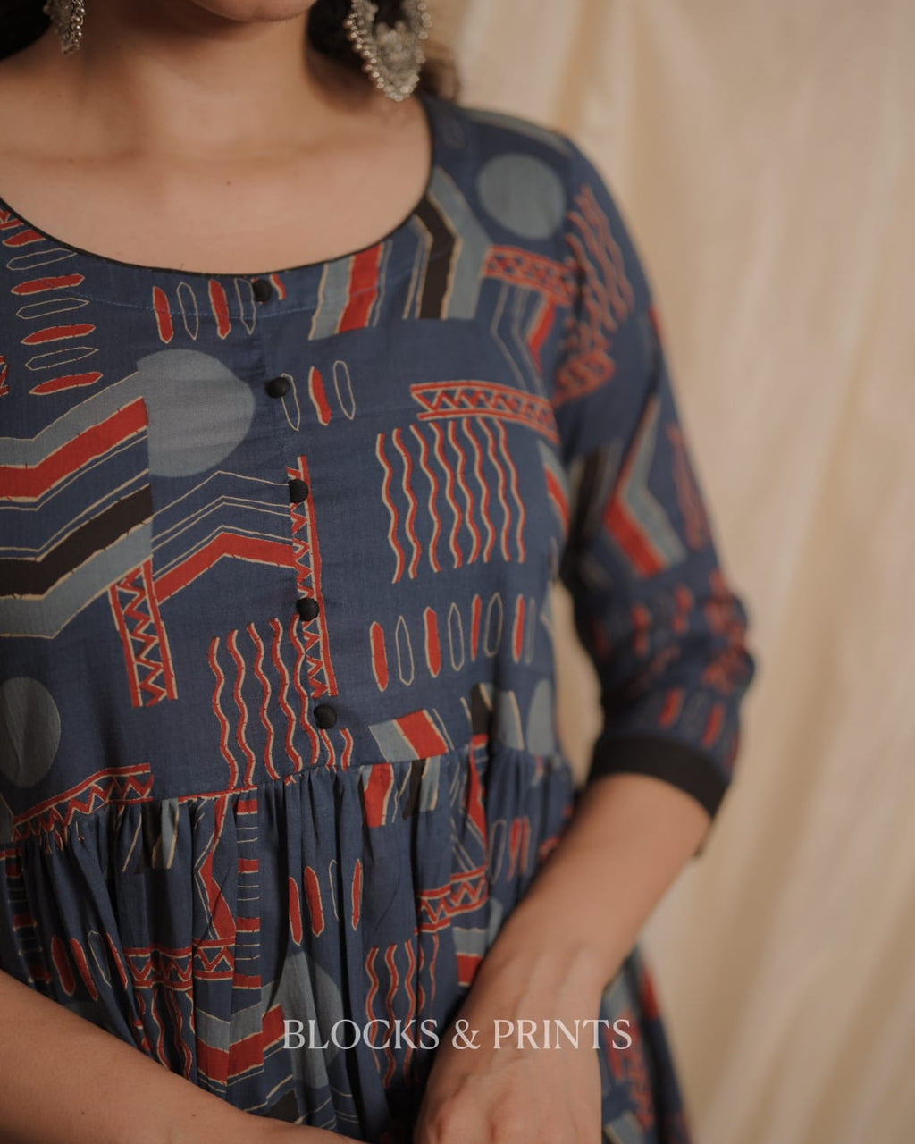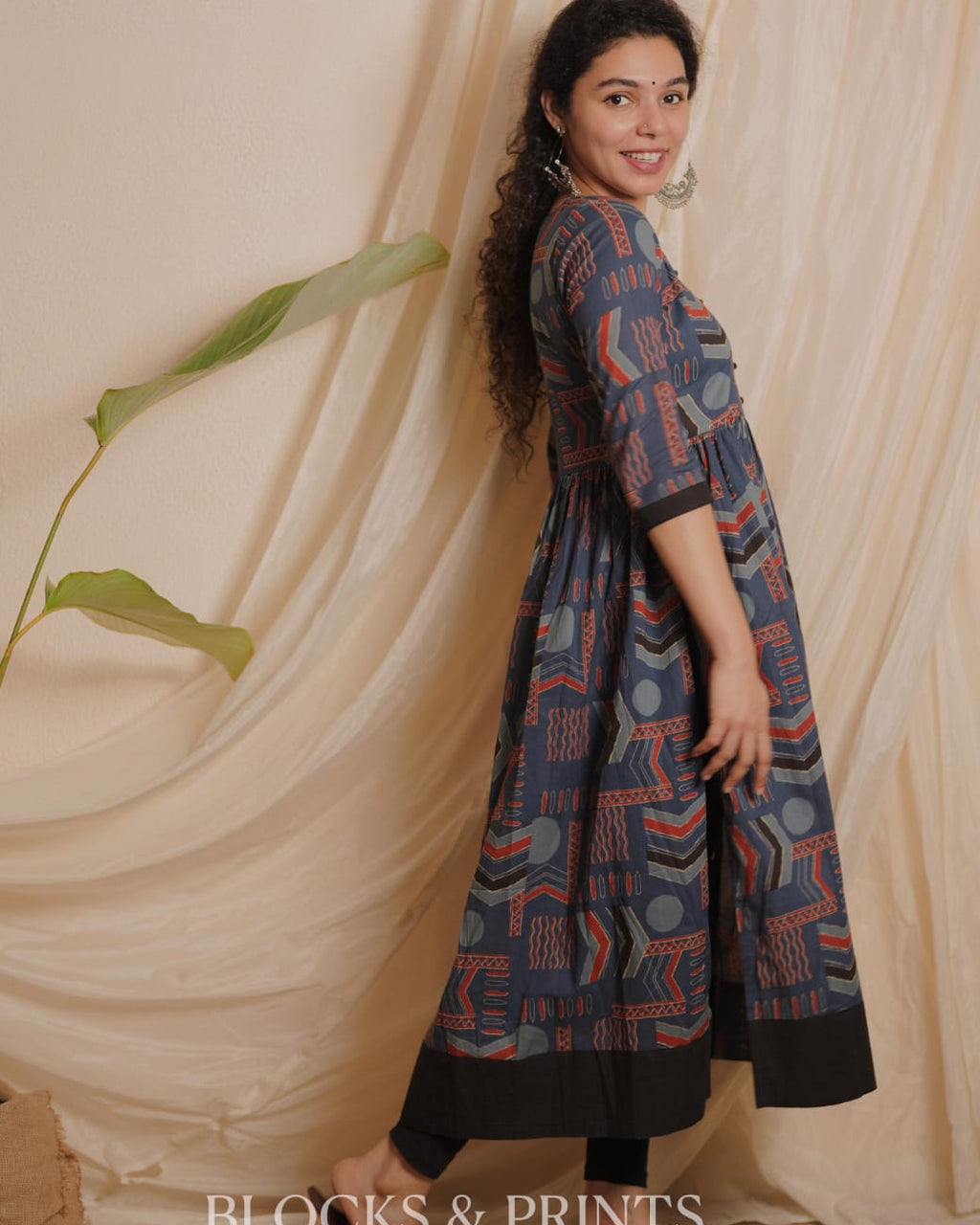Designer Printed cotton Slit kurthi with round neck. Piping added on neck. Pom poms on yoke for detailing. Gathers on waist. Plain patch on end of the sleeves and bottom of the kurthi.