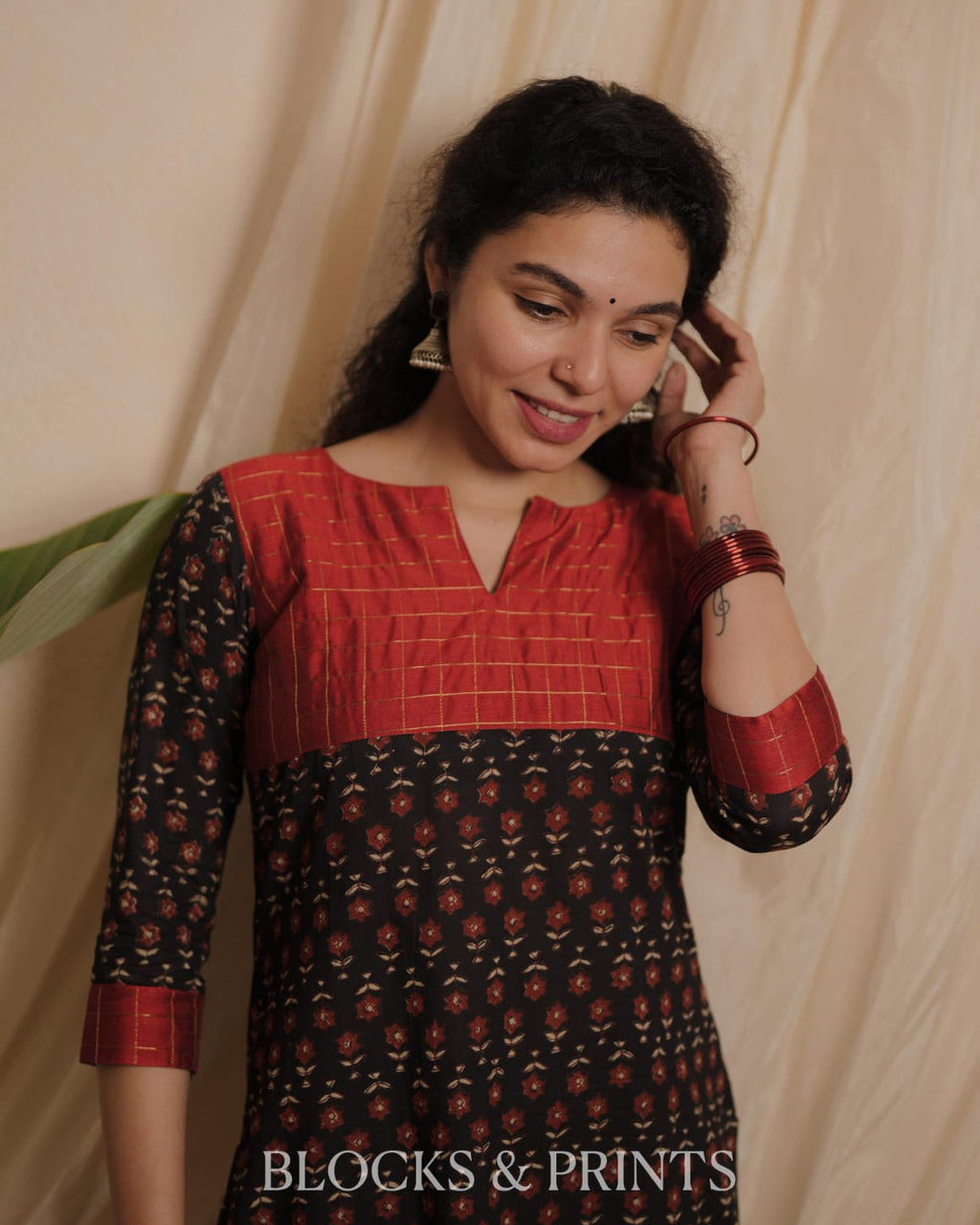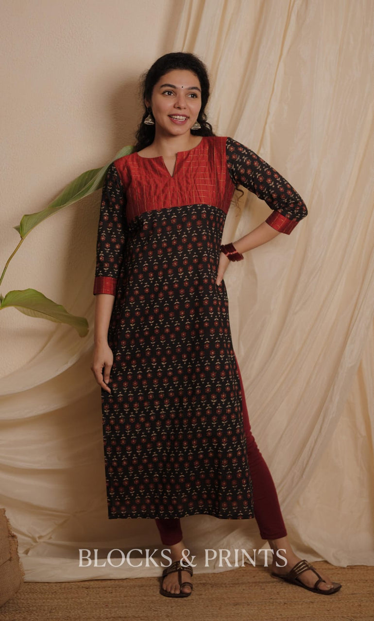 Printed Cotton Slit Kurthi with slit V neck. Cotton Silk woven check fabric on yoke. Plain Cotton silk patch at the sleeves end.