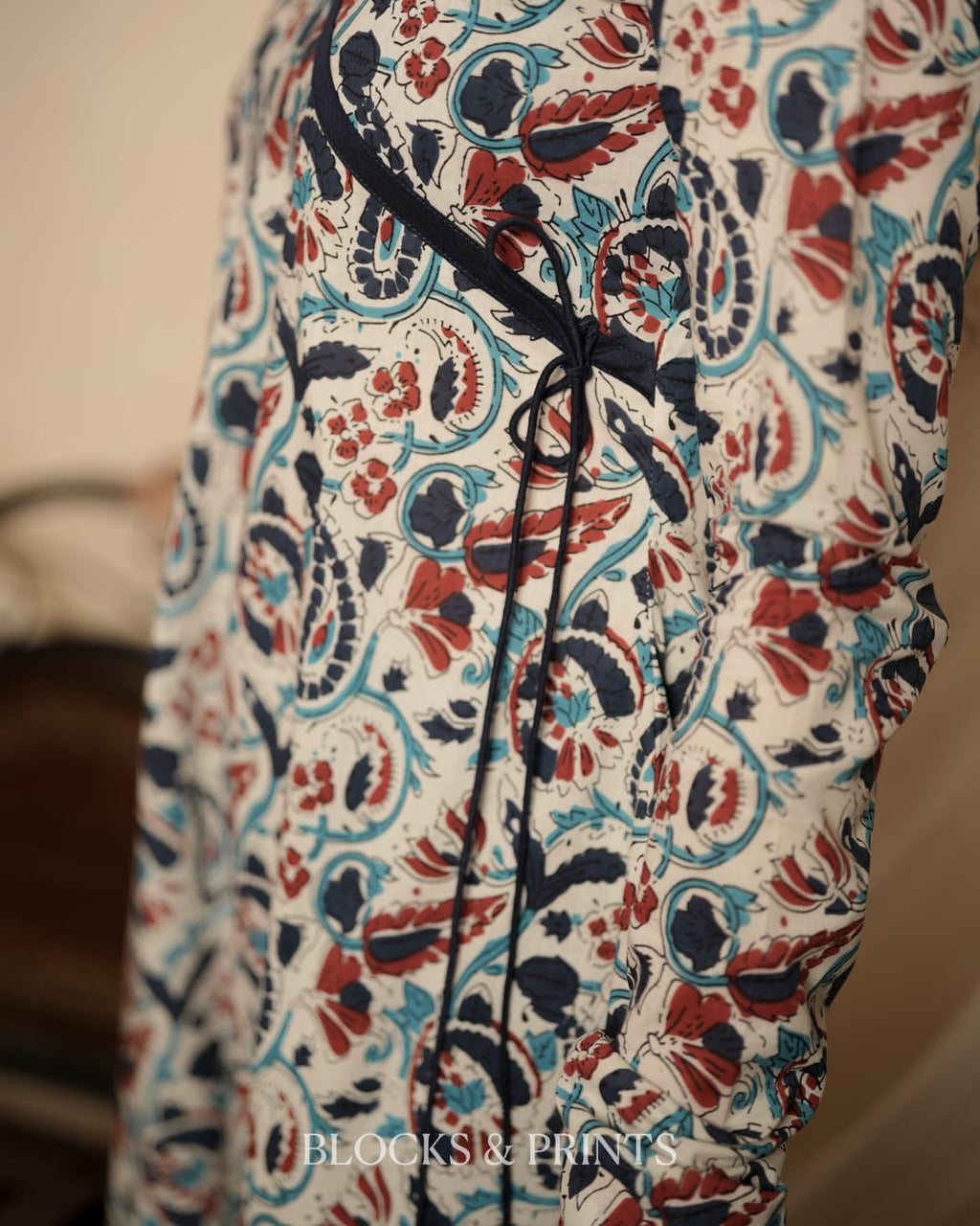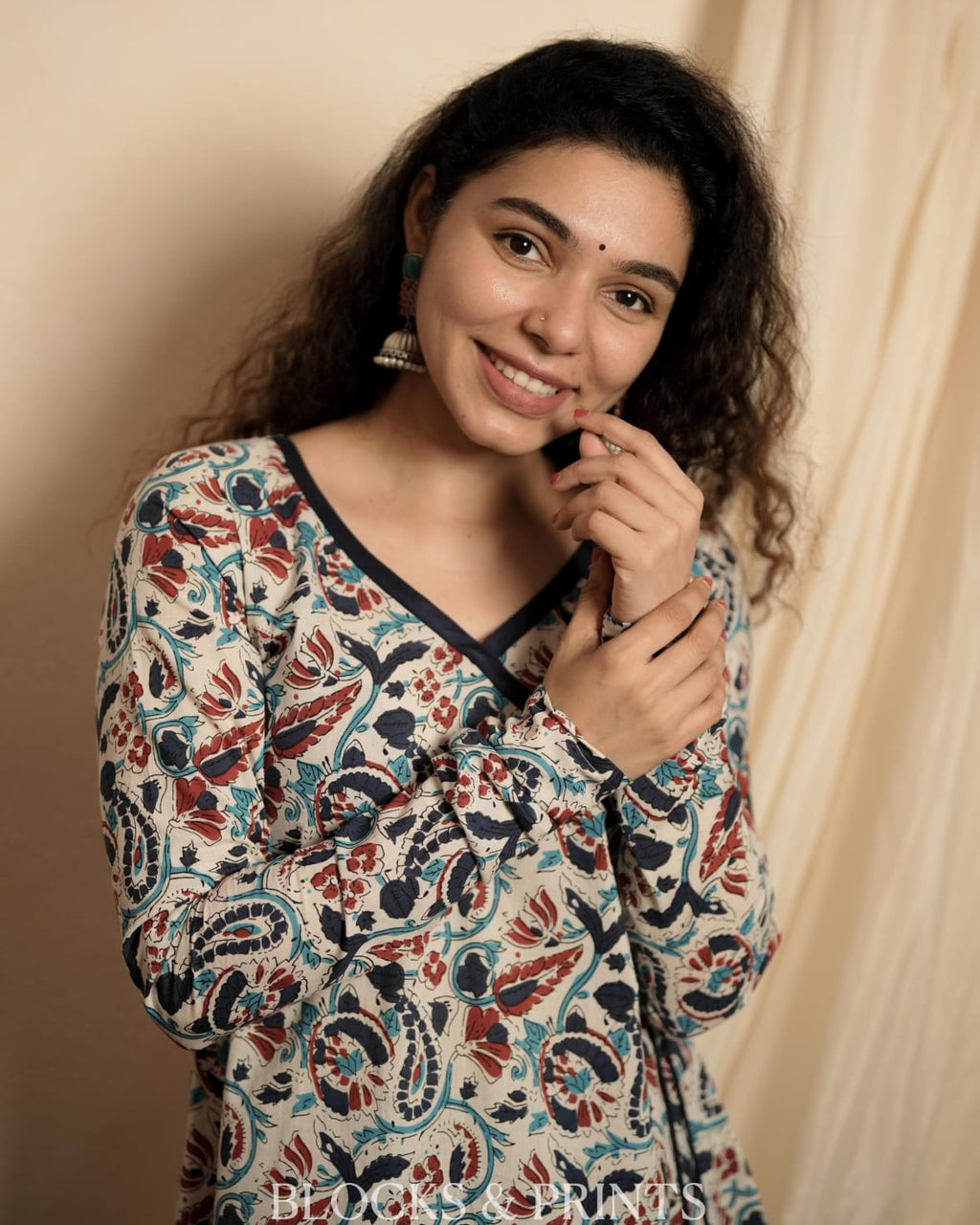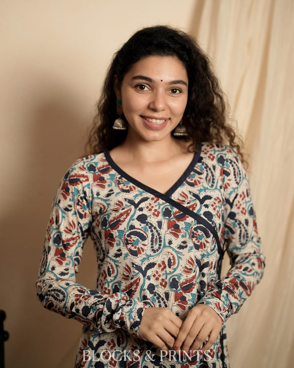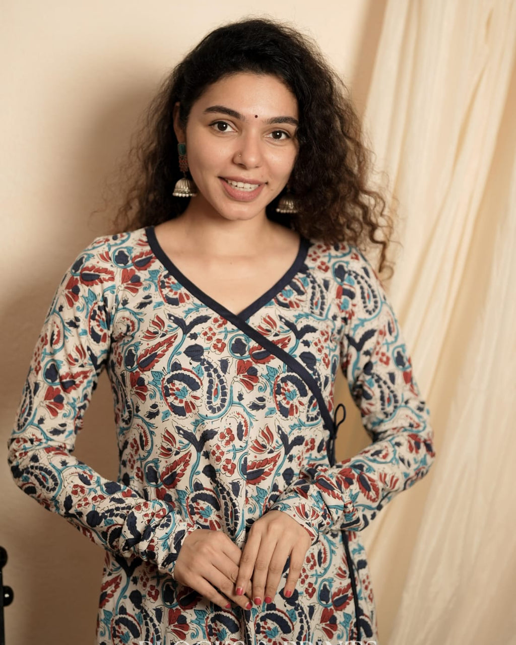 Paisley printed cotton A-line kurthi featuring a V-neck and an Angrakha-style pattern with hanging tassels. Designed with churi sleeves to enhance the overall elegance of the kurthi.