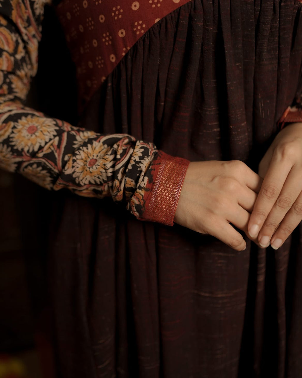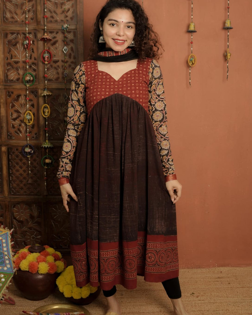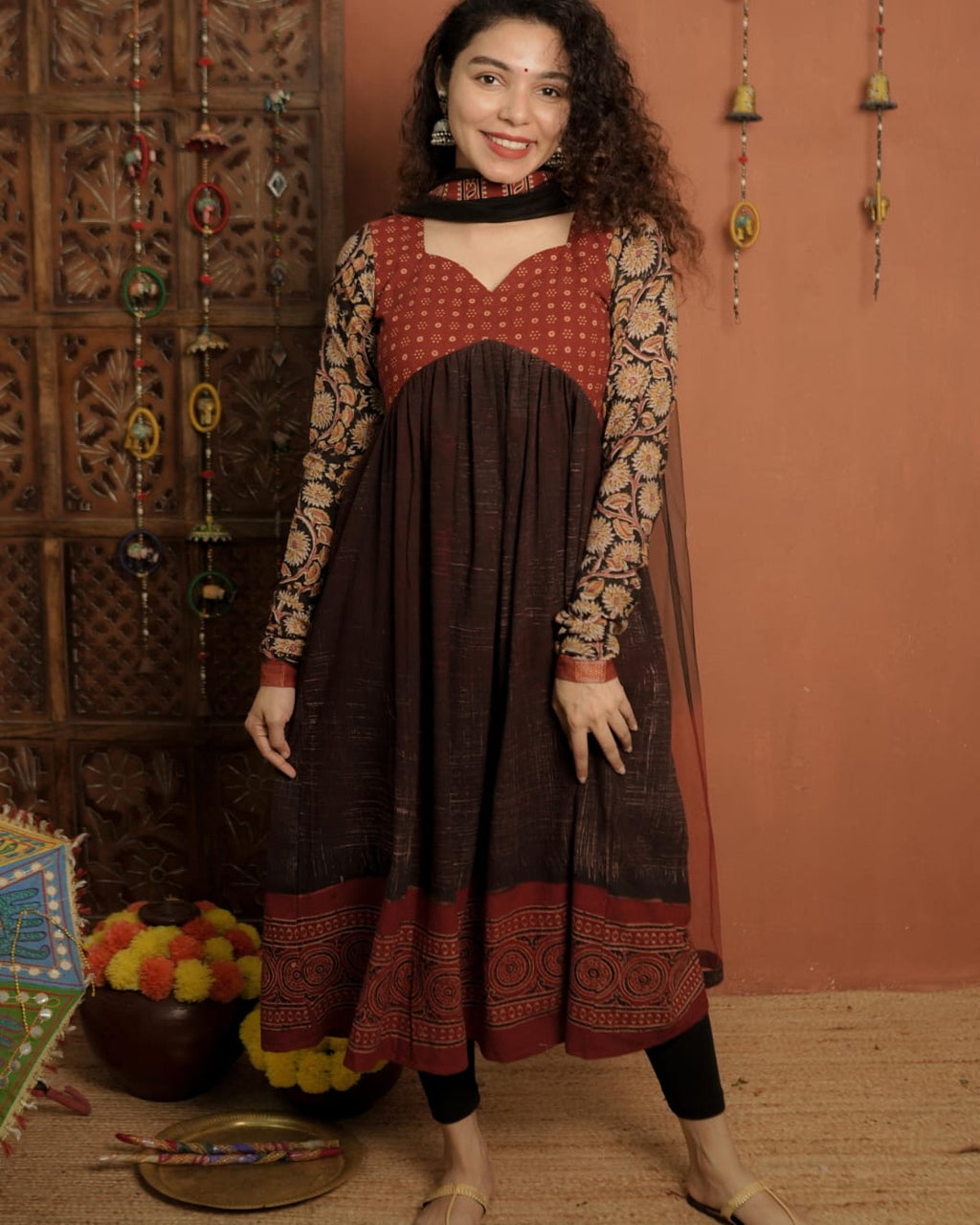 Top - Designer Brush Effect Printed Ajrakh Alia Cut Kurthi with Sweet Heart Neck pattern, Printed Ajrakh patch on Yoke and Kalamkari Printed Cotton Sleeves with zeri border.