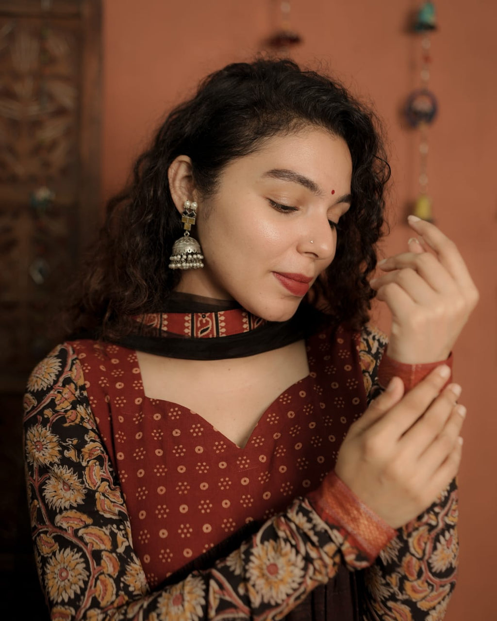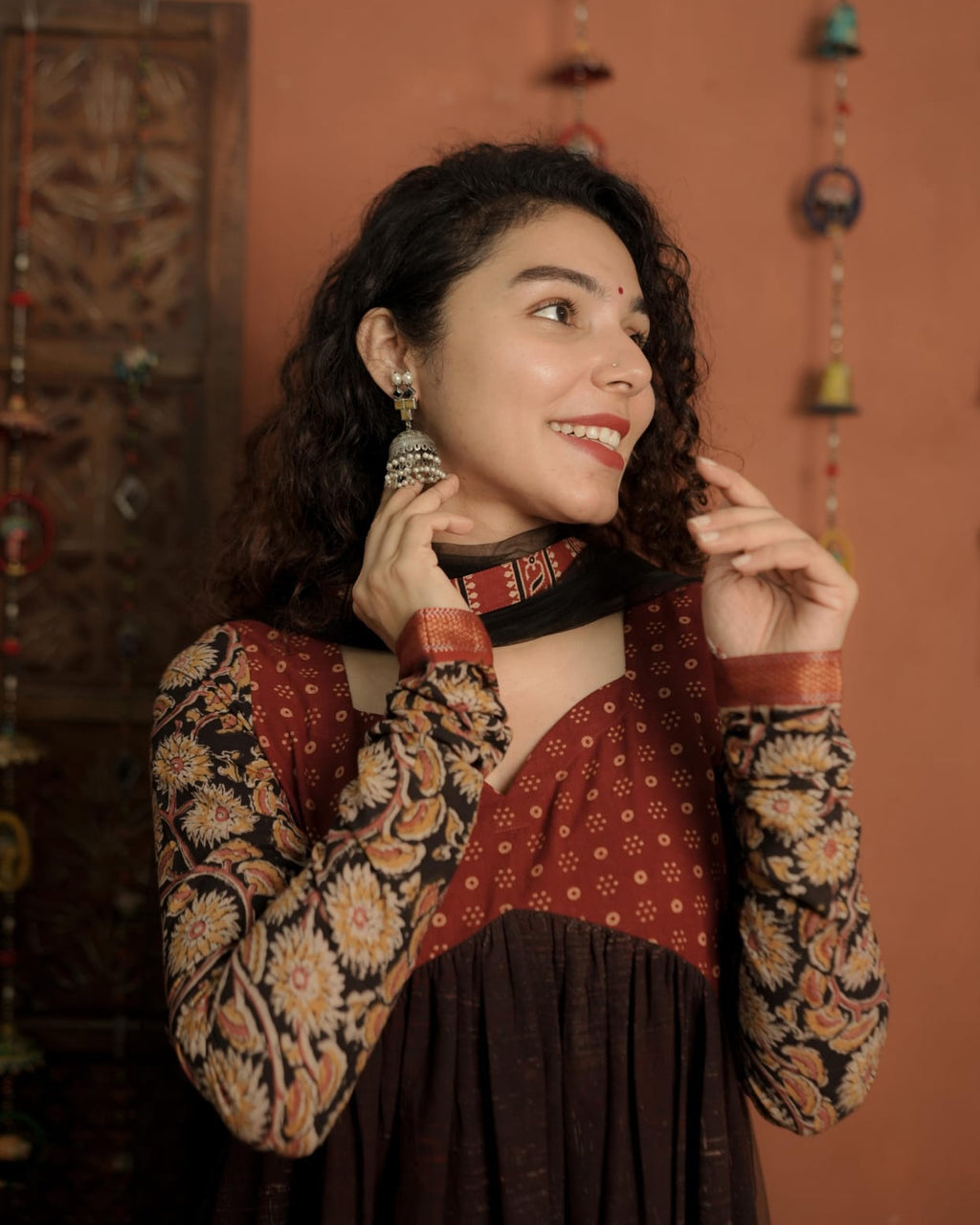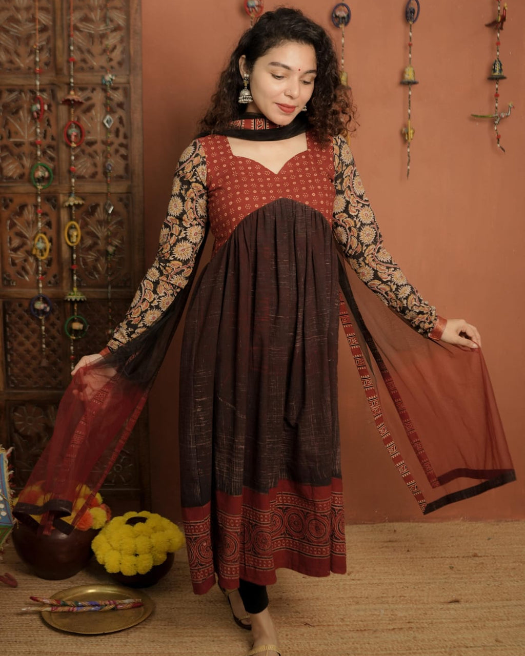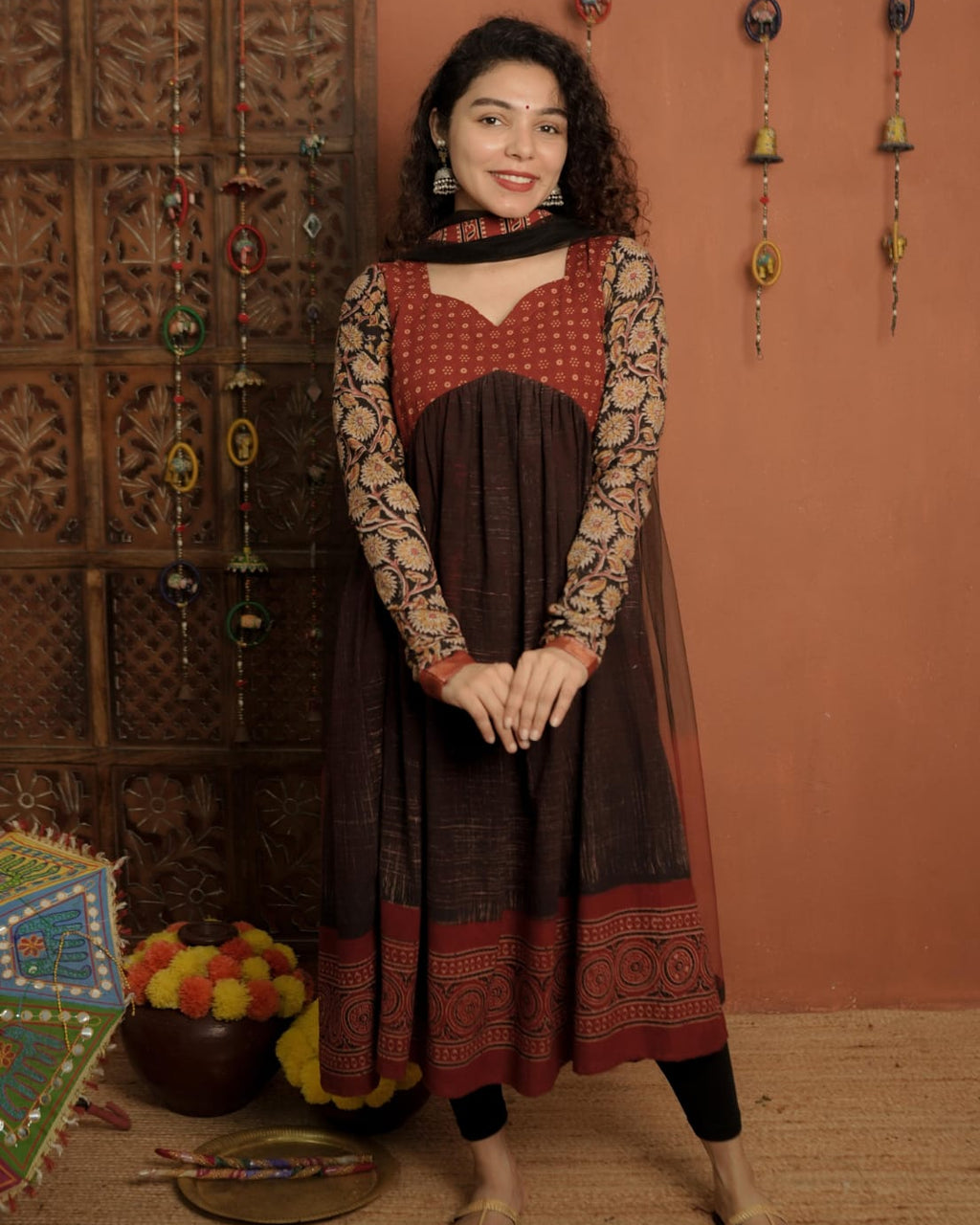 Top - Designer Brush Effect Printed Ajrakh Alia Cut Kurthi with Sweet Heart Neck pattern, Printed Ajrakh patch on Yoke and Kalamkari Printed Cotton Sleeves with zeri border.
