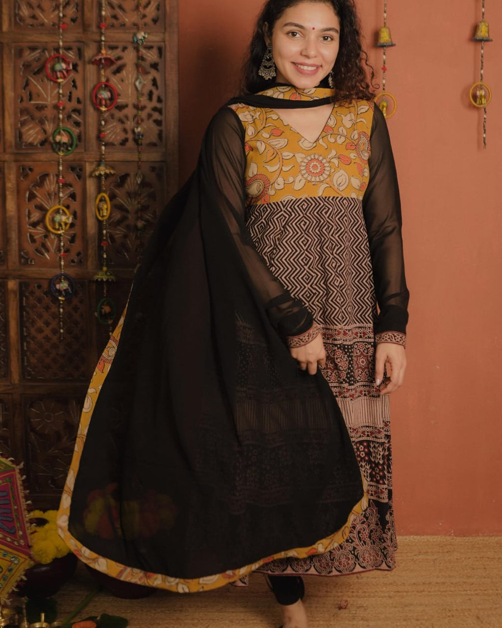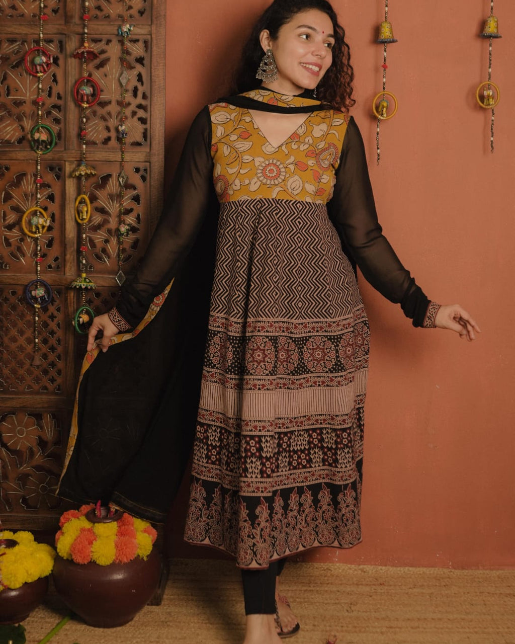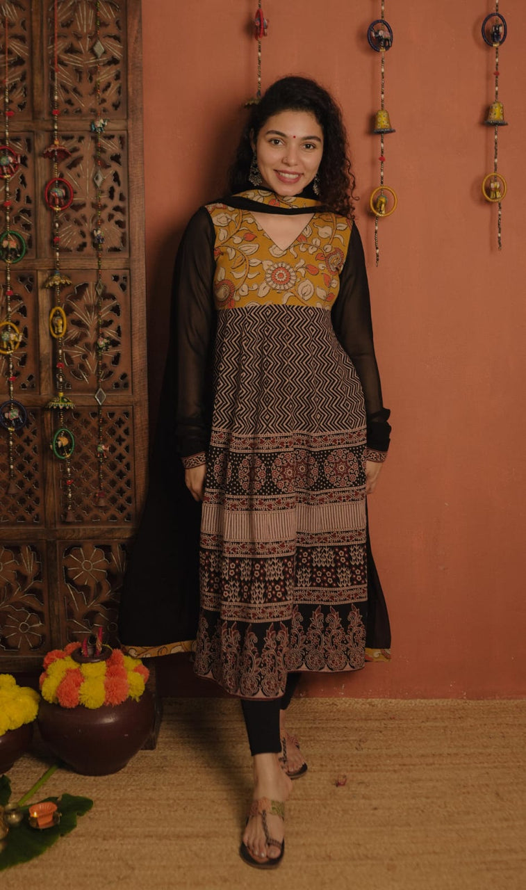 Top - Designer style Ajrakh A-Line Kurthi with 20 plus panel kallis. Kalamkari modal fabric patch on Yoke and Georgette Sleeves with Ajrakh patch at the End. Piping on neck for Detailing.