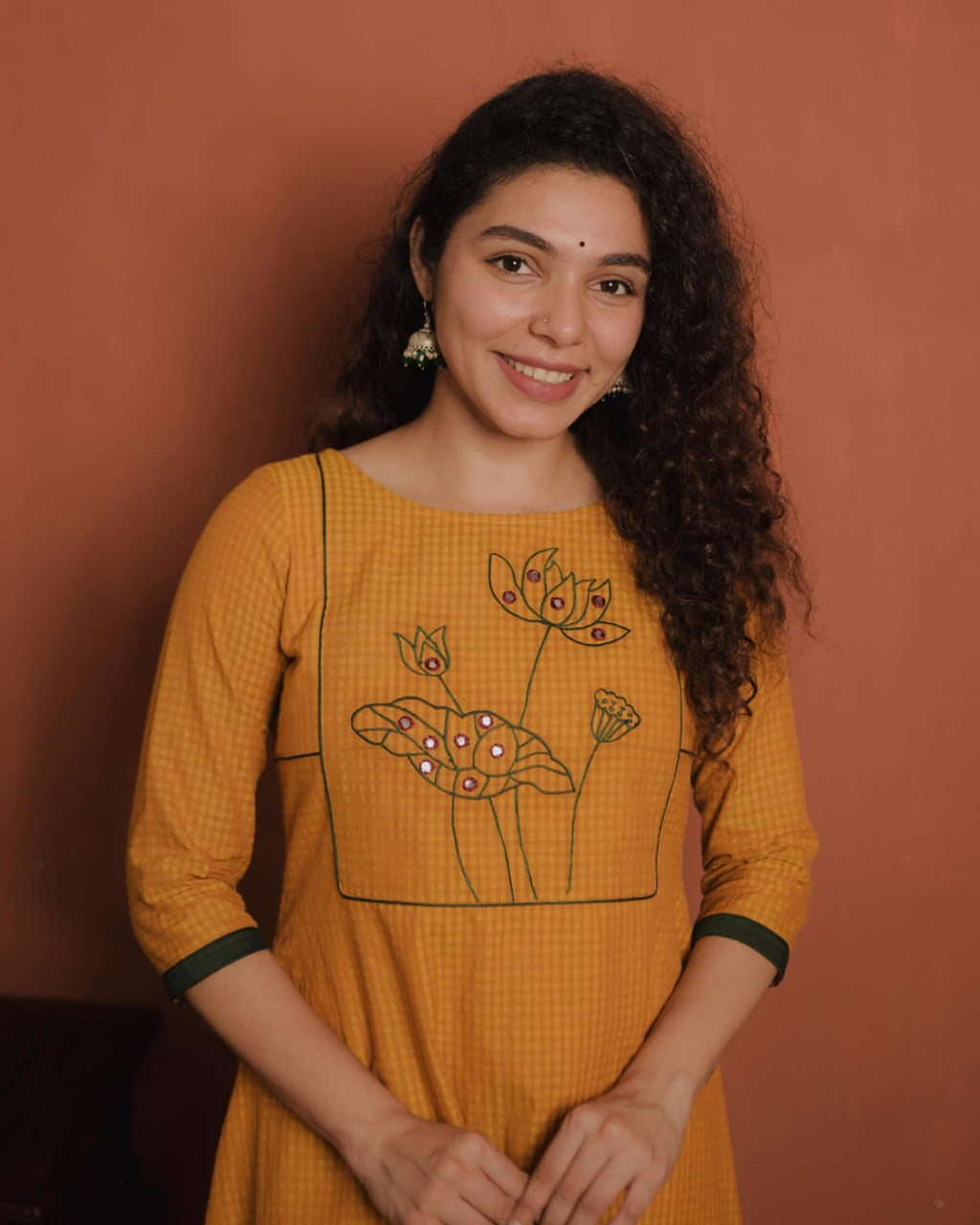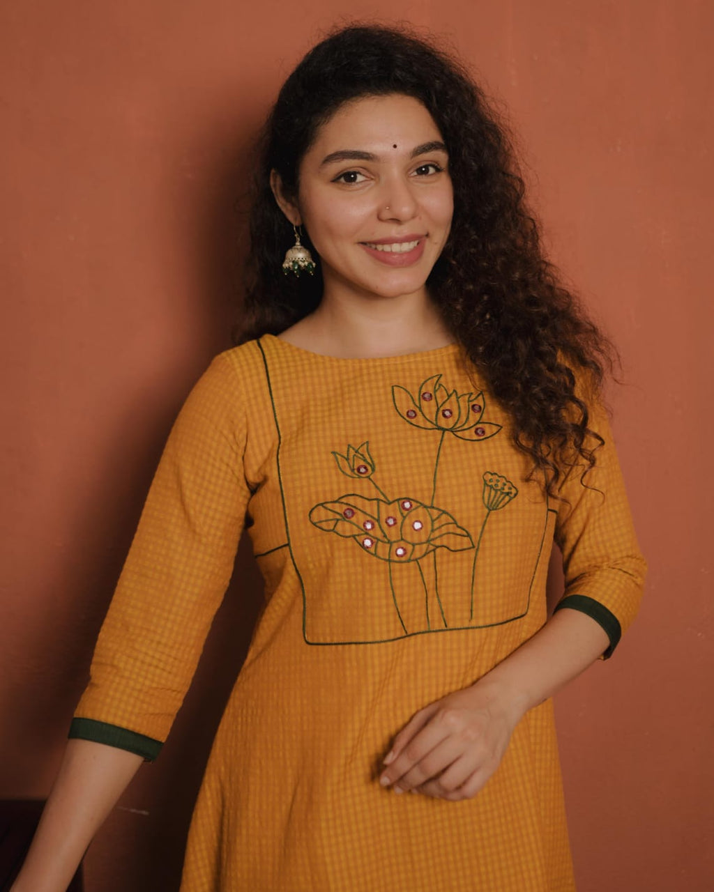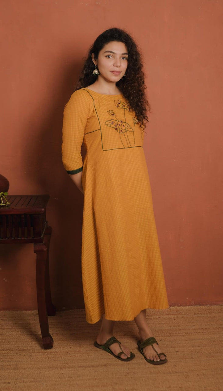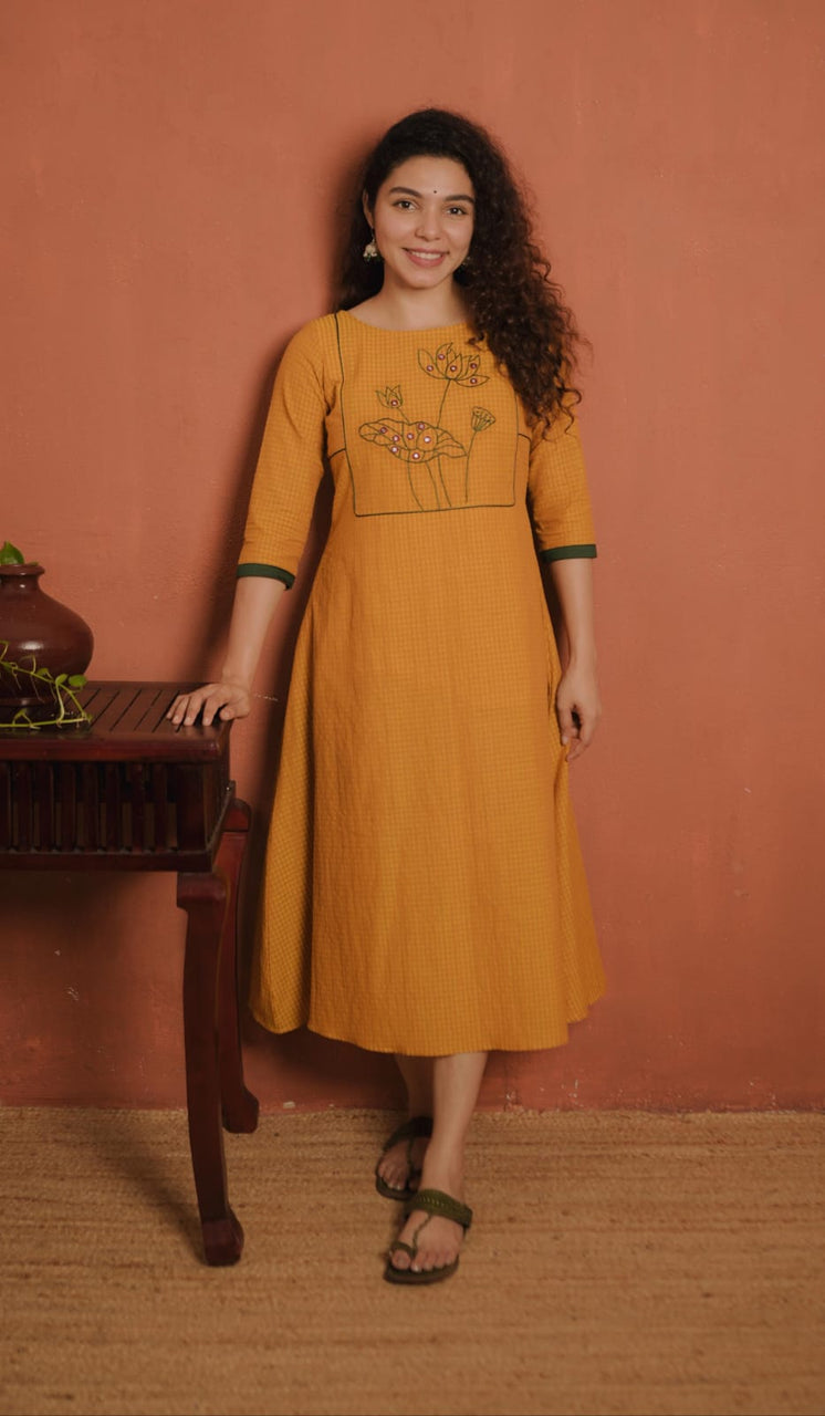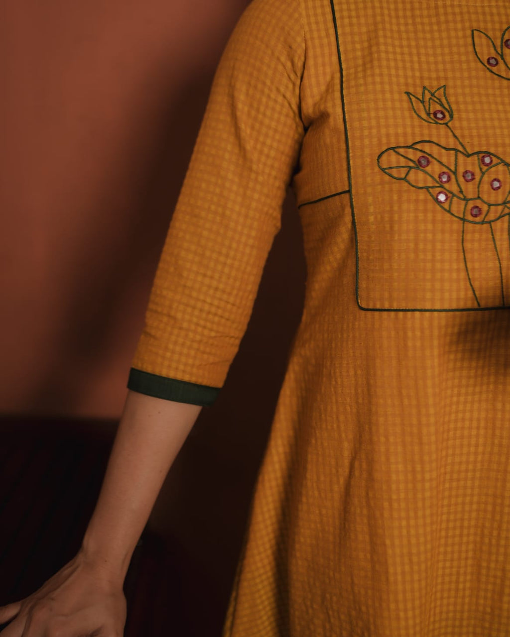 Dobby check Cotton A-Line dress with boat neck. Embroidery work on yoke. Mirror work added for detailing. Piping on sides and yoke border. Plain patch at the sleeves end.