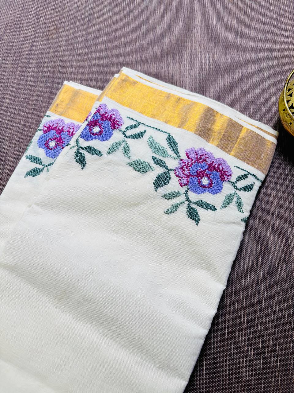 Kerala Cotton Saree with Embroidery Floral Prints. Rich Embroidery floral motifs on the borders and pallu.