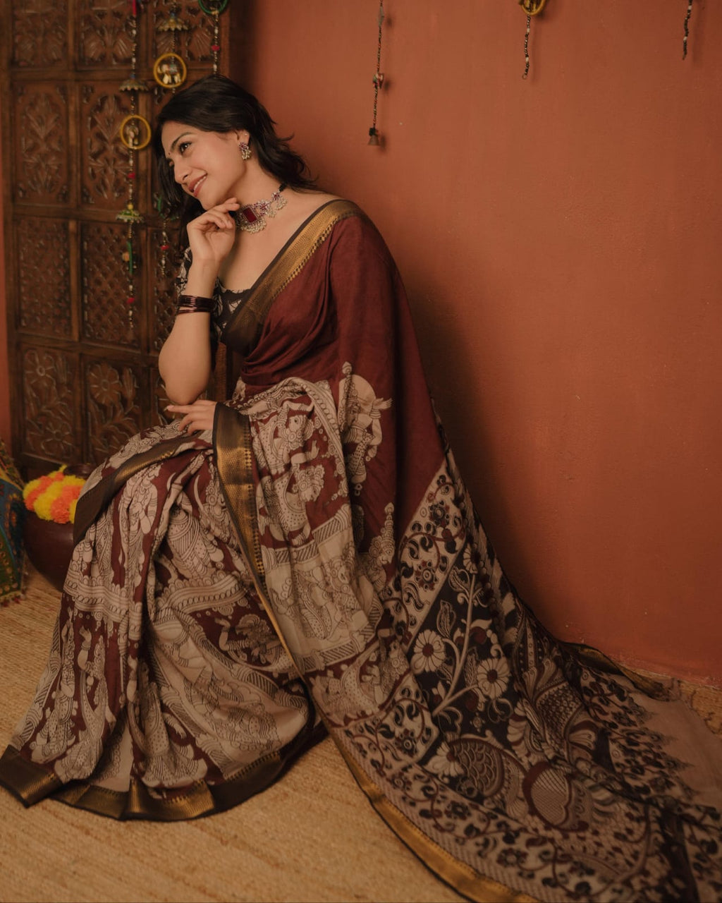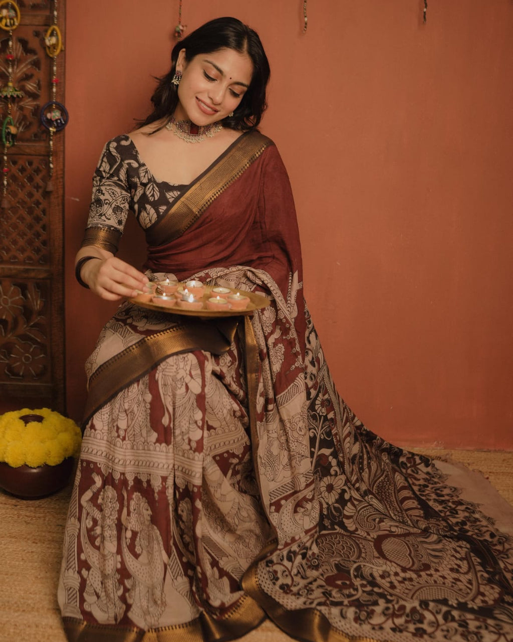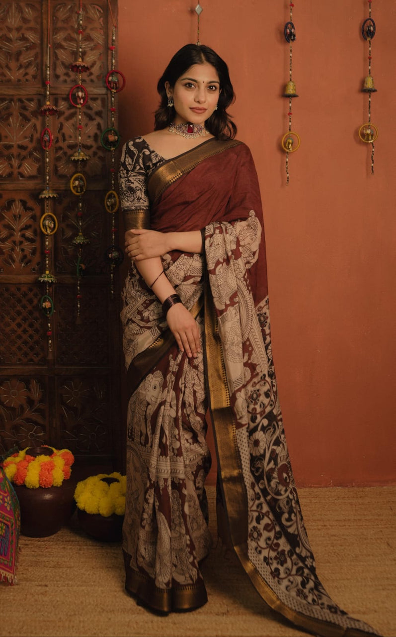 Blouse :- Handloom Soft Silk in Running Kalamkari Print with Kanchi Border. (Unstitched Blouse)