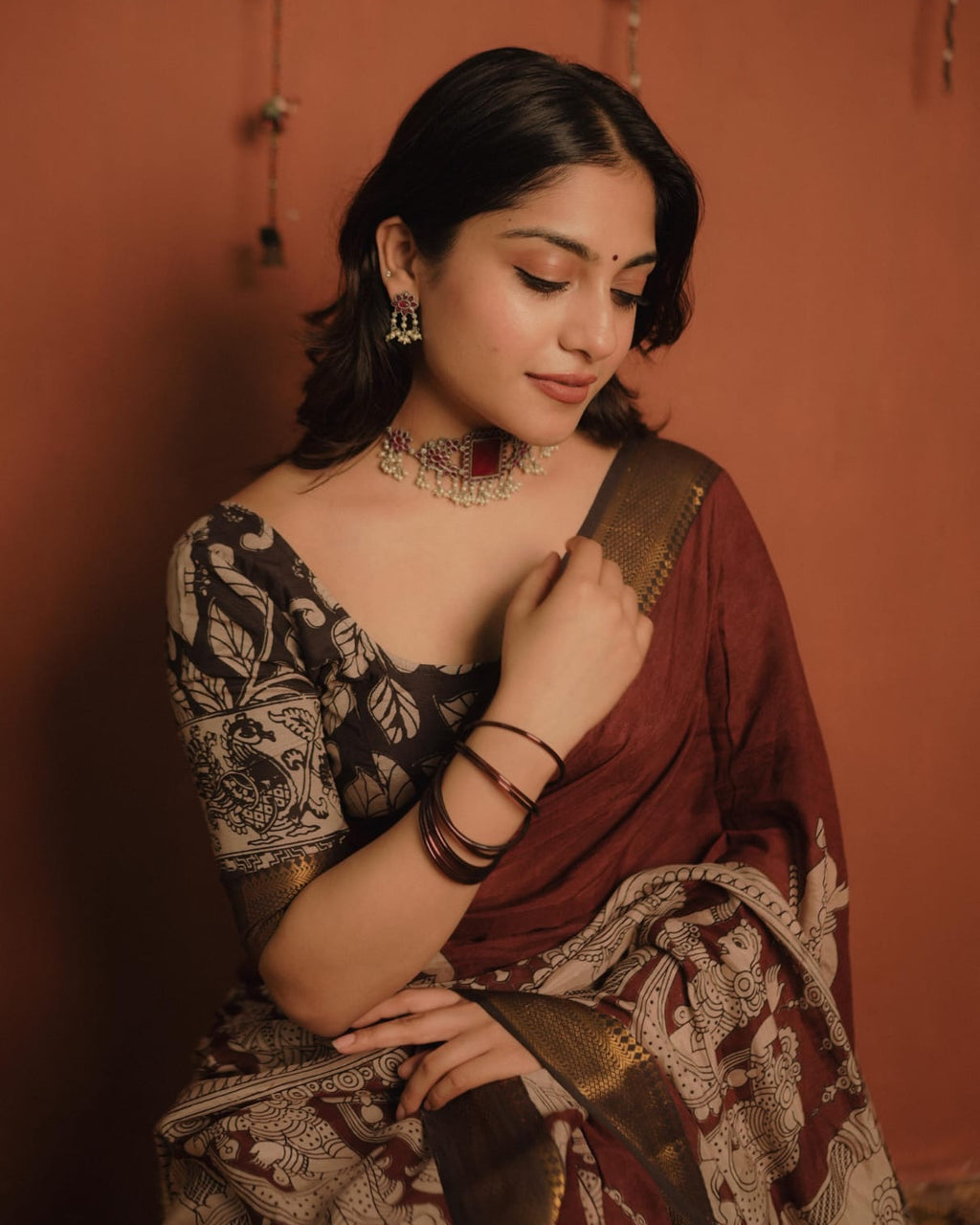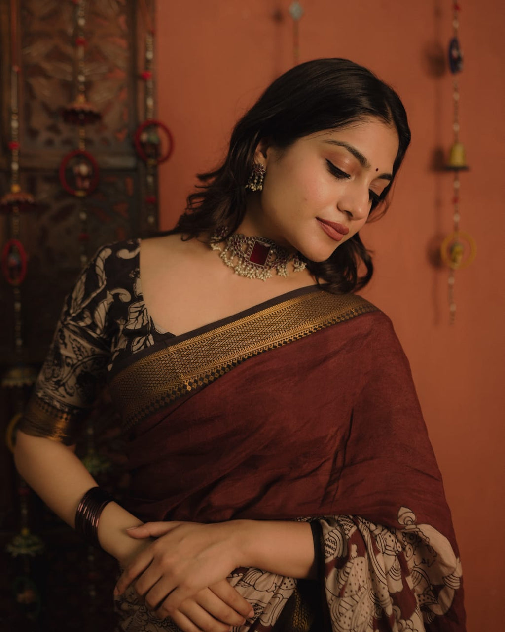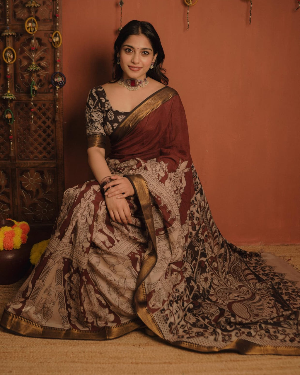 Blouse :- Handloom Soft Silk in Running Kalamkari Print with Kanchi Border. (Unstitched Blouse)