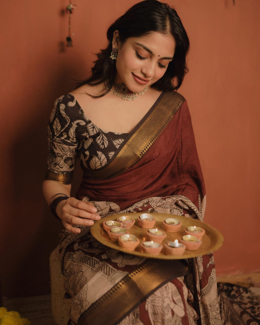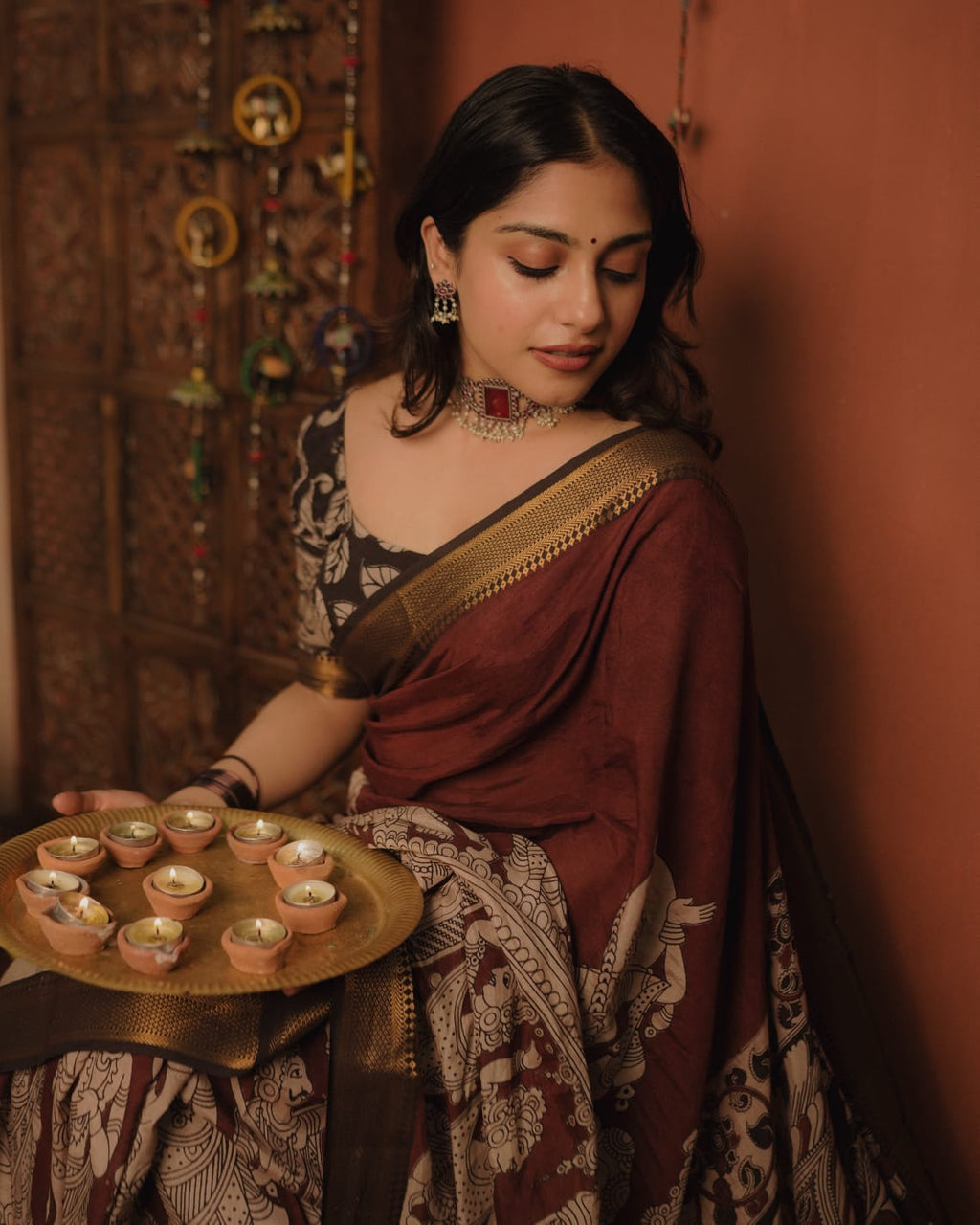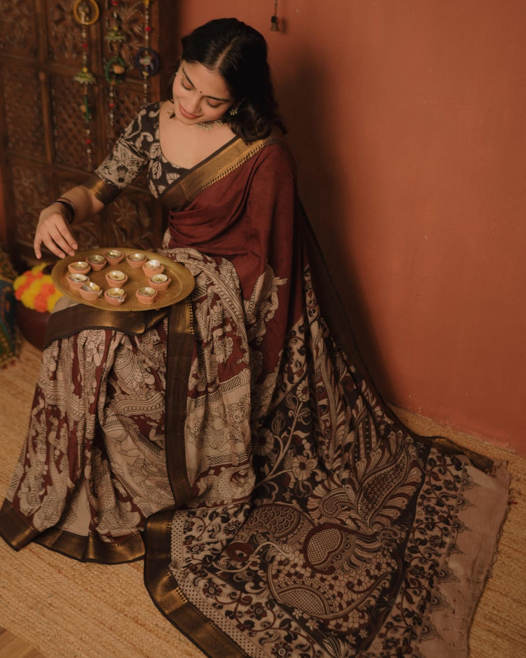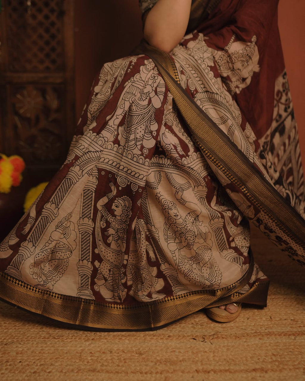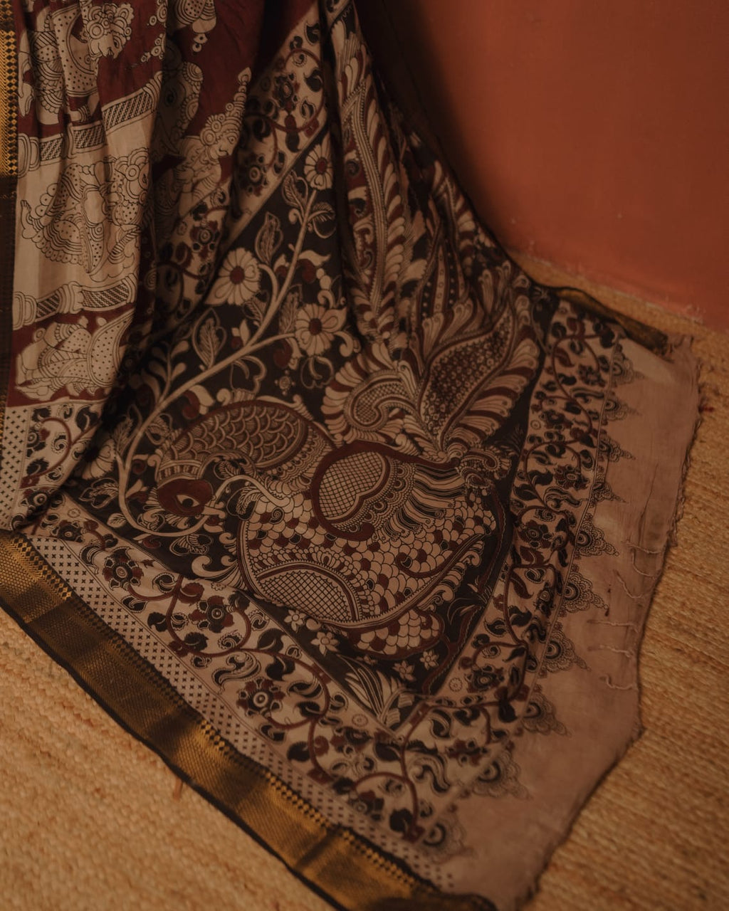 Handloom Soft Silk Saree in Designer Kalamkari Print with Silver Bavanji Zeri Border
