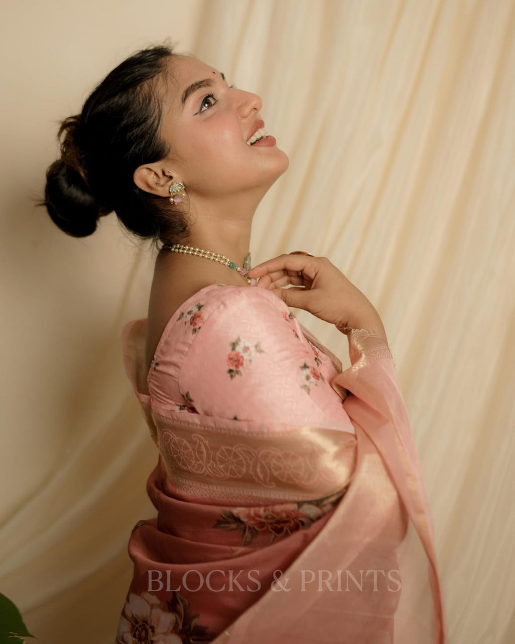 Blouse :- Floral print Cotton silk in Peach Color (Unstitched)