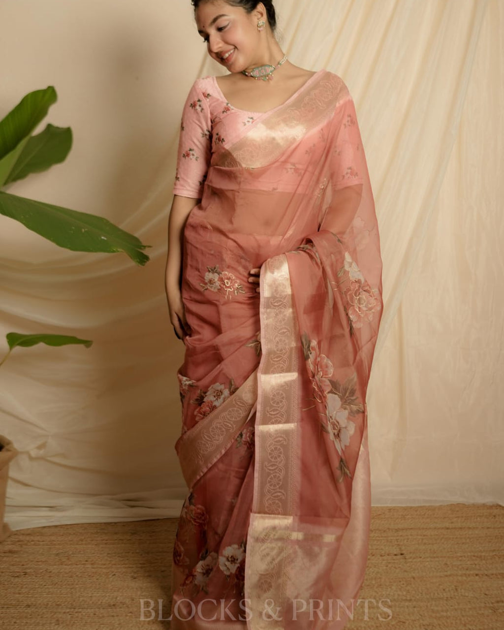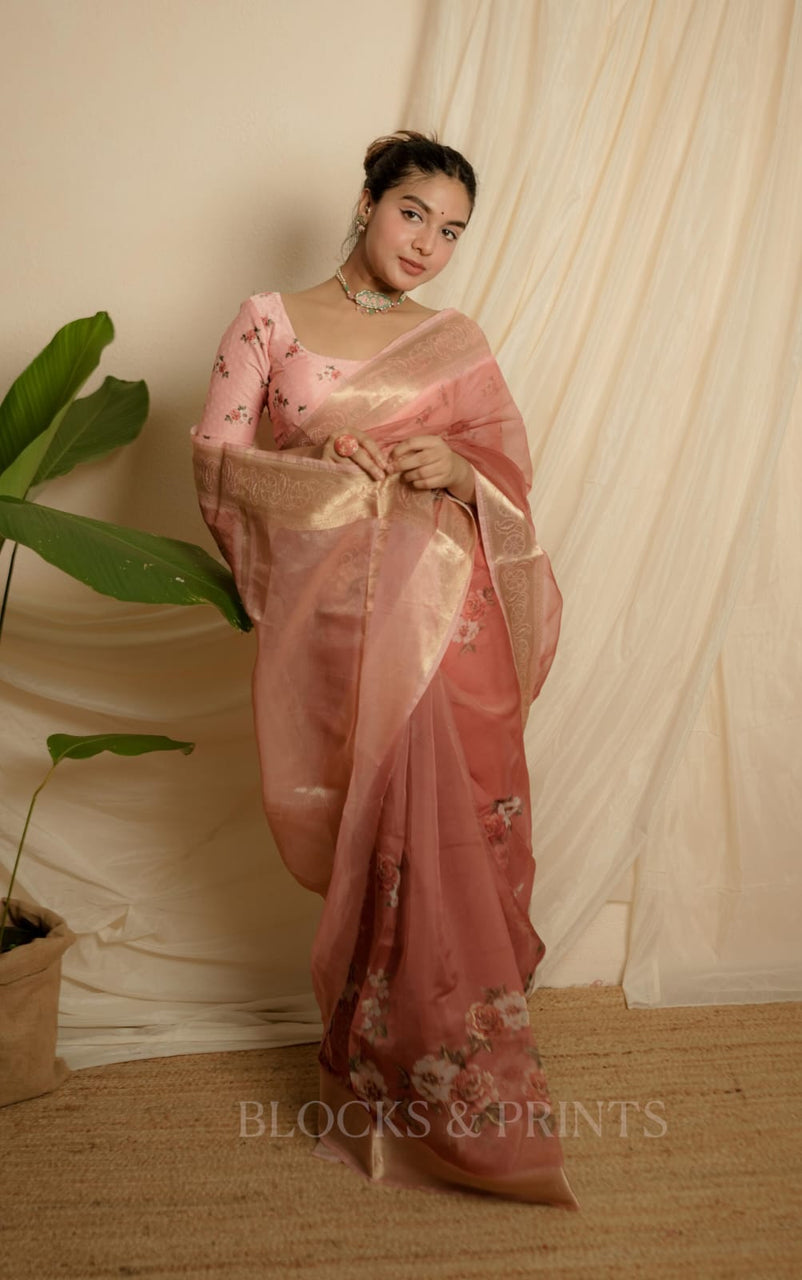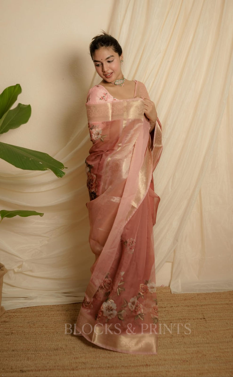 Floral printed Organza silk saree with Zeri Border.