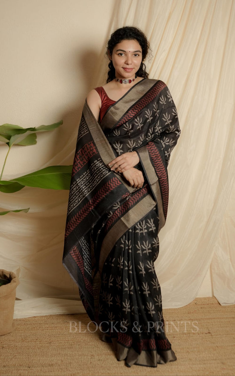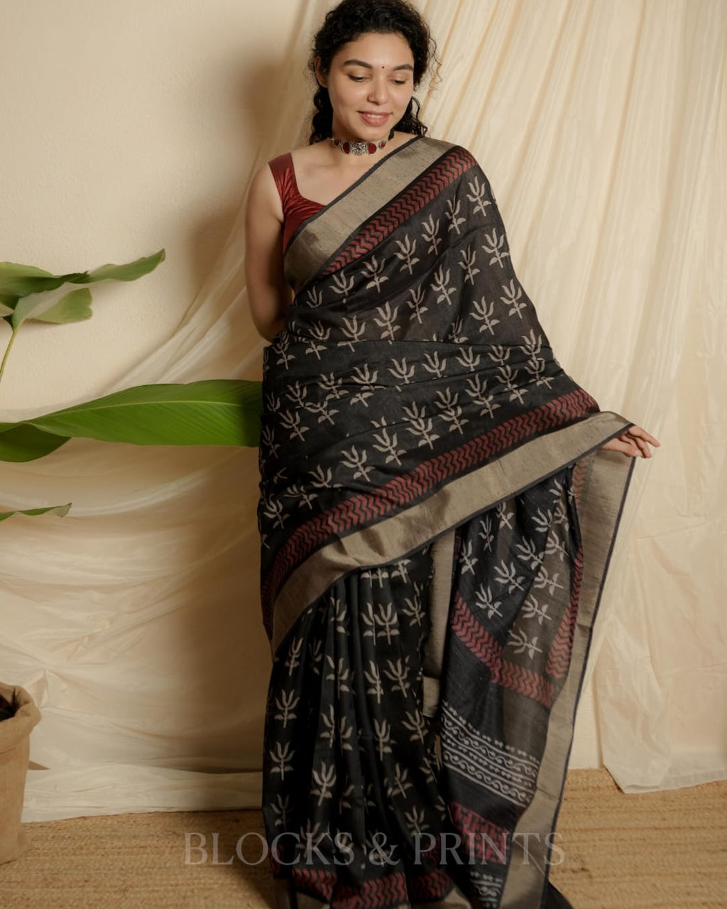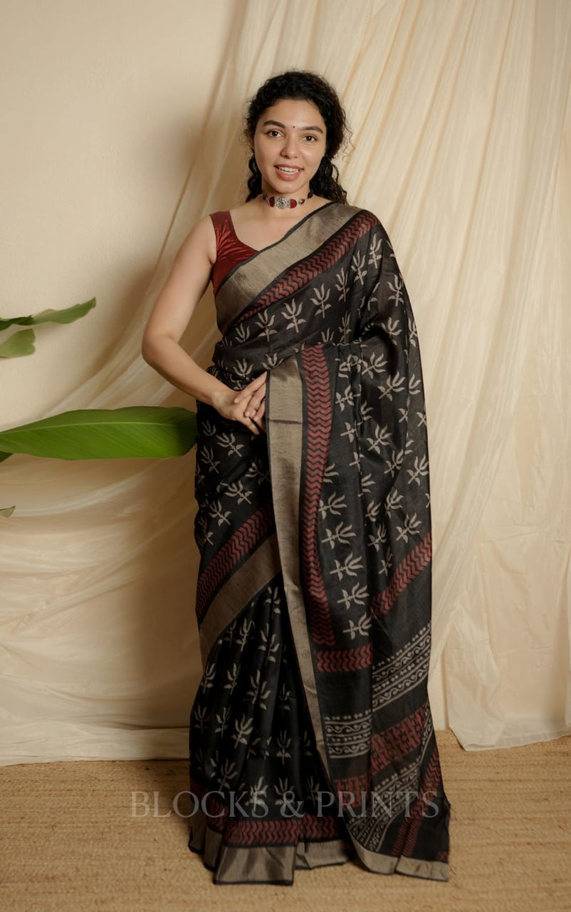 Blouse :- Semi Raw Silk in black color with Border. (Unstitched Blouse)