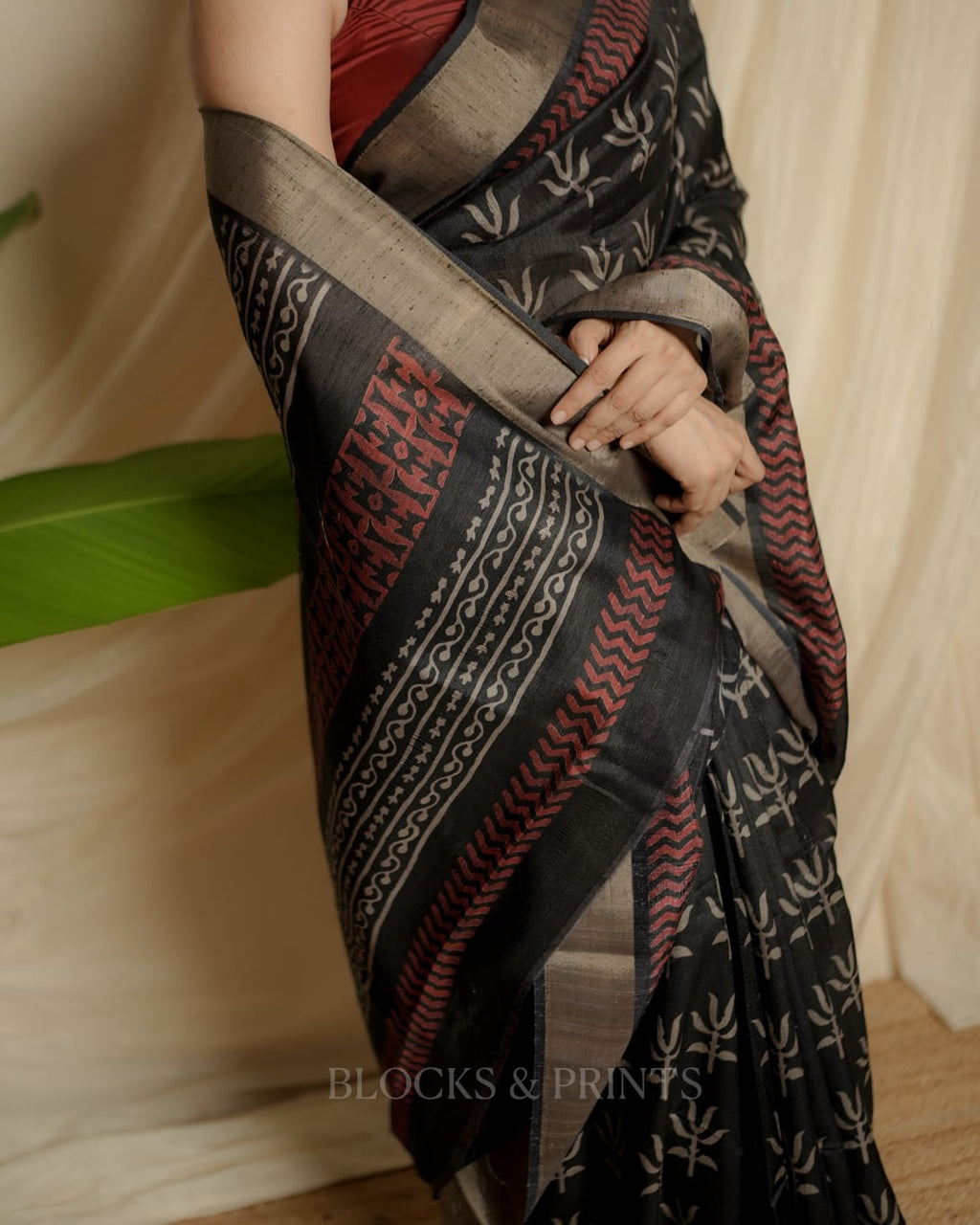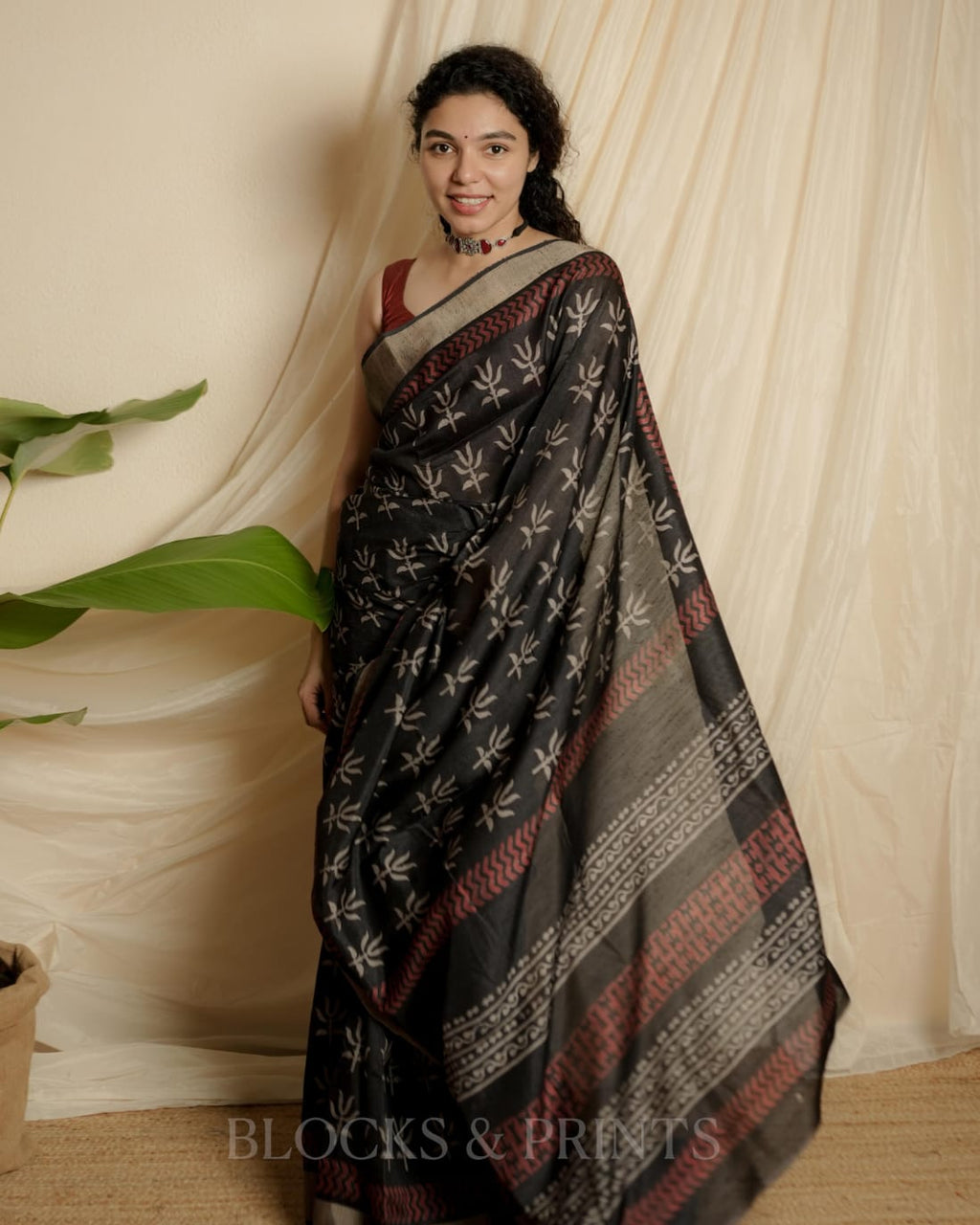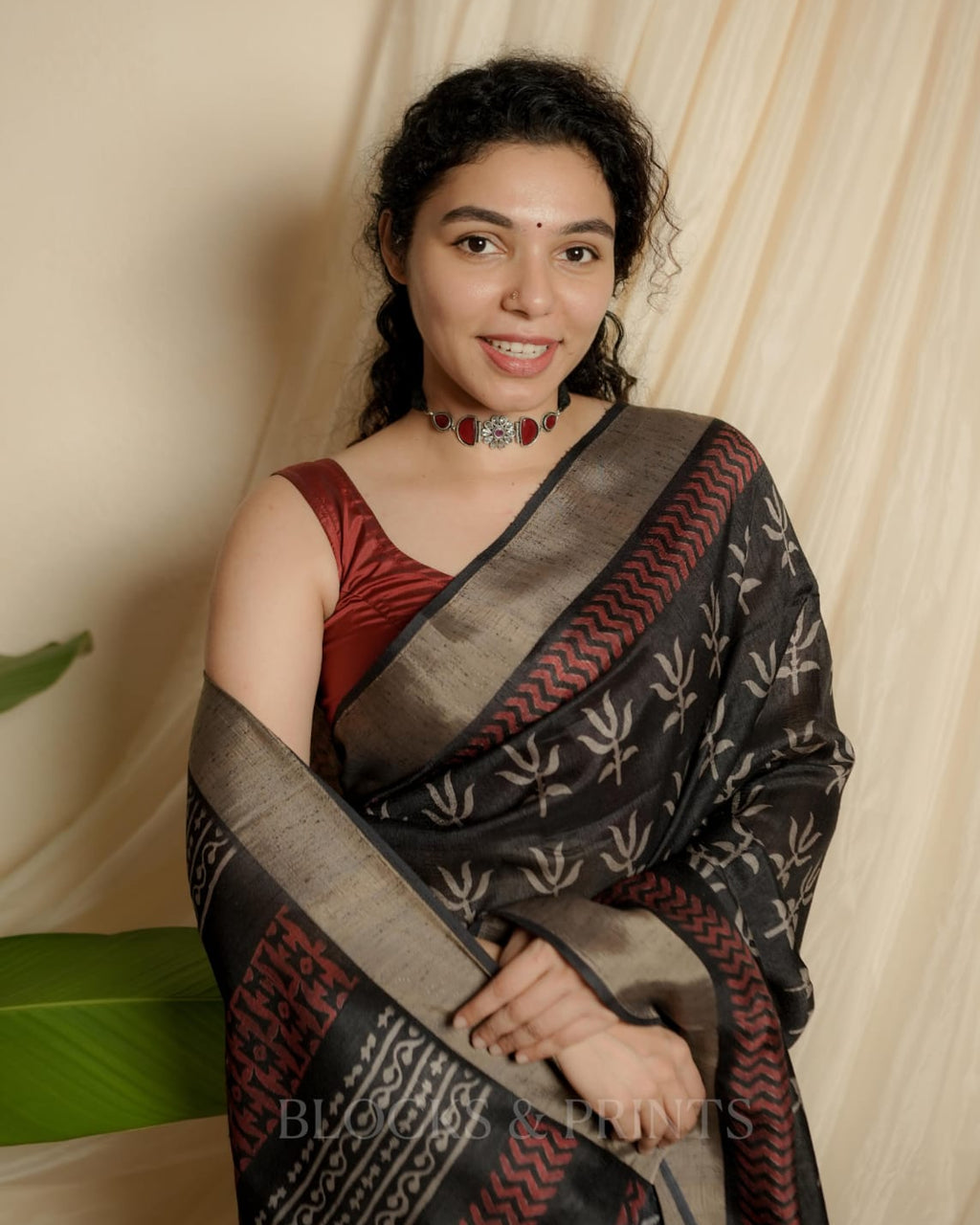 Blouse :- Semi Raw Silk in black color with Border. (Unstitched Blouse)
