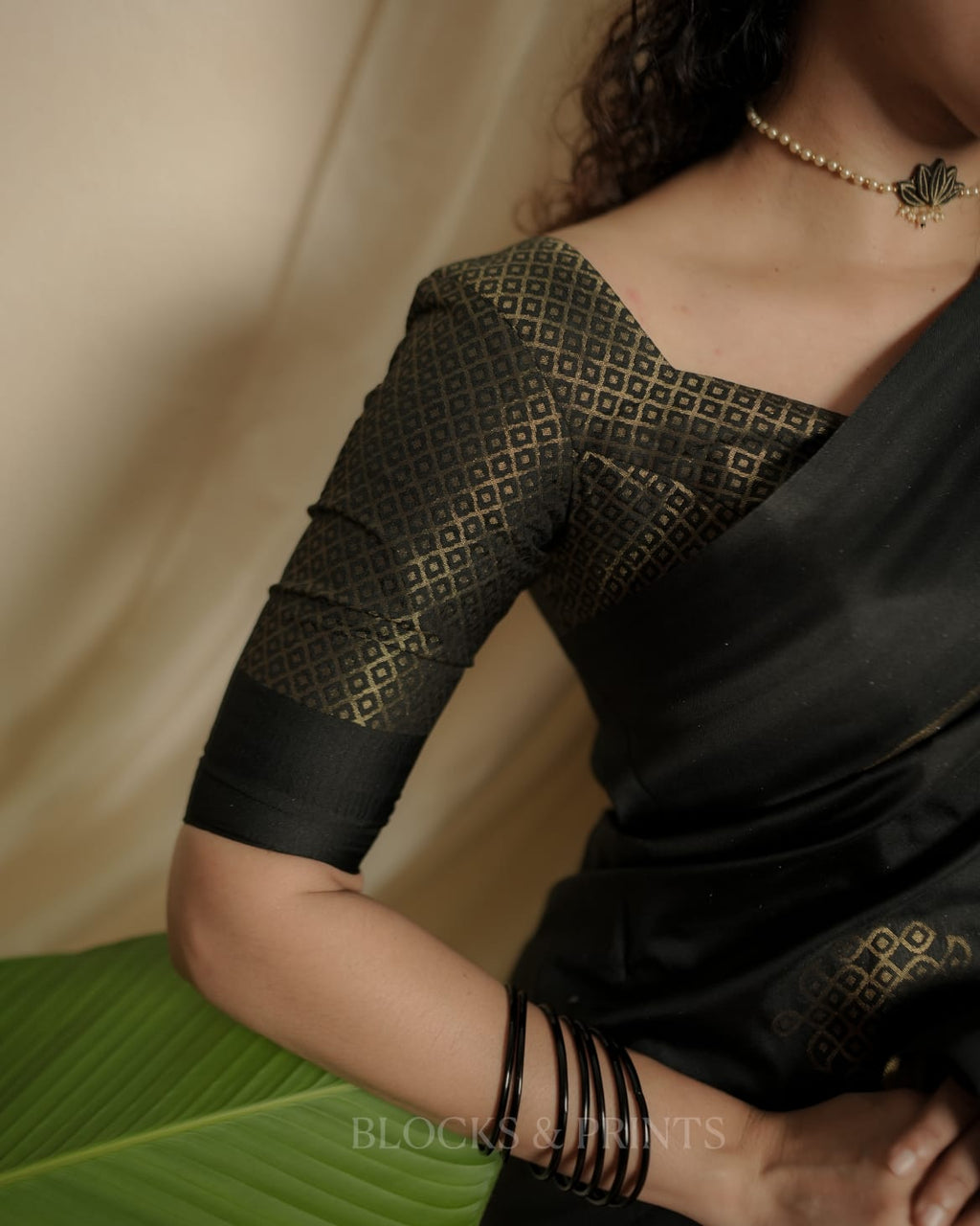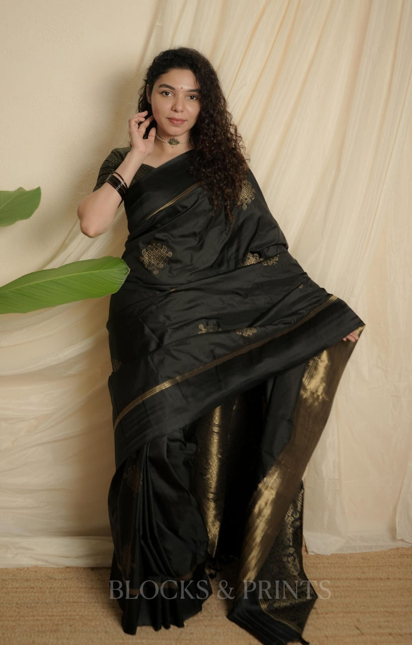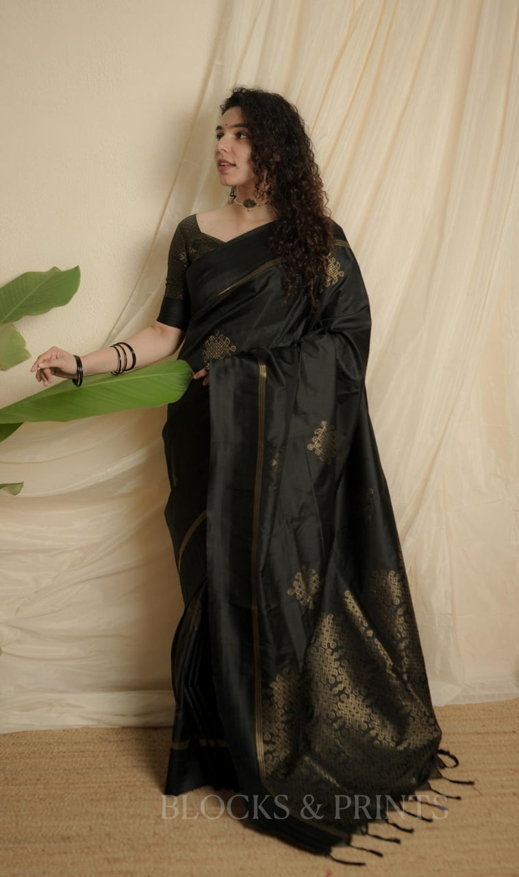 Blouse :- Heavy woven all over Golden zeri in Black Color. (Unstitched) same as in the pic.