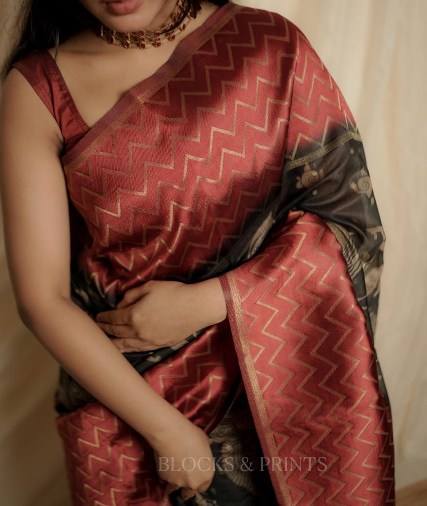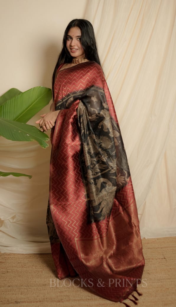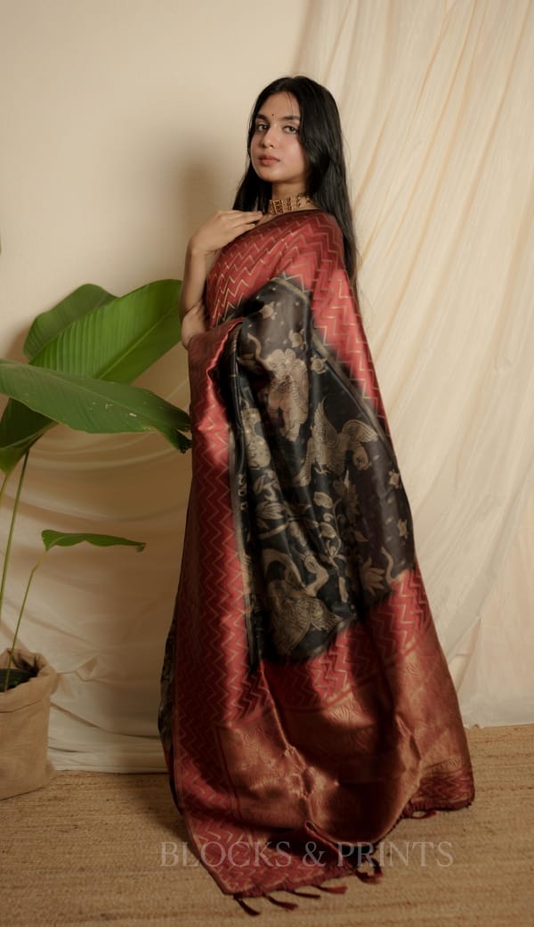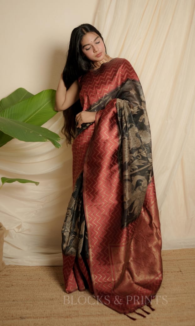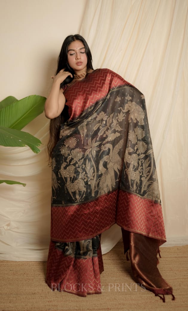 Kanchi Silk Saree in Kalamkari print with all over woven butti and Contrast Color Border with woven zeri. Heavy Woven Zeri work at the pallu.