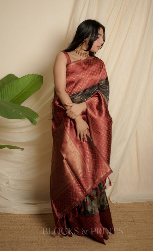 Blouse :- Kanchi Silk in Red color with golden woven butti.