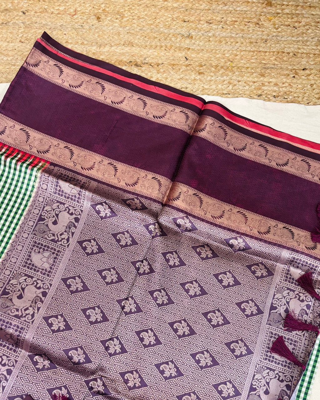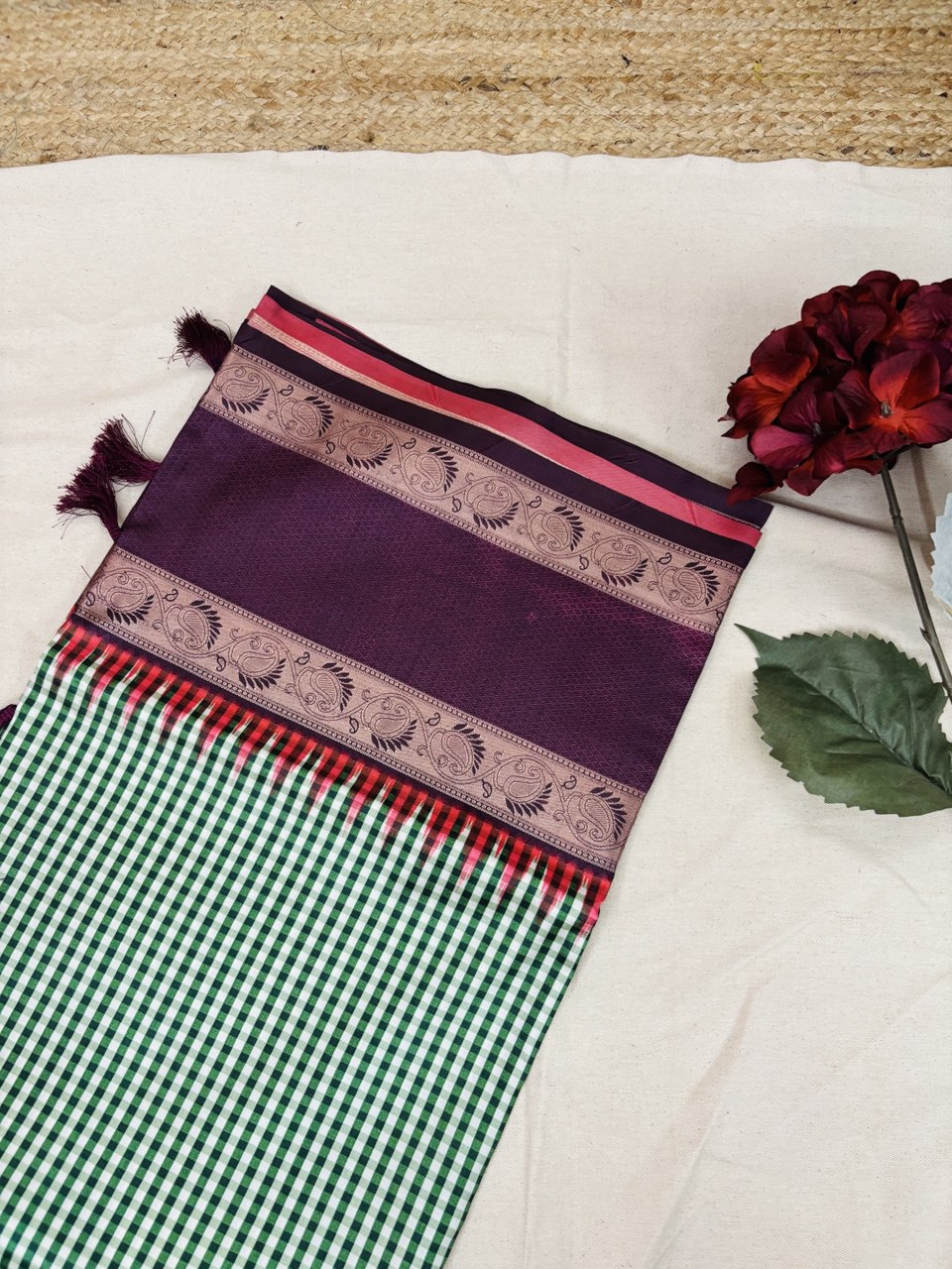 Color :- Green and white check with Dark mauve pink Border
