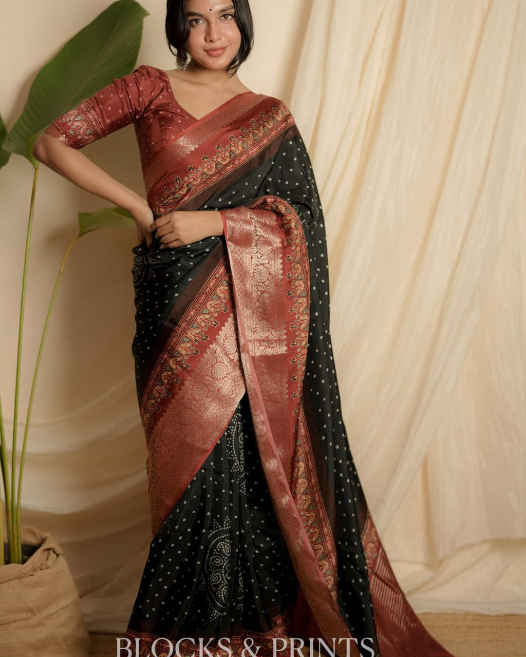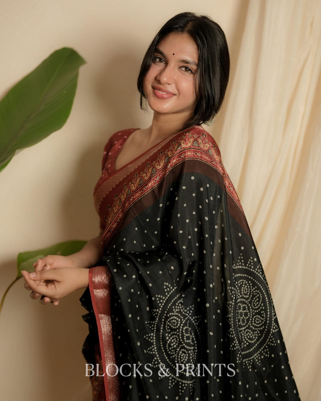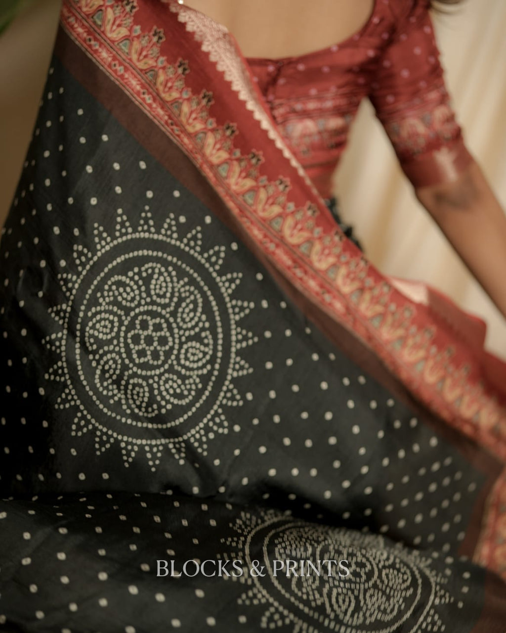 Bandhini Print with Ajrakh borders on Woven Dola Silk Saree. Woven Zeri Border. Tassels at the End of the Border. (Running Blouse.)