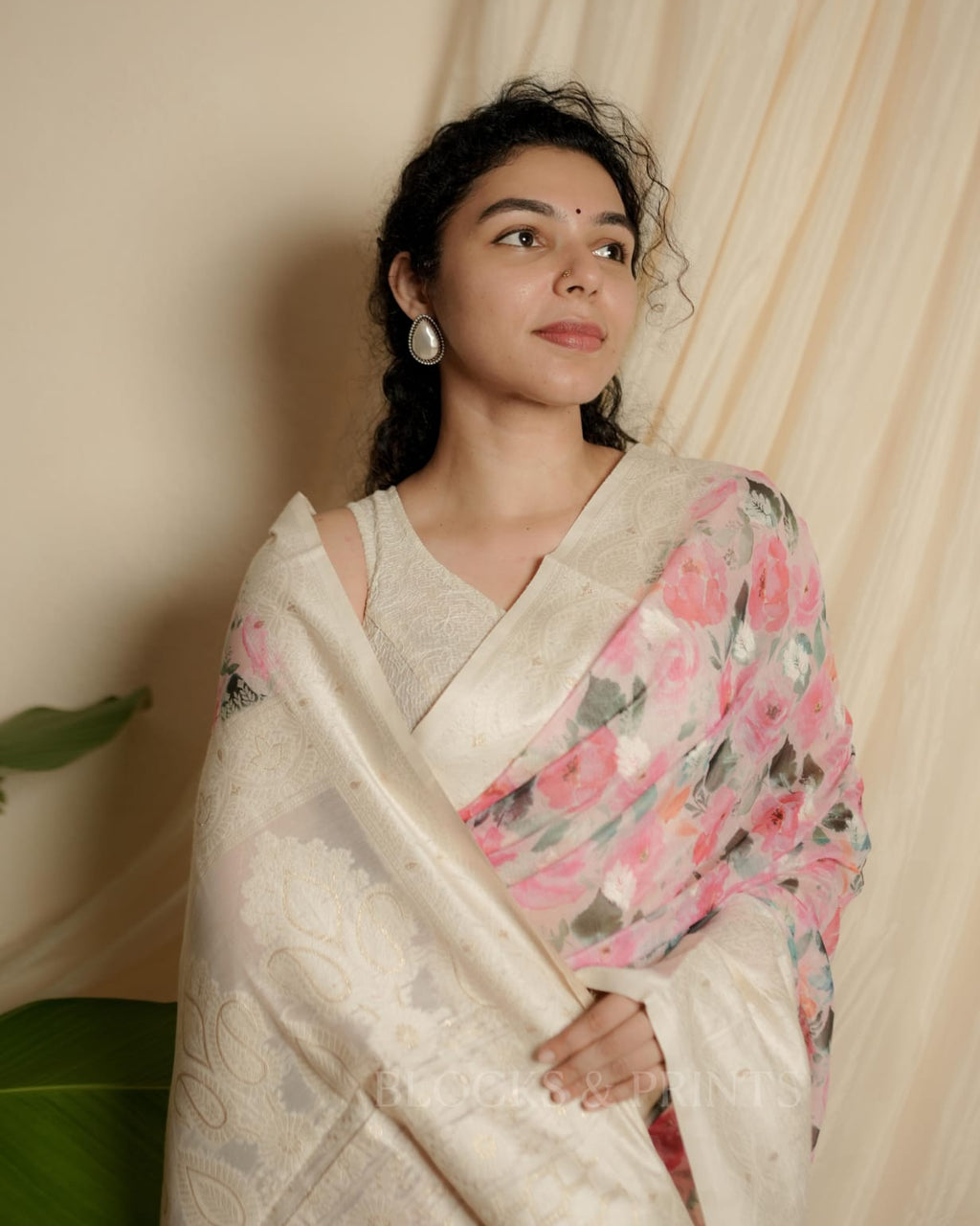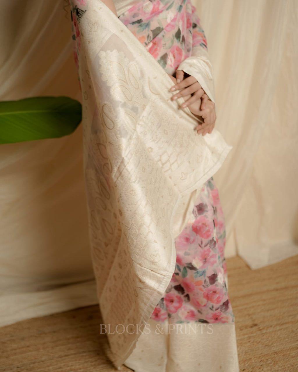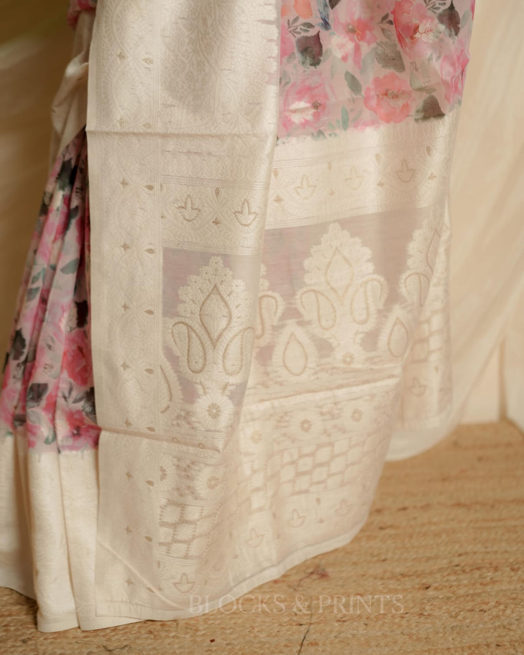 Pure Chanderi Silk Floral Printed Saree with Jamdani Woven Borders and Pallu.