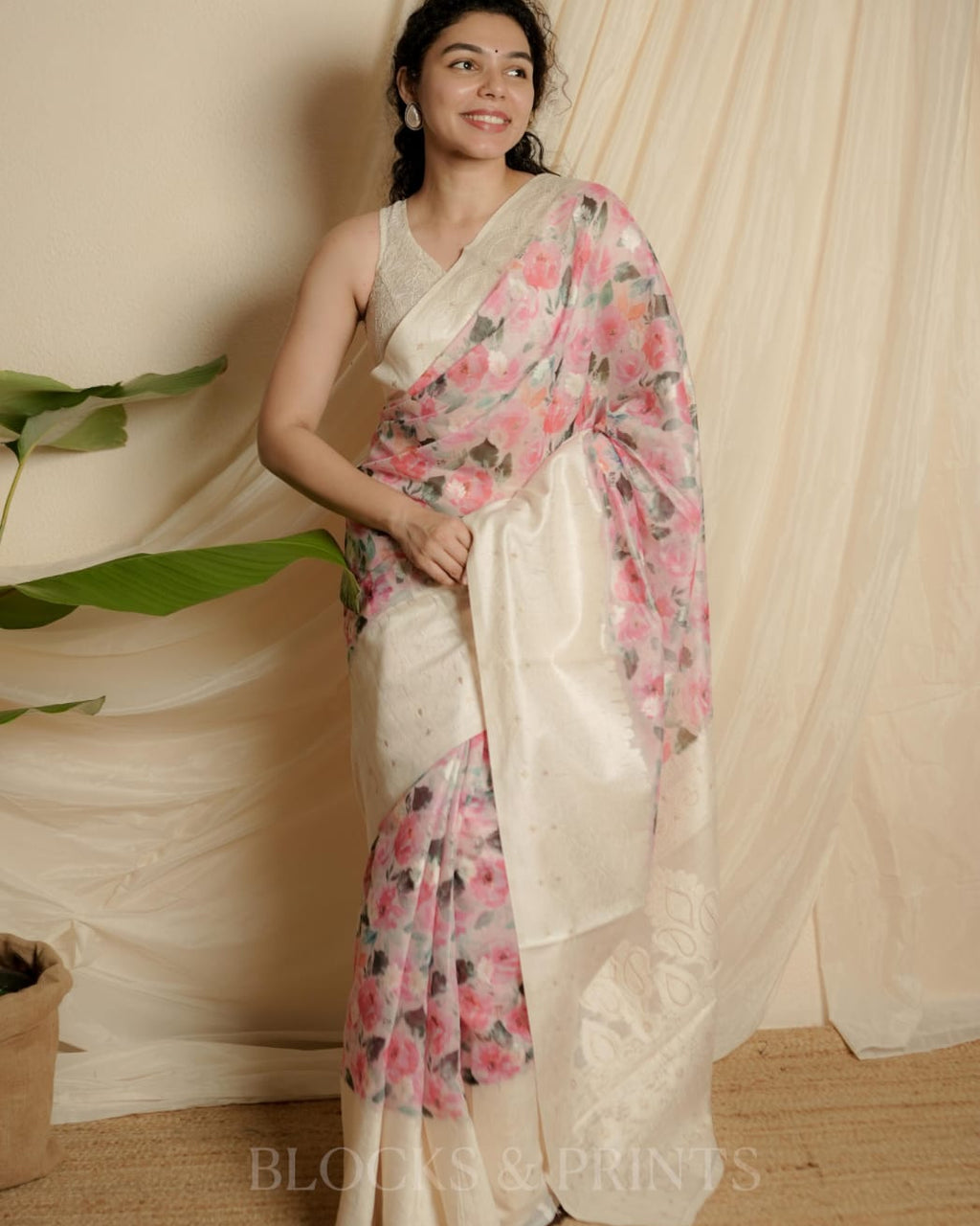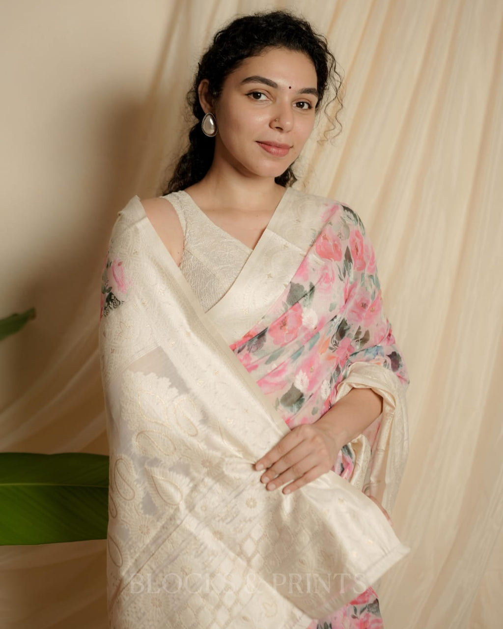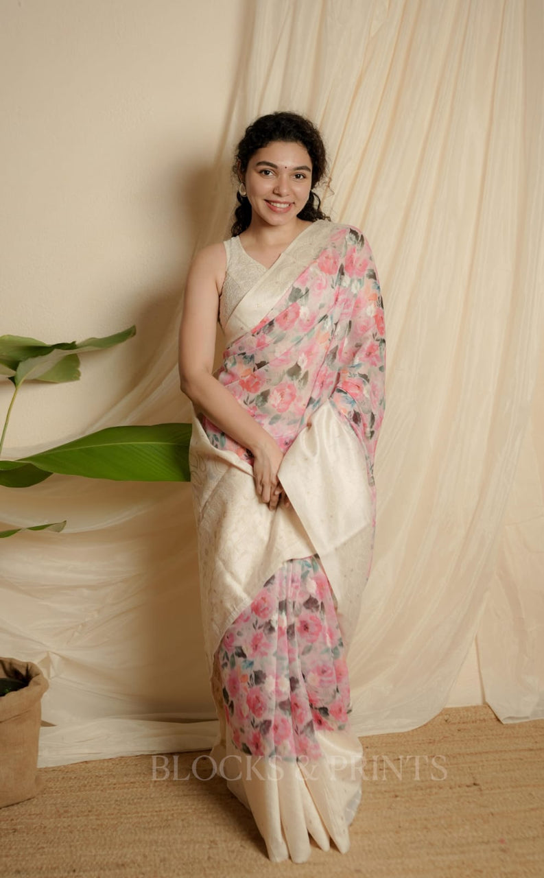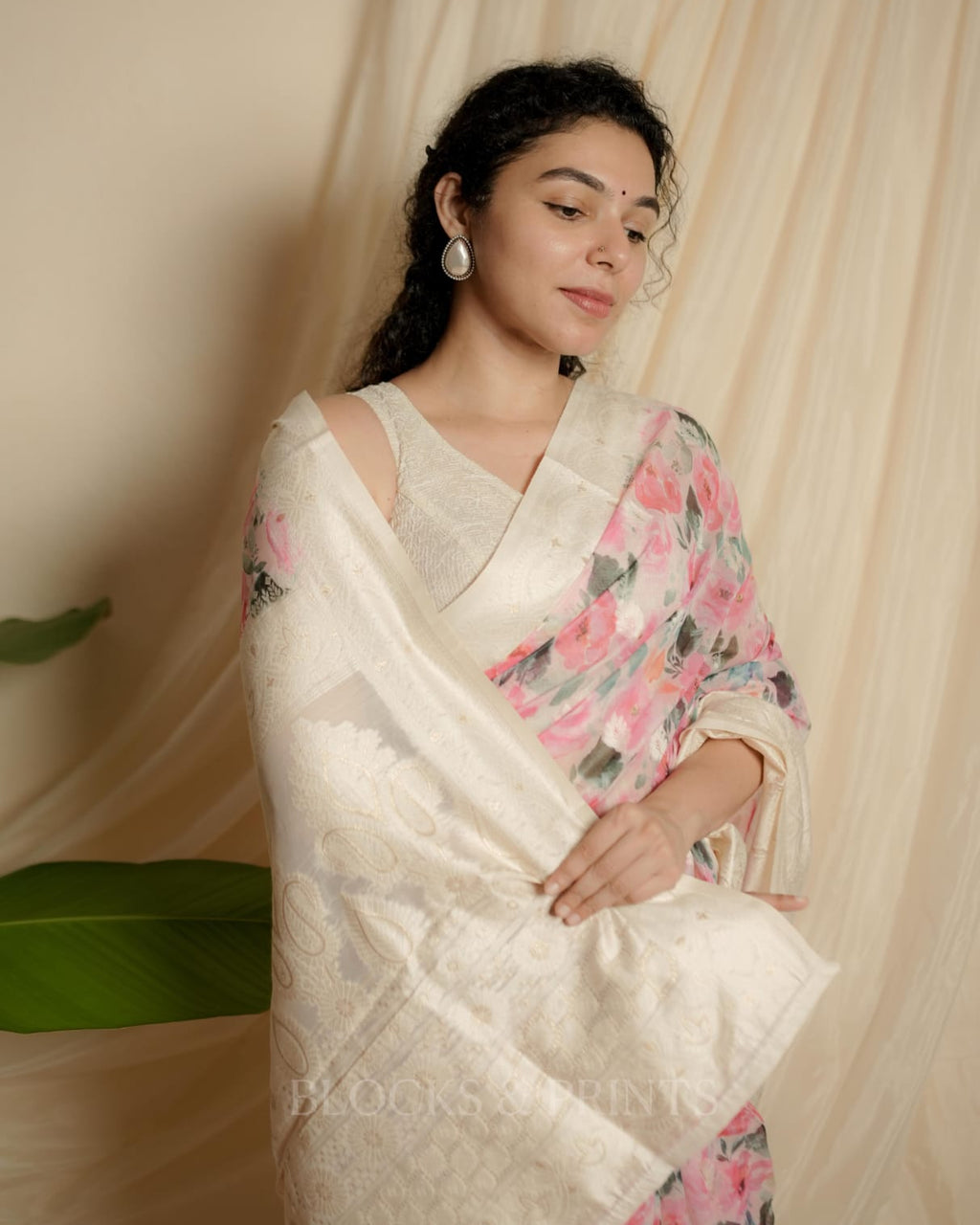Pure Chanderi Silk Floral Printed Saree with Jamdani Woven Borders and Pallu.