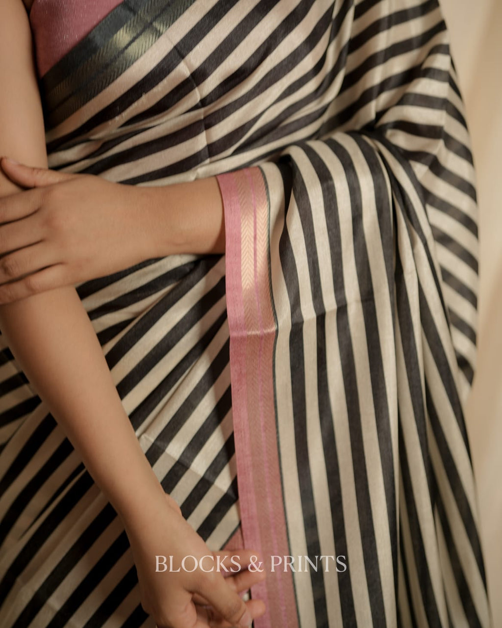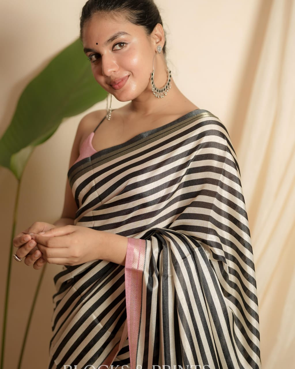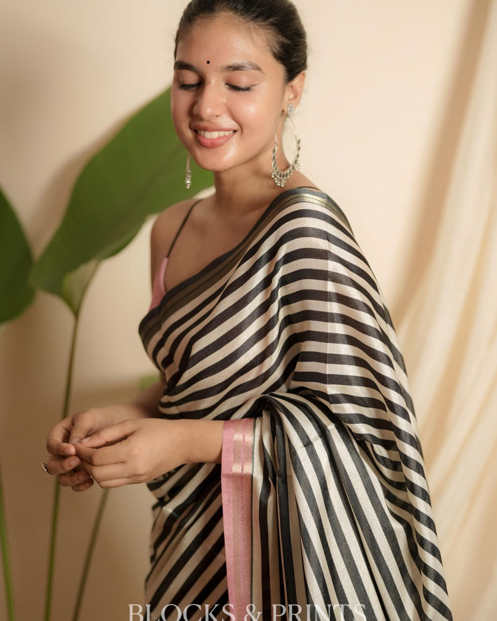 Designer printed semi Silk Saree with Zeri Border. Tassels on the pallu.