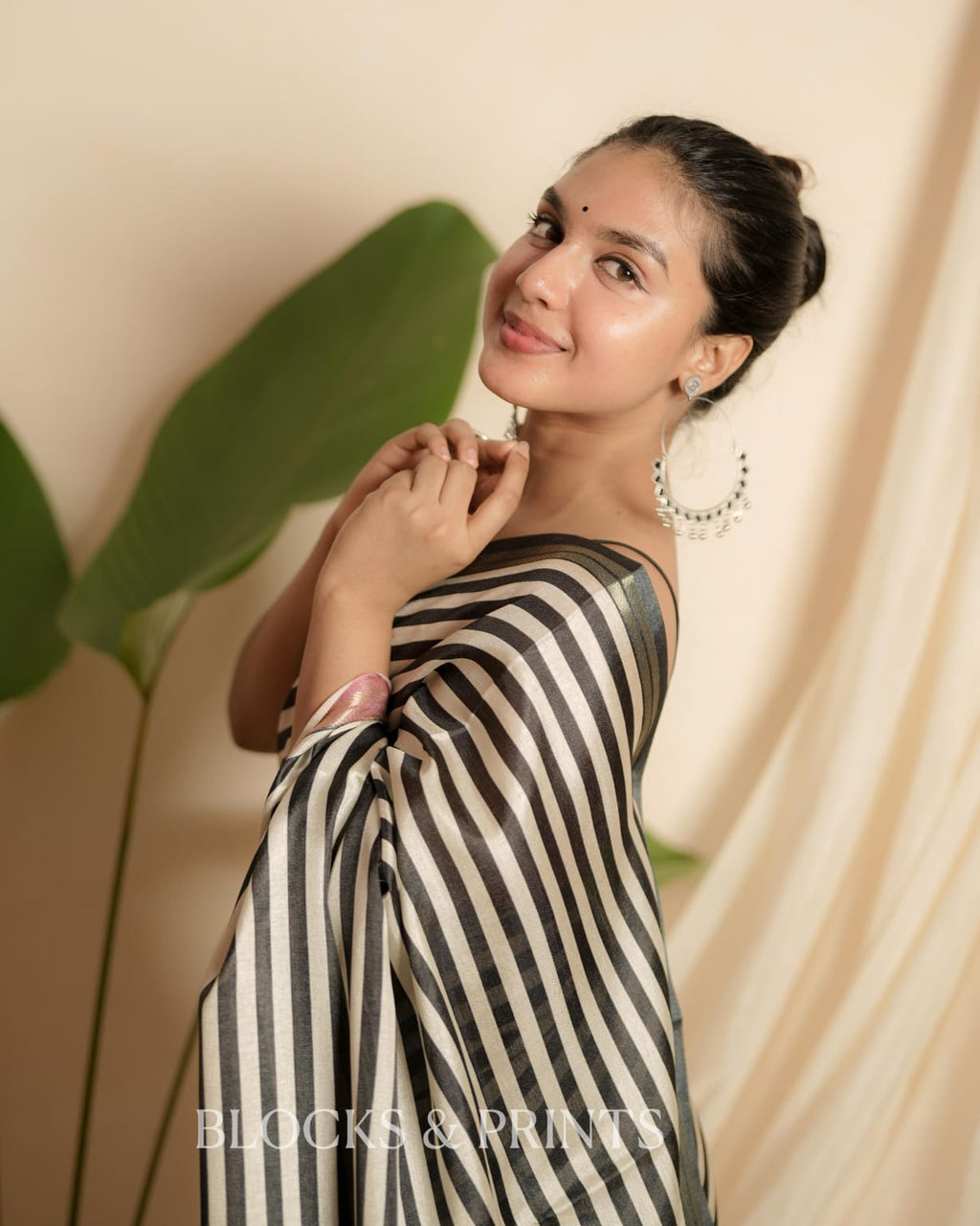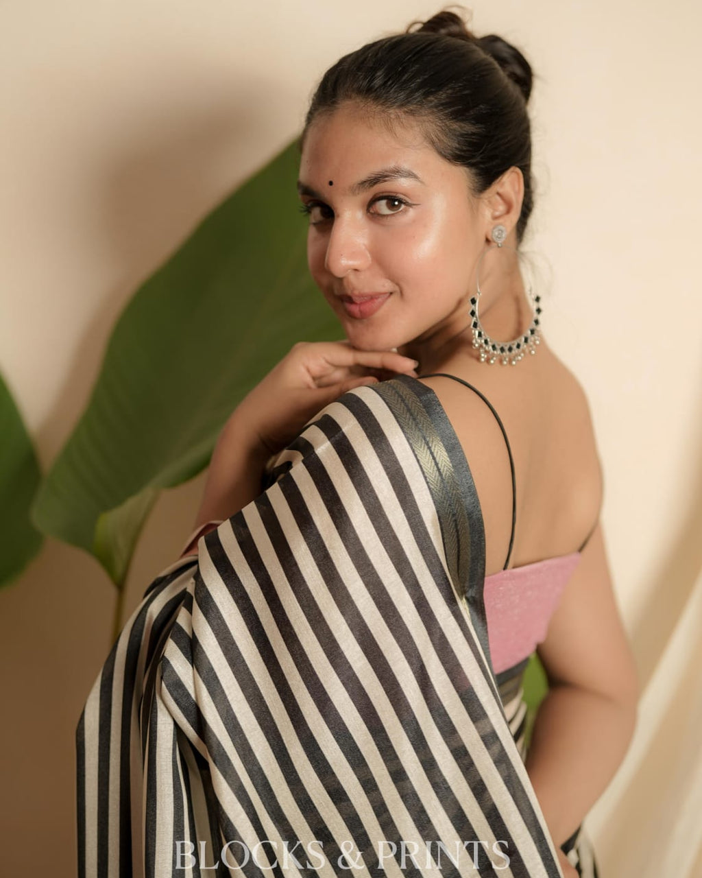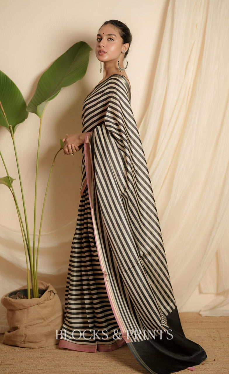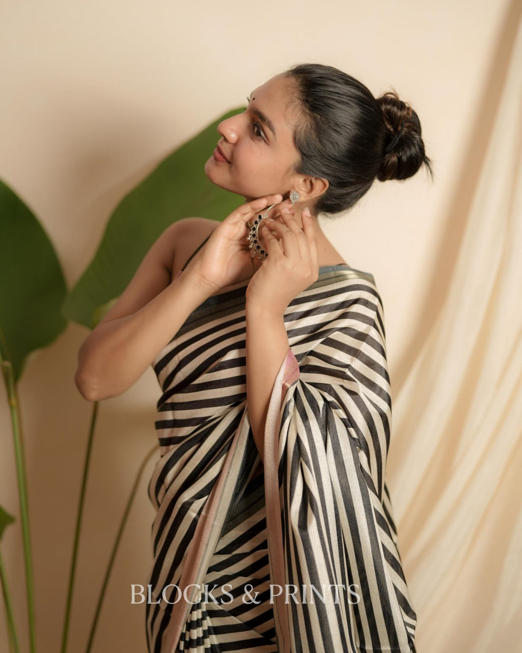Designer printed semi Silk Saree with Zeri Border. Tassels on the pallu.