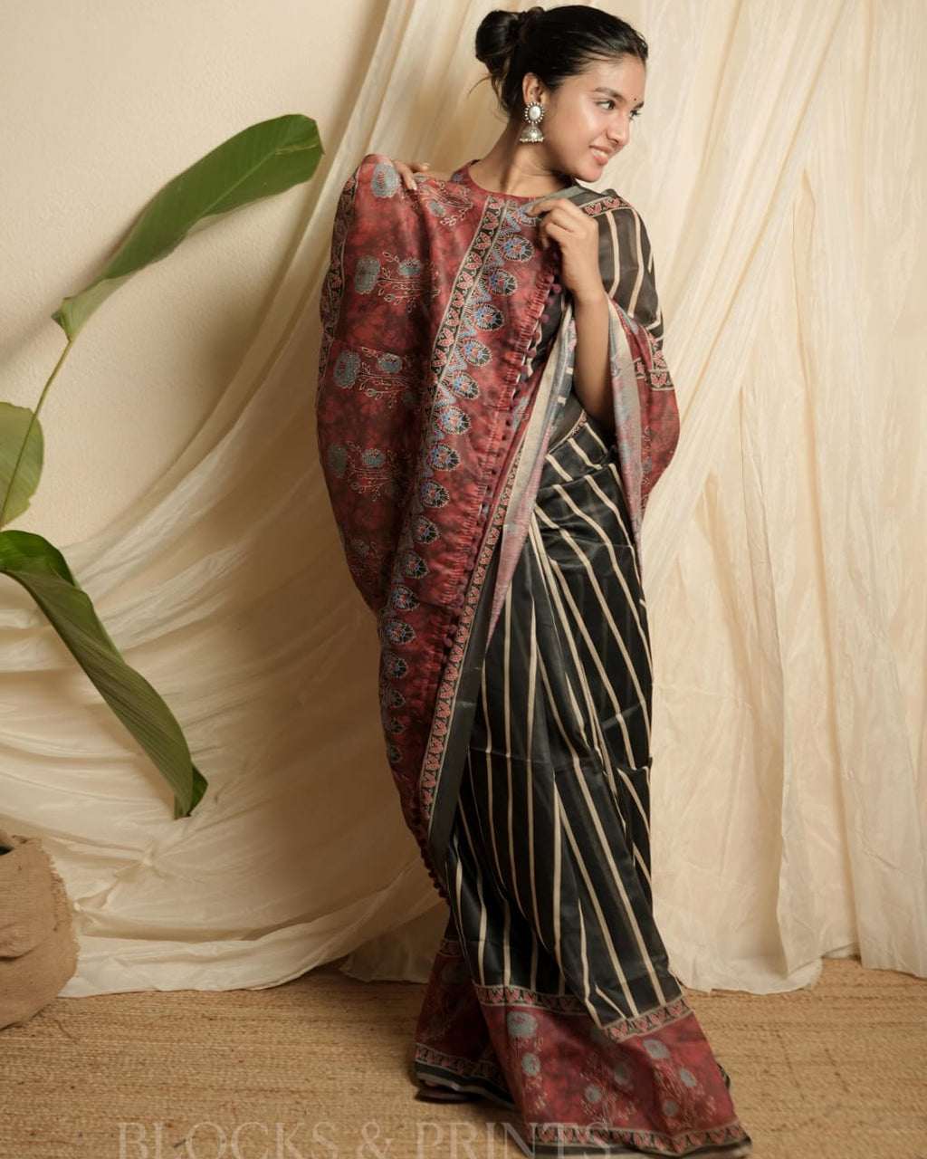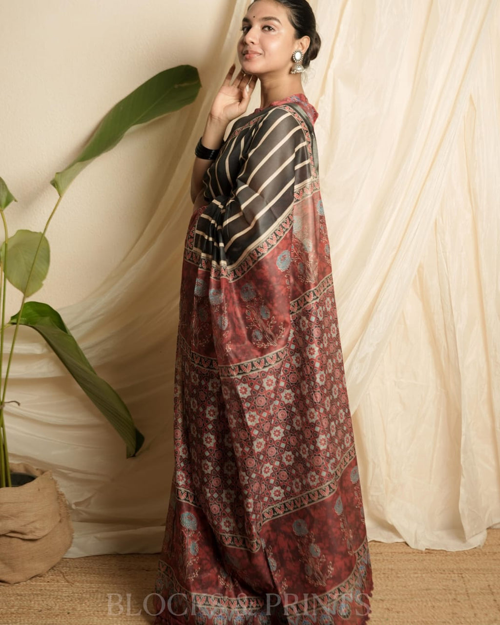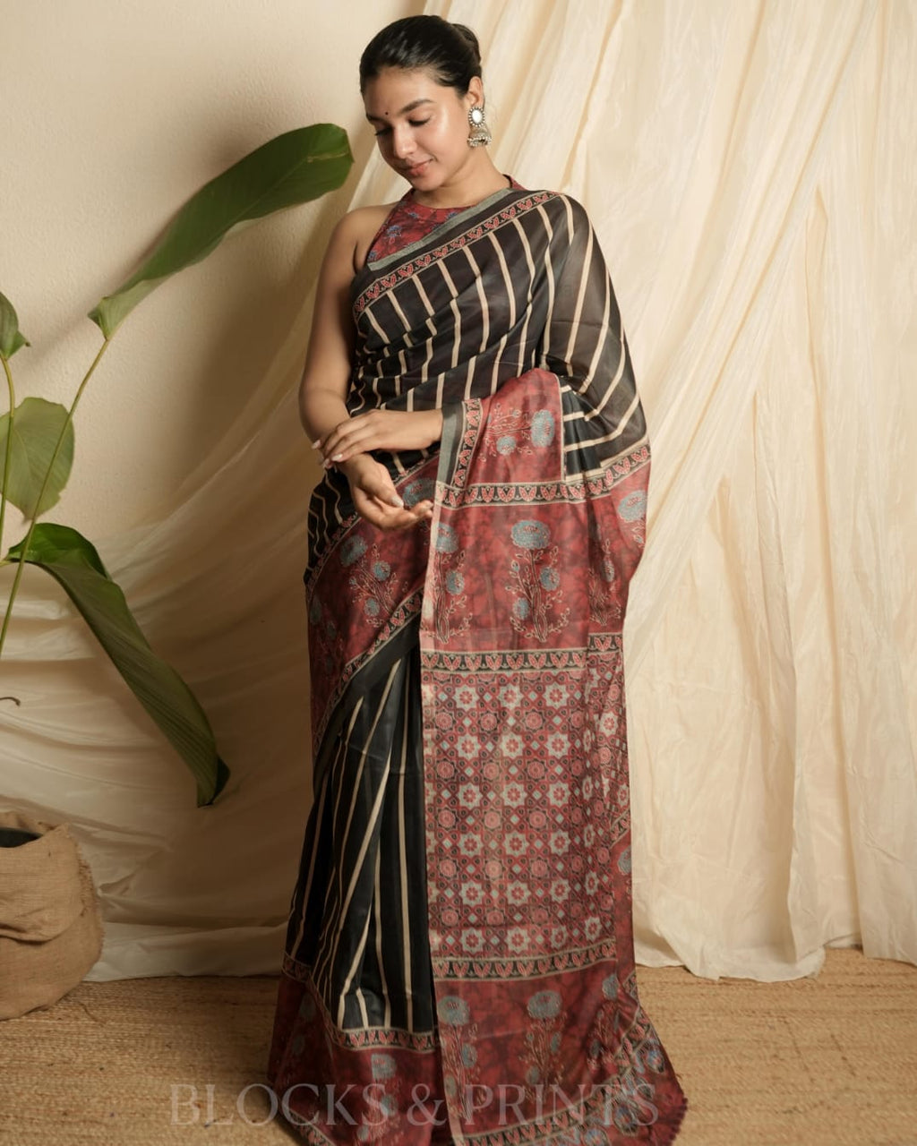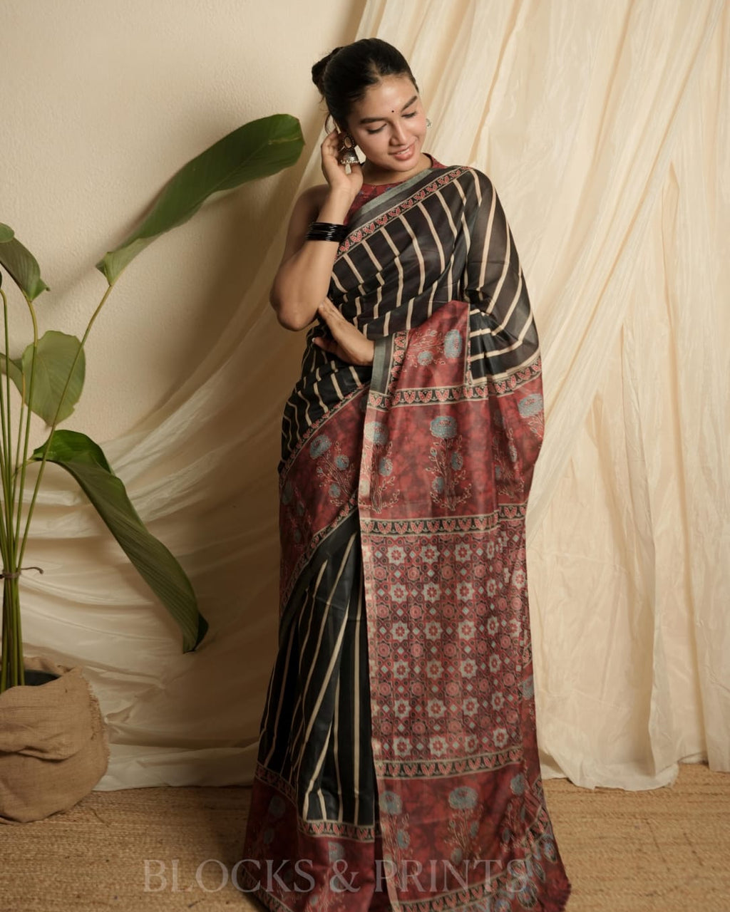 Designer Printed Chanderi Silk Saree with Floral print at the border and Ajrakh print at the pallu.