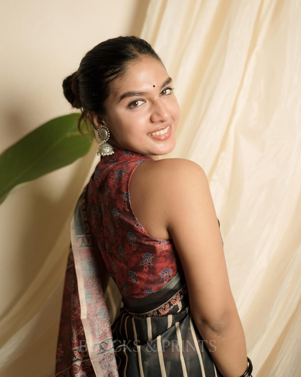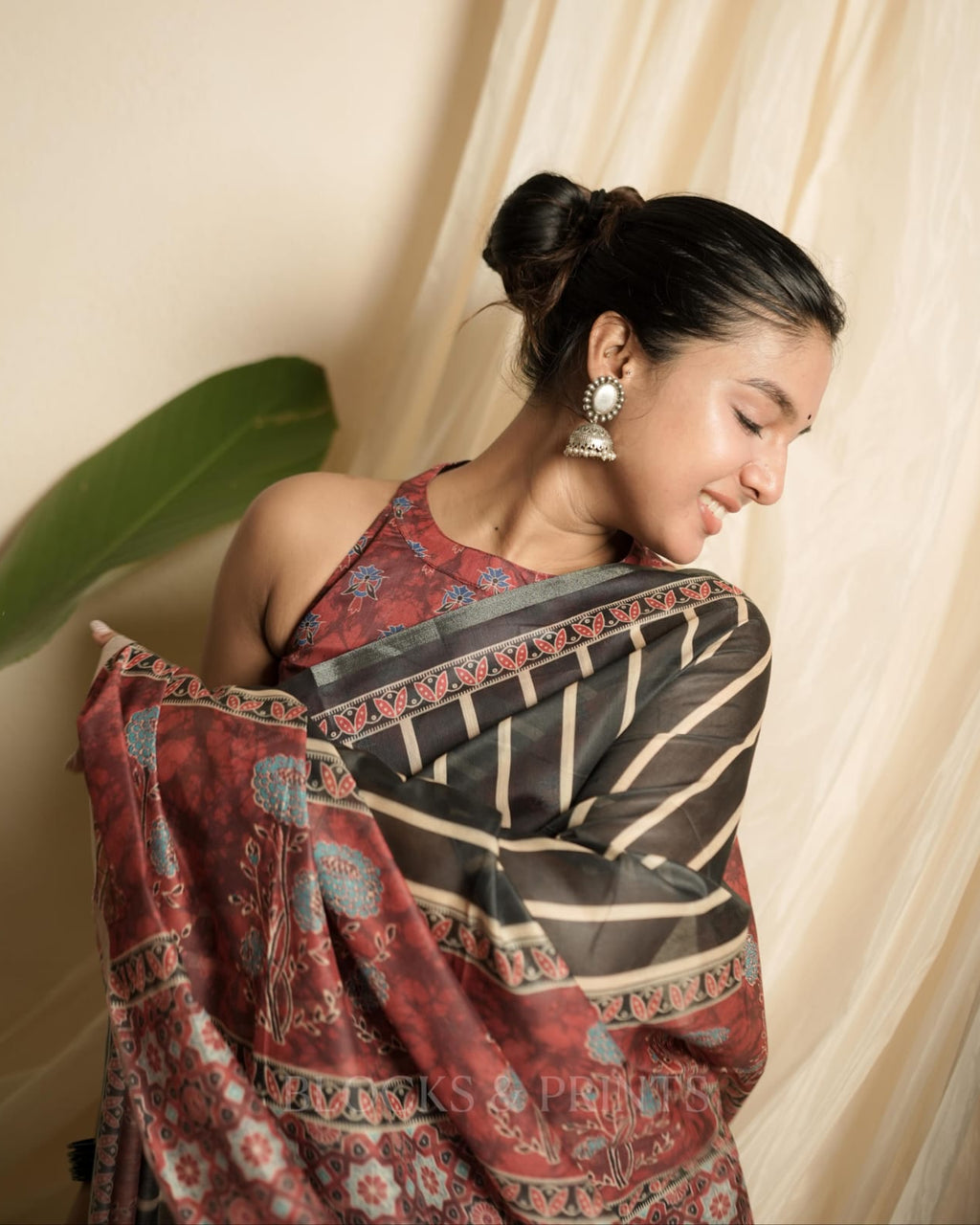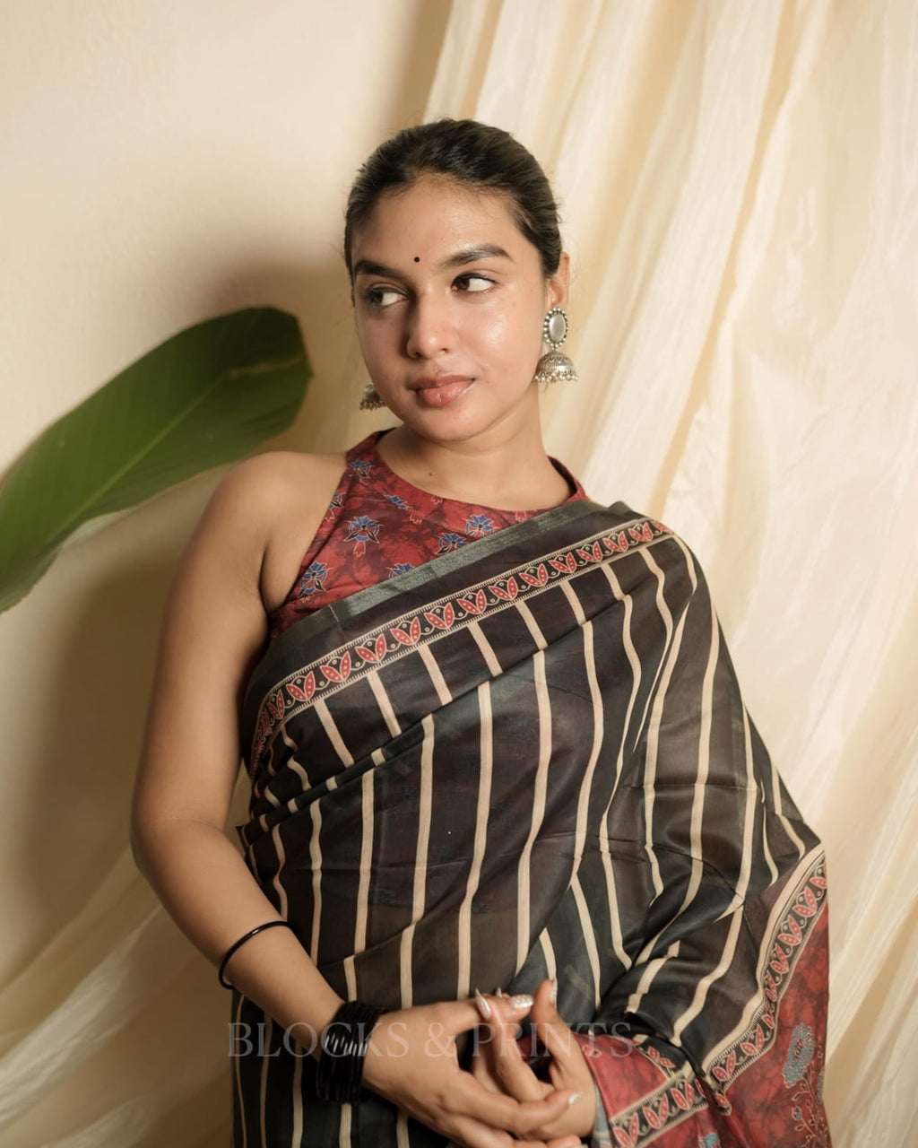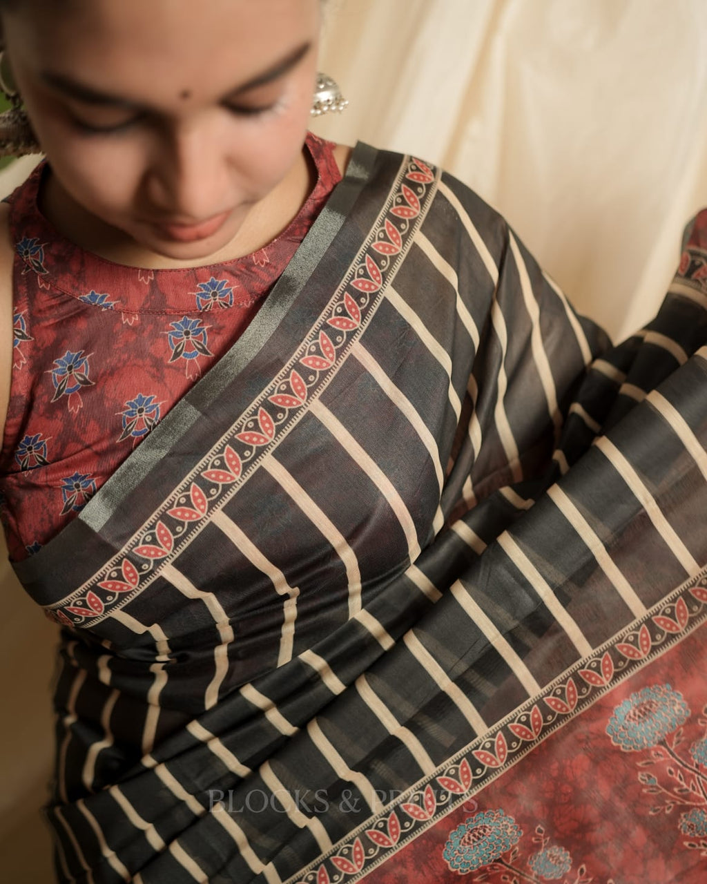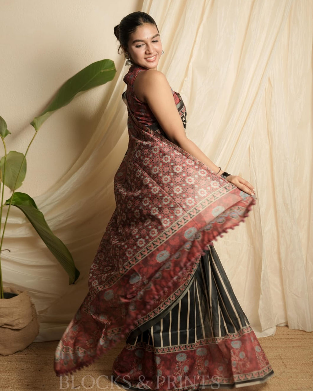 Designer Printed Chanderi Silk Saree with Floral print at the border and Ajrakh print at the pallu.